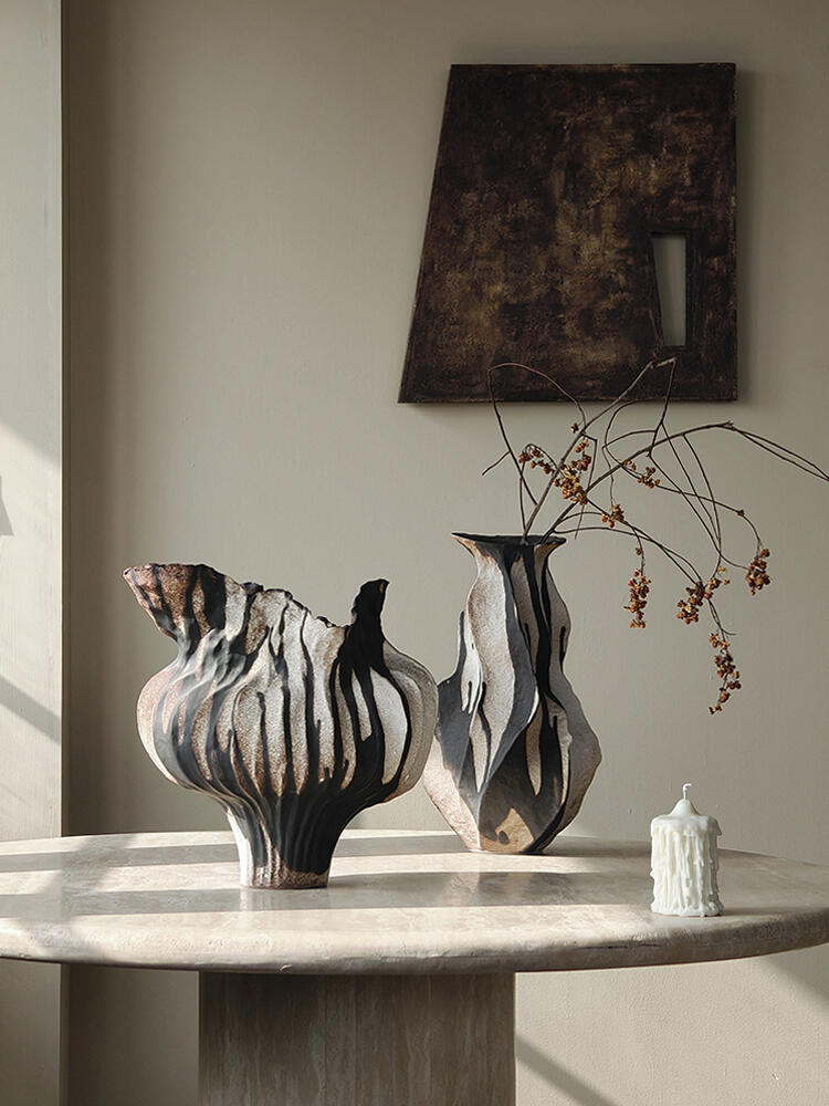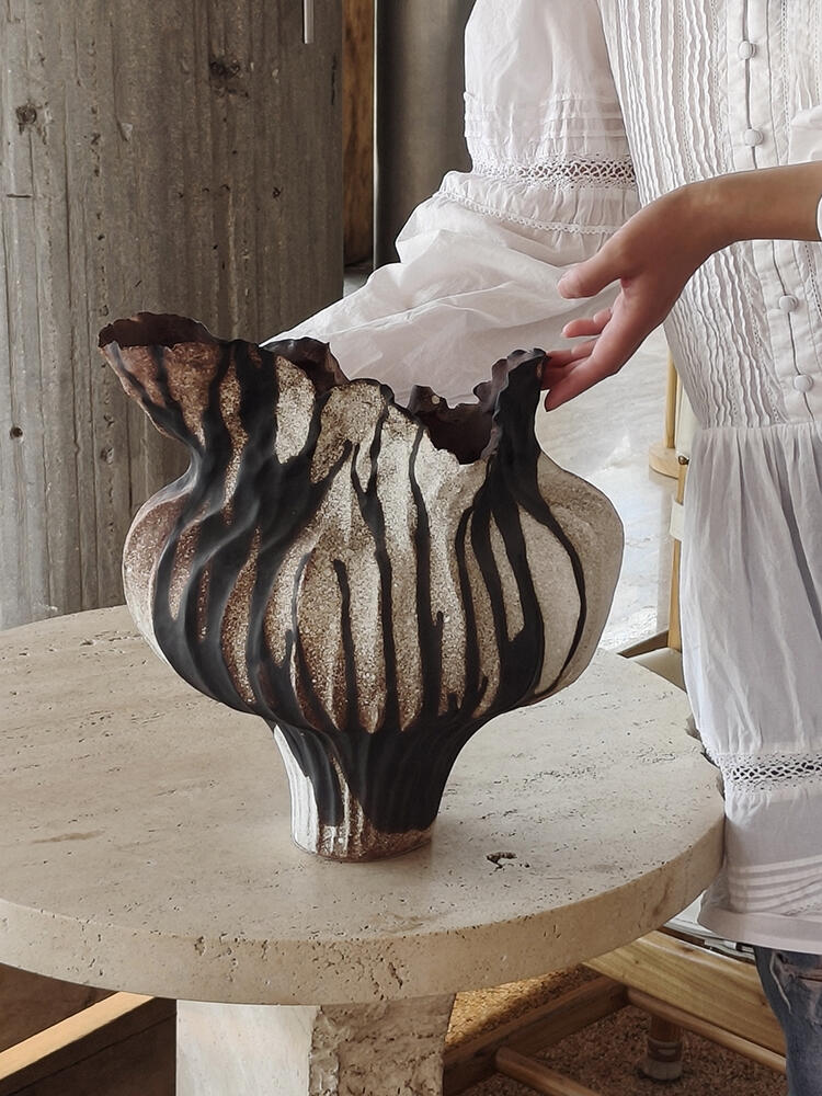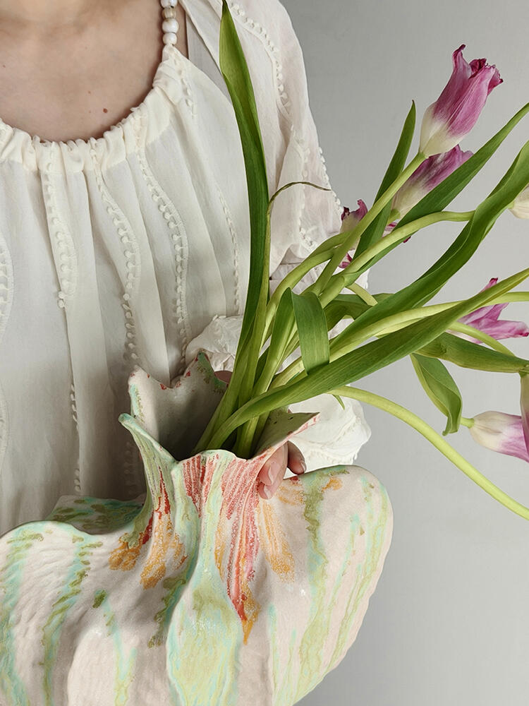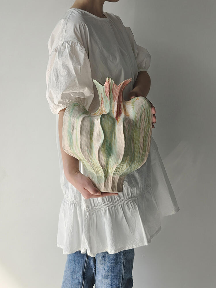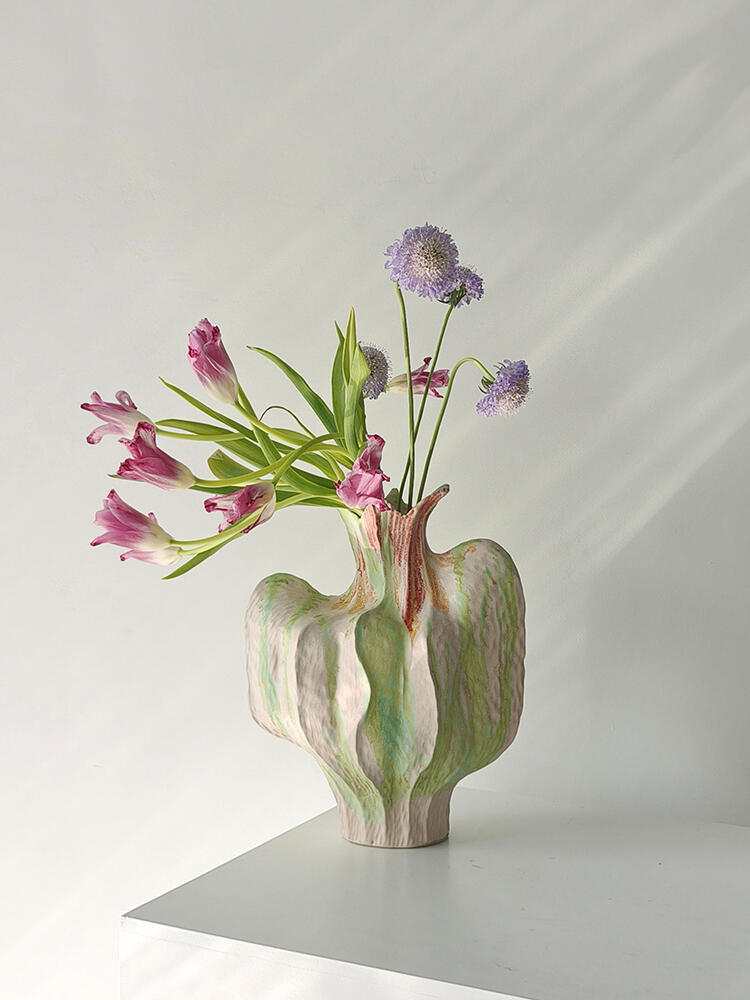 Handcrafted by ceramic artist YUANYUAN, this vase is an homage to the dreamlike landscapes of Monet’s Garden. Its sculptural silhouette flows like brushstrokes across a canvas, capturing the sensation of flowers swaying in light and water reflecting endless hues.