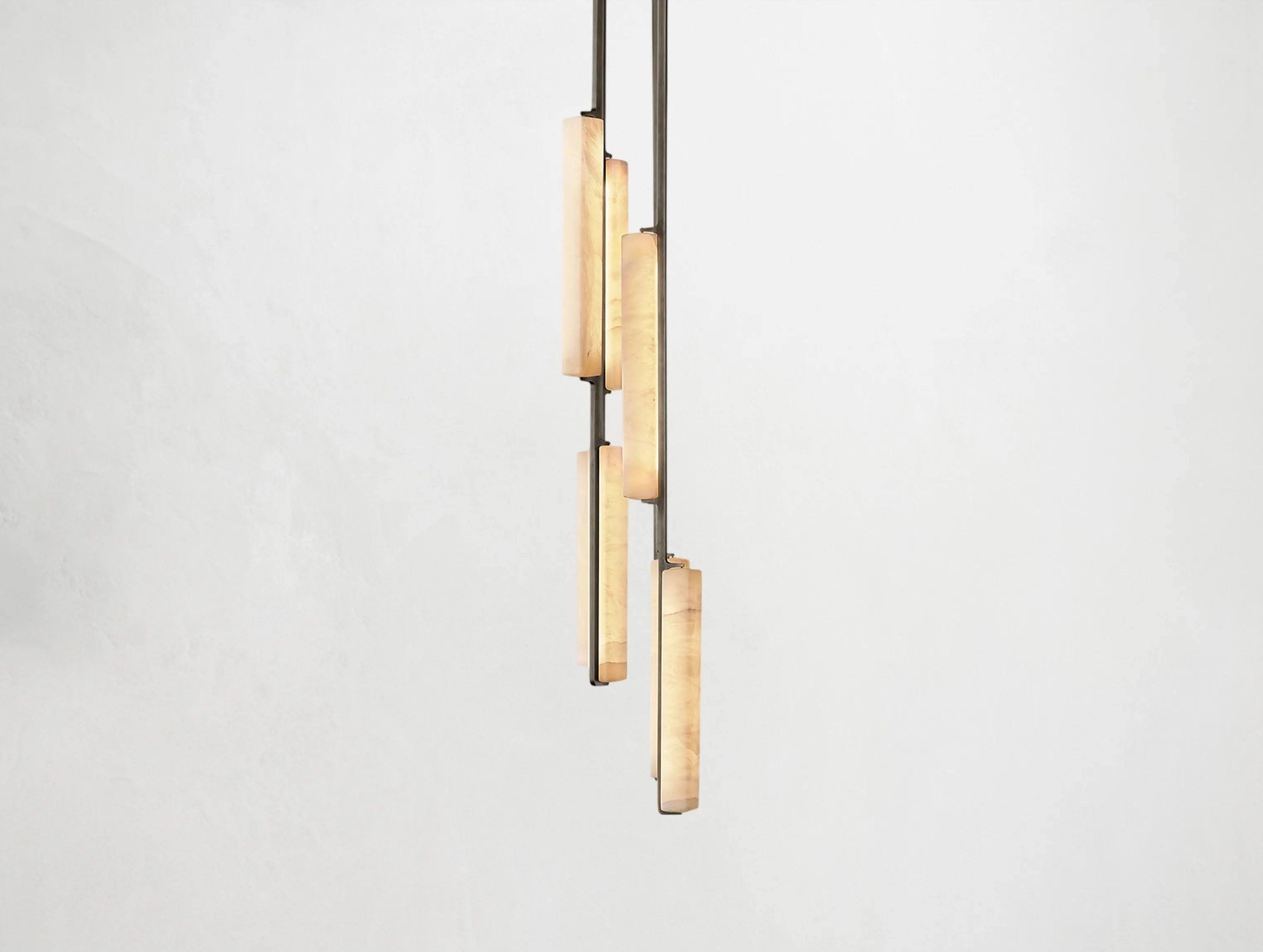 Sculptural and serene. The Ardubon Alabaster Linear Chandelier features ten elongated alabaster prisms suspended in perfect vertical rhythm along a linear brass frame. Each natural stone element softly diffuses the integrated LED light, casting a gentle, candle-like glow that brings warmth and balance to dining tables, kitchen islands, or long hallways. A modern statement piece with timeless materiality and quiet drama.
