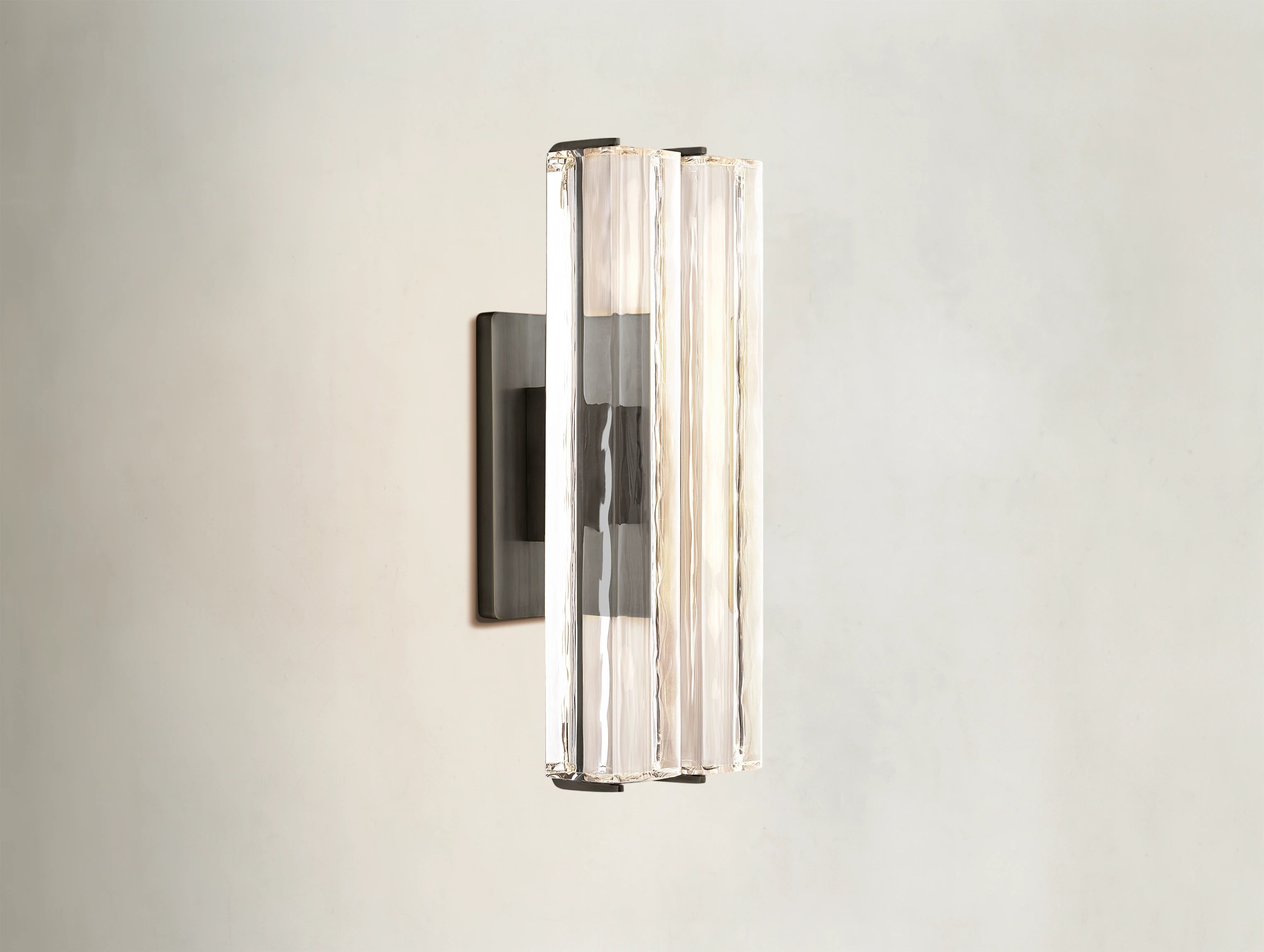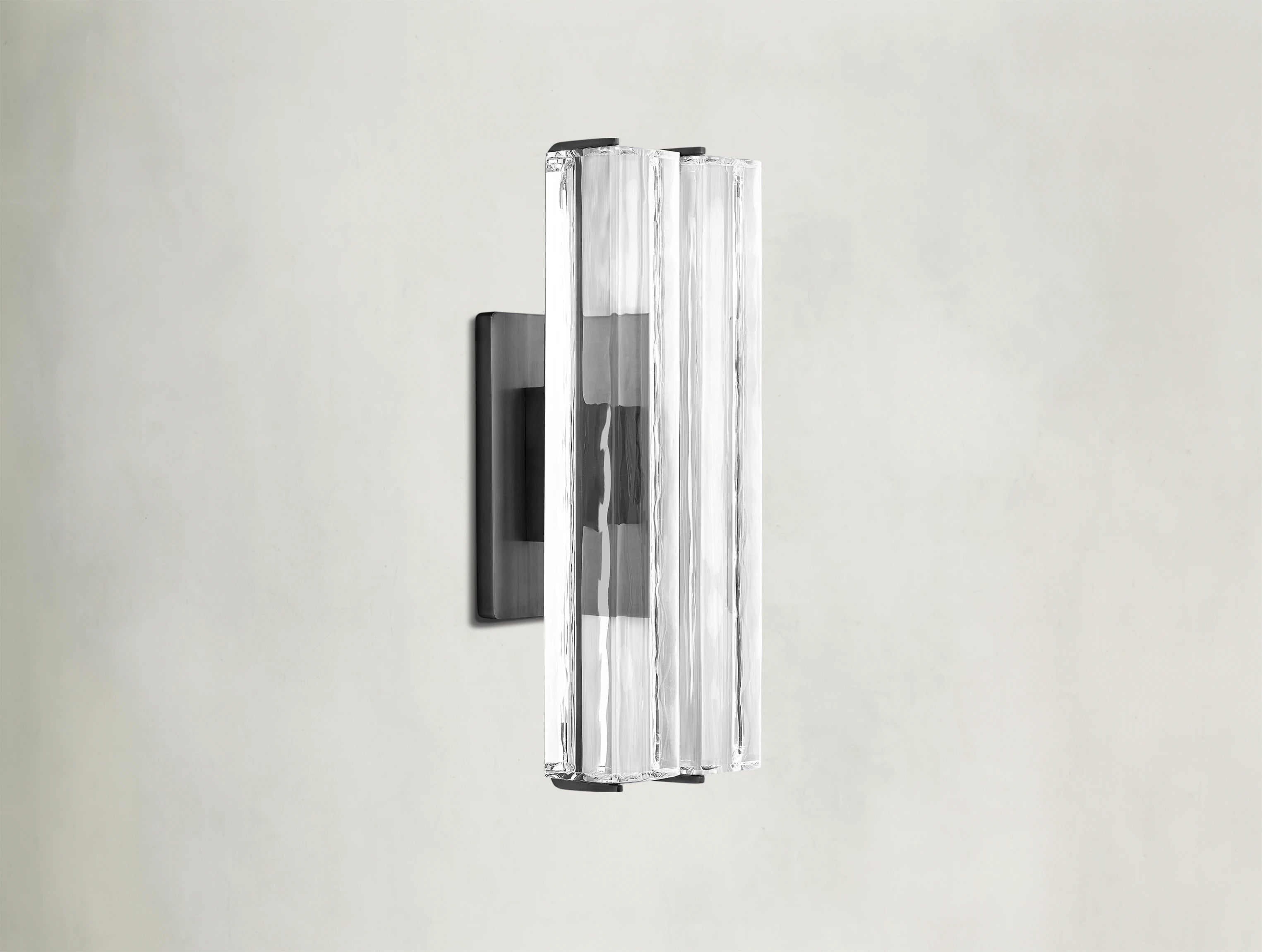A study in restraint and clarity, the Ardubon Crystal Sconce channels the refined elegance of 1960s Italian minimalism. Crafted by Ardenel, it features a prism of hand-polished K9 crystal mounted on a solid brass frame. Light travels through the undulating texture of the crystal, casting a warm, candle-like glow. A sculpted arm extends the form outward, allowing the integrated LED to direct its illumination precisely where needed. Both luminous and architectural, this piece brings quiet drama to any space.