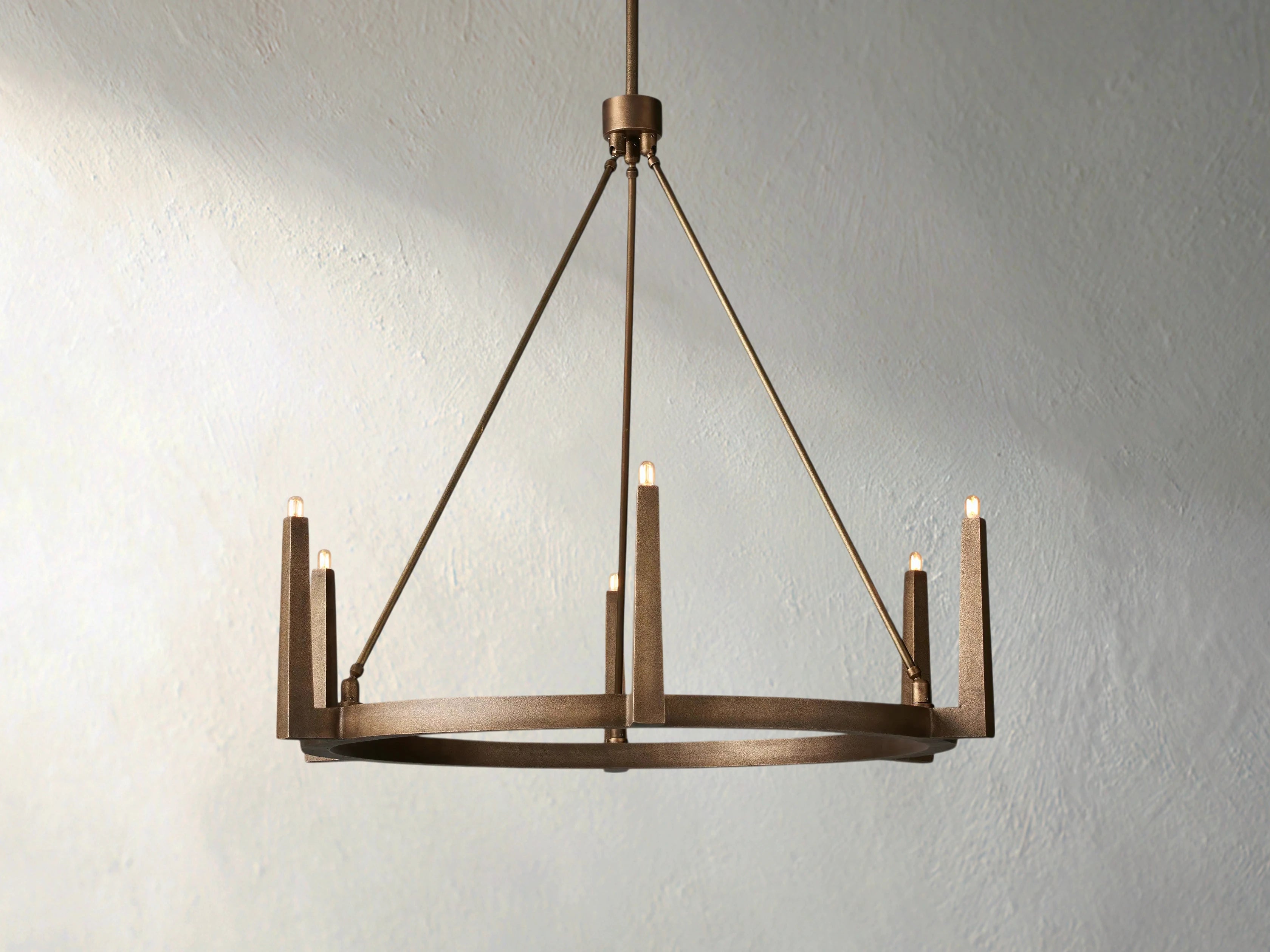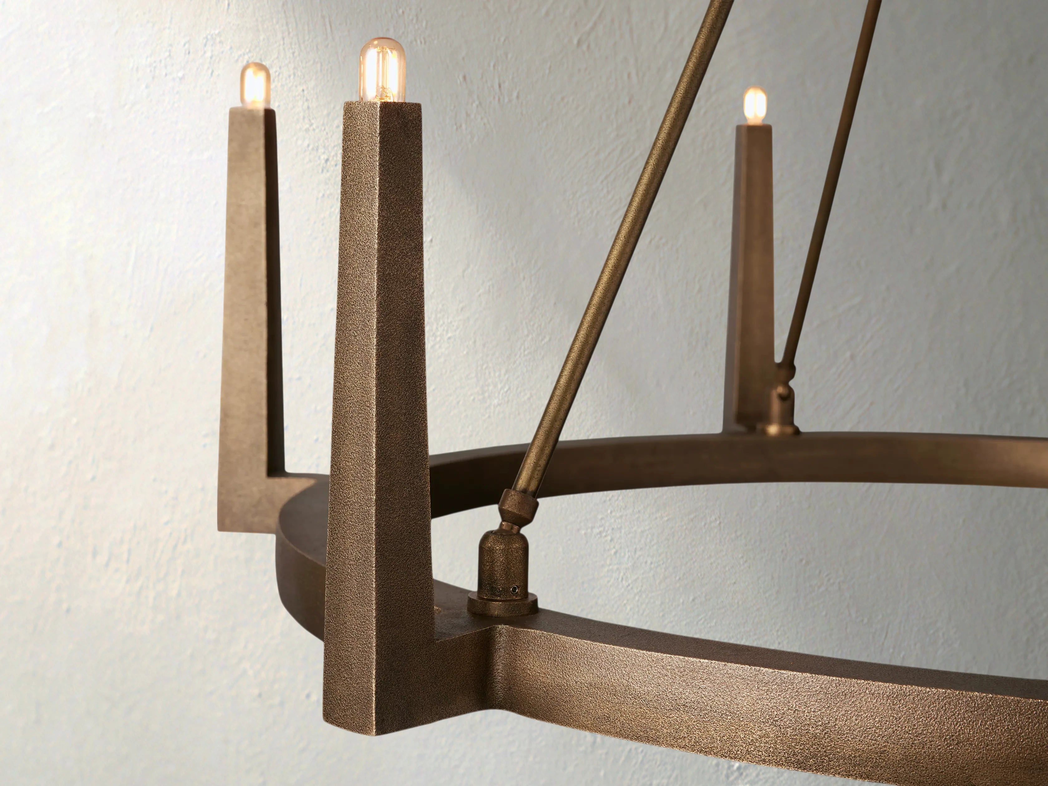 Sculptural and sophisticated, the Voorn Round Chandelier redefines modern lighting with its open, crisscrossed design. Crafted from sand-casted brass by skilled artisans in India, the chandelier’s textural finish—available in antique brass or deep bronze—adds depth and refinement to its clean-lined silhouette. Perfect for creating presence in dining areas, entryways, or living spaces, it delivers bold form with an airy feel. Offered in two sizes and includes bulbs, interchangeable rods, and an extra-long cord for versatile hanging.