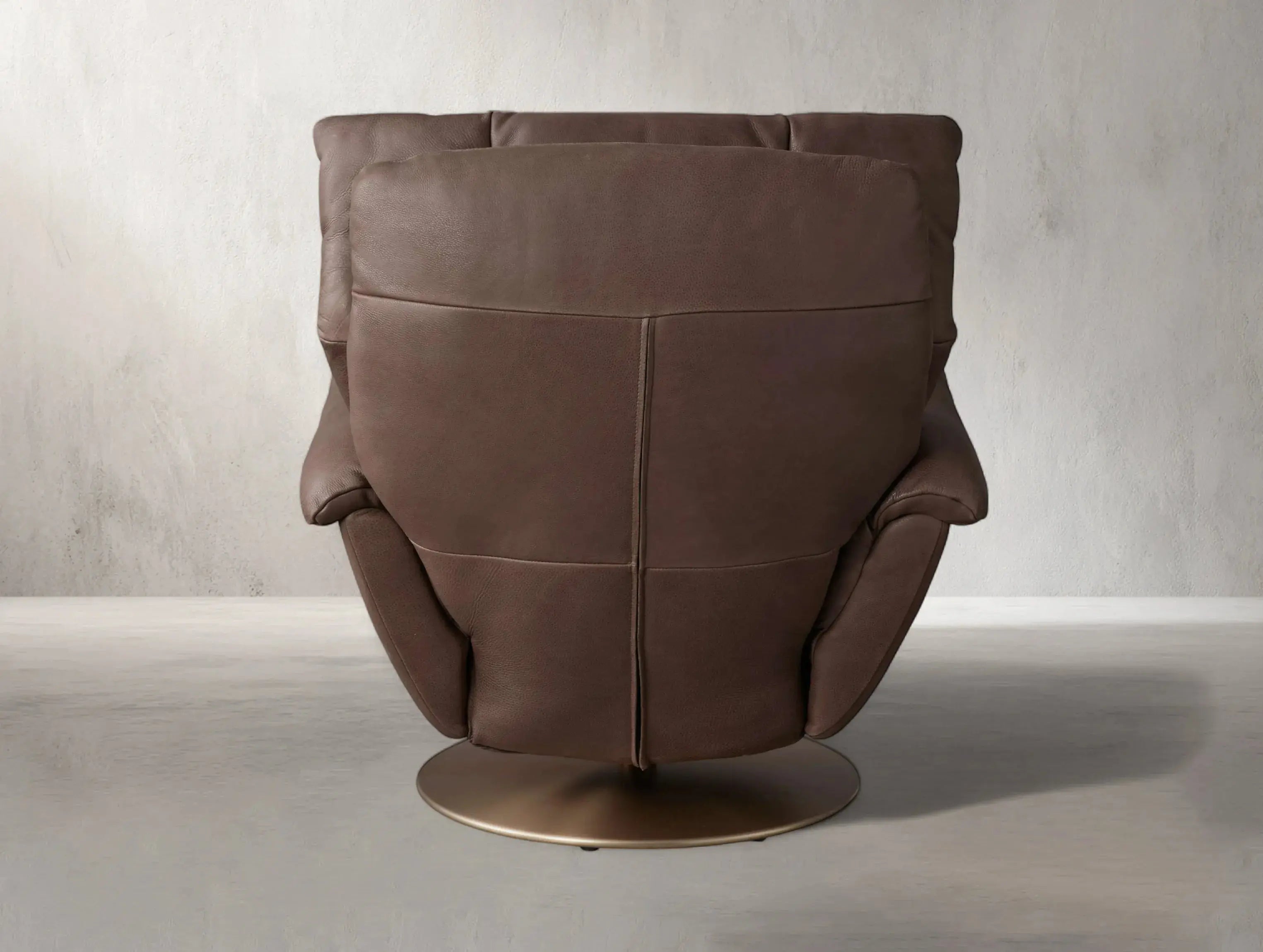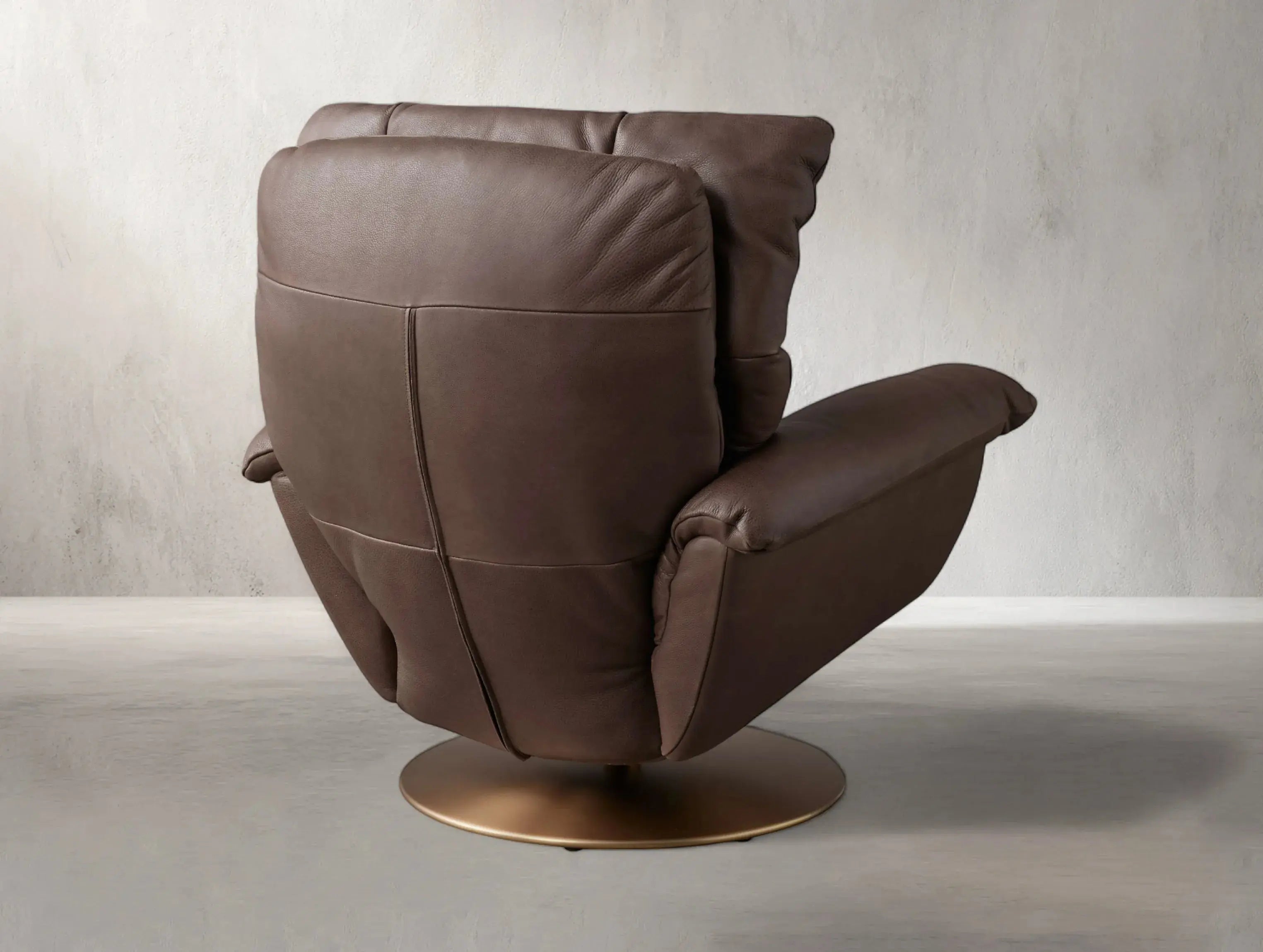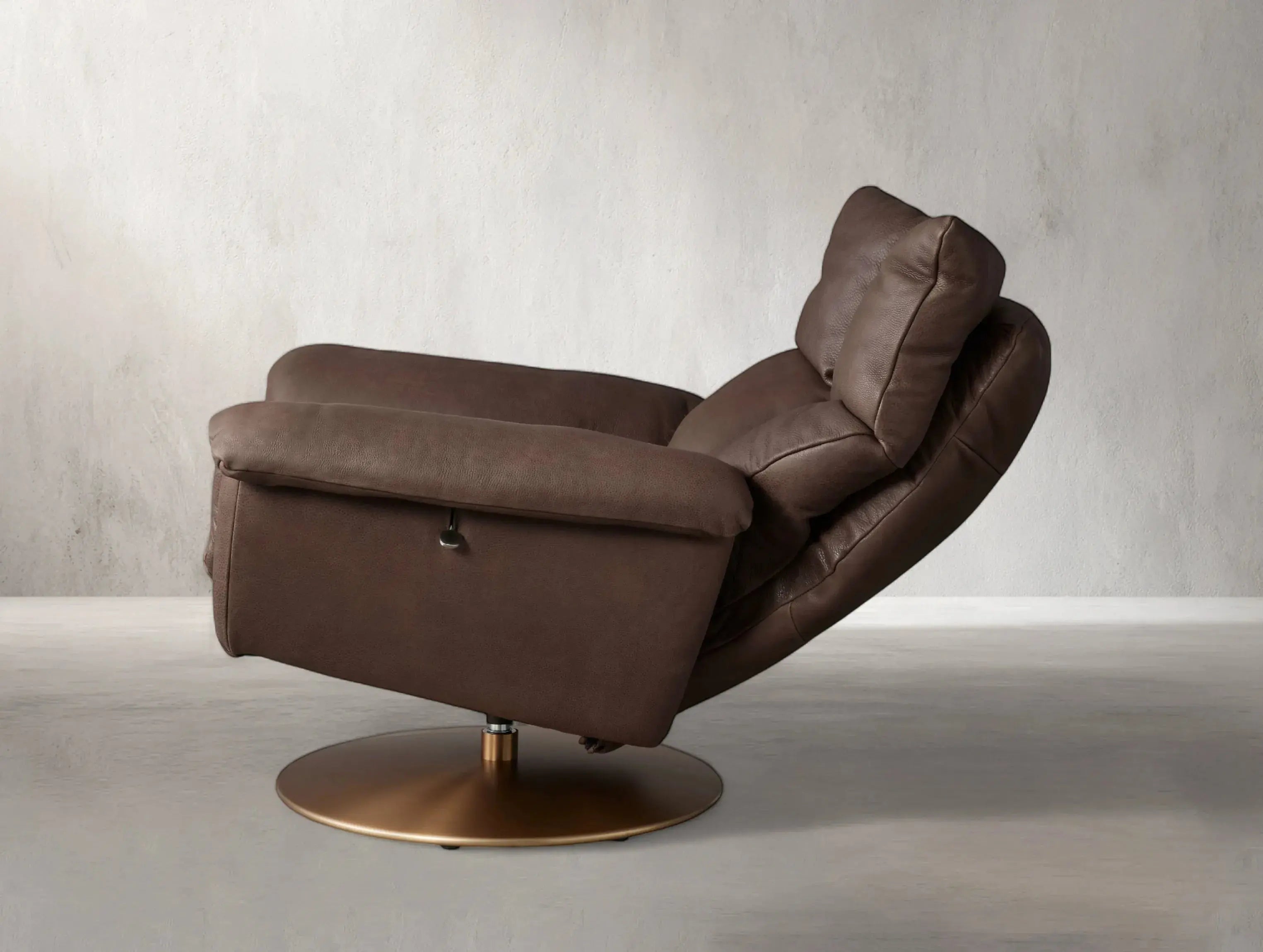 Combining timeless comfort with sleek motion, this leather recliner features a supportive silhouette and smooth 360-degree swivel. Upholstered in supple top-grain leather, it’s grounded by a low-profile steel base and reclines easily with a side lever—making it the perfect balance of form and function.