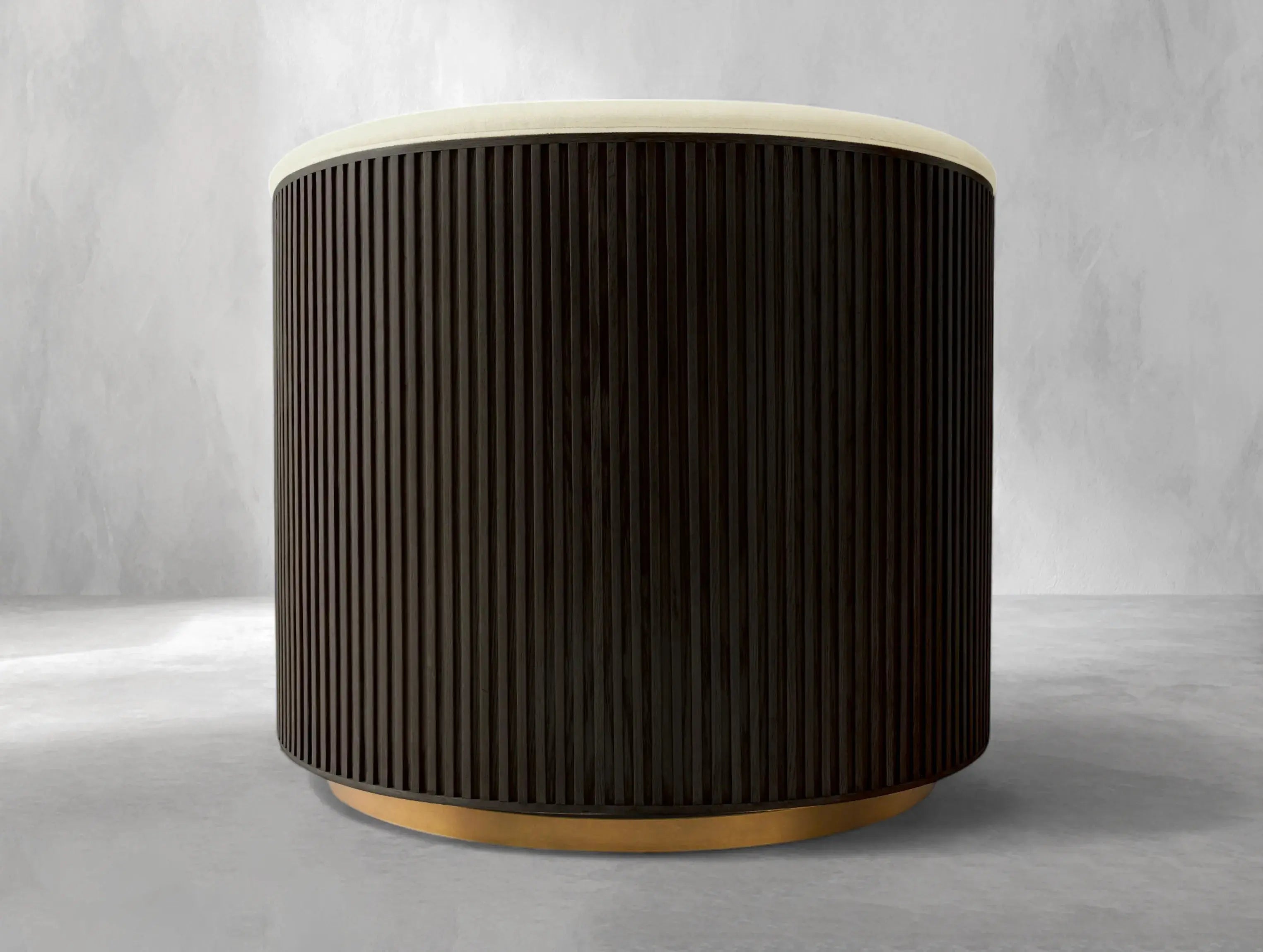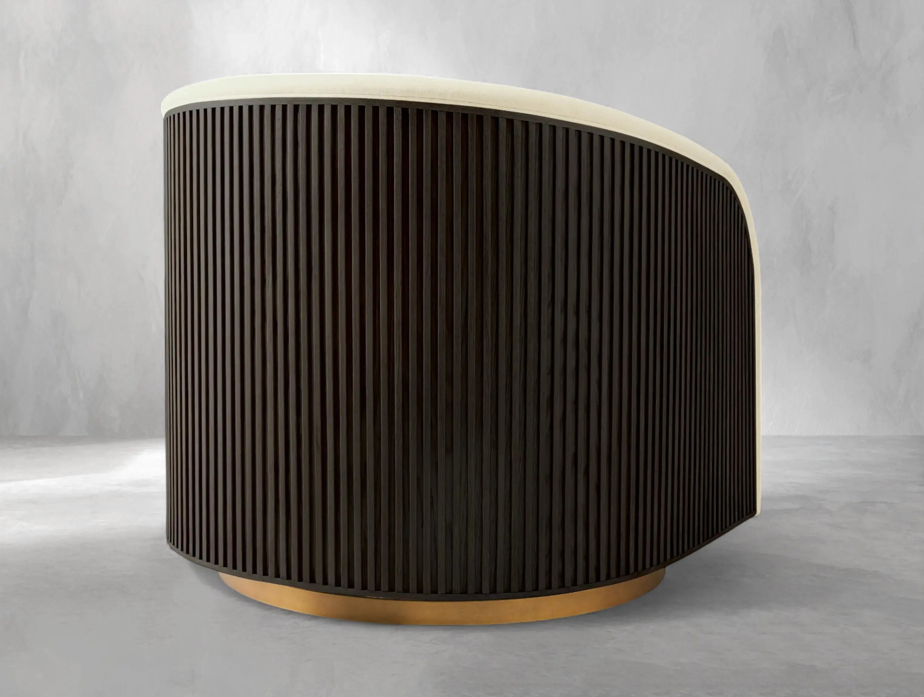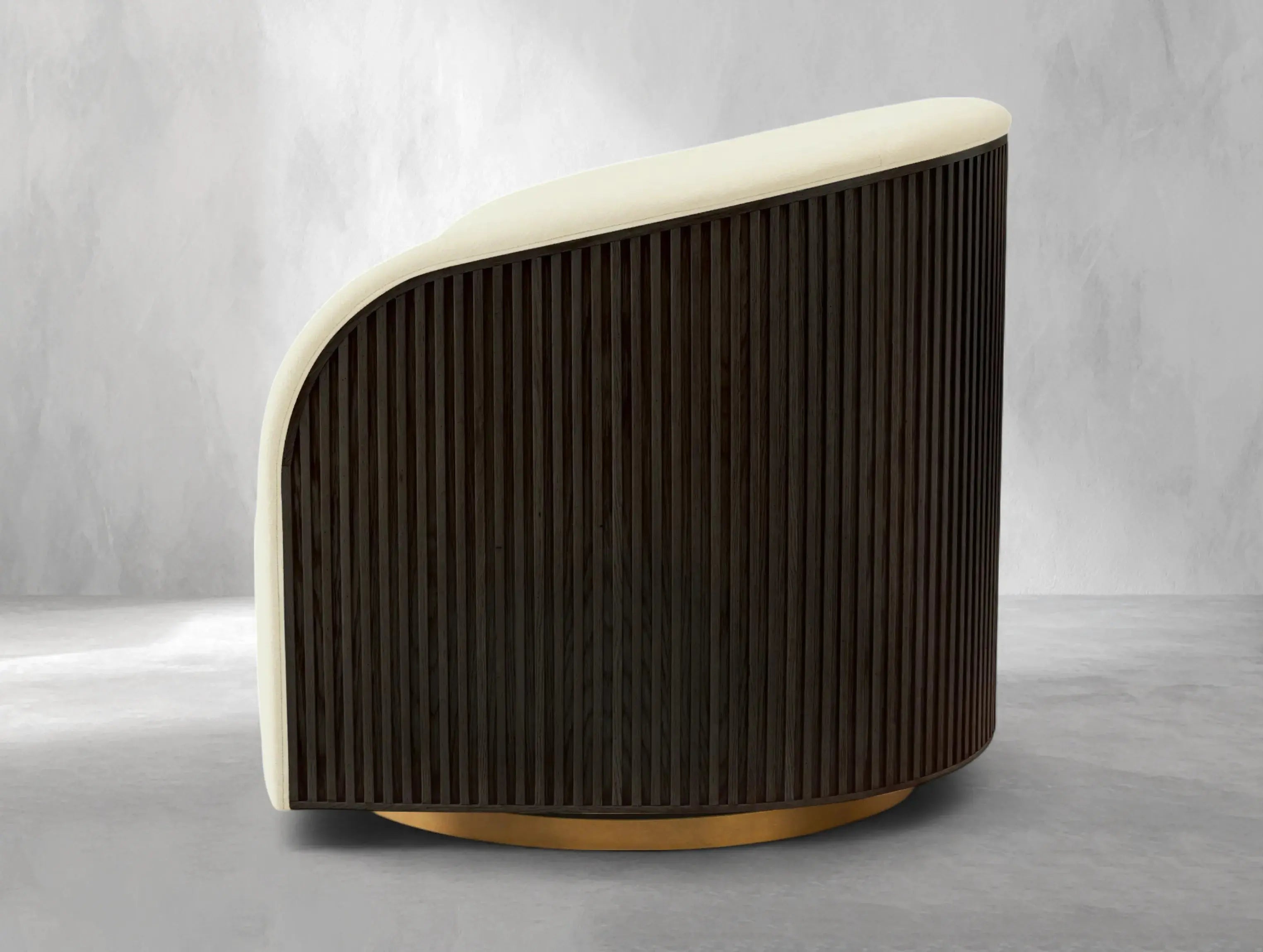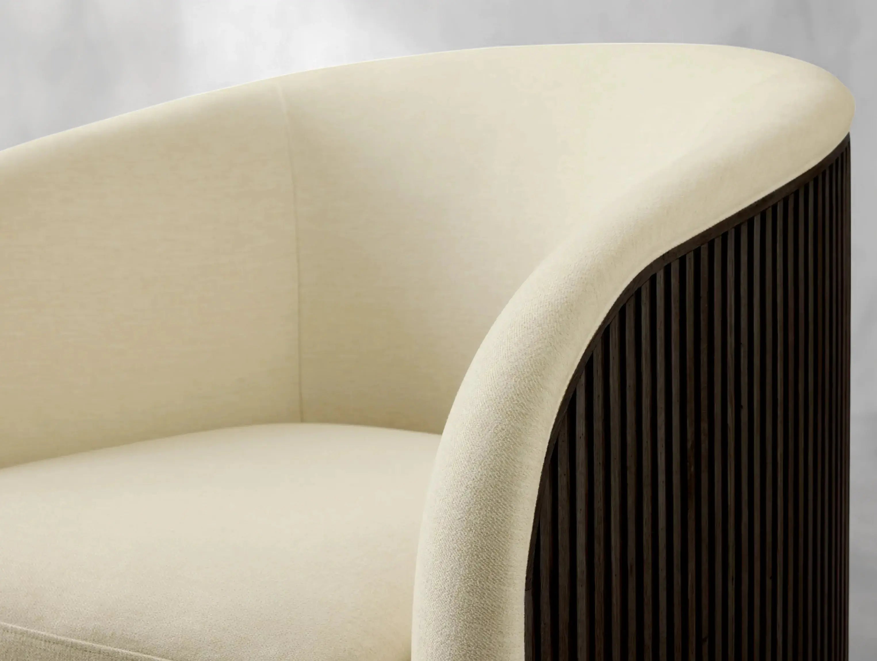 Blending artisan craftsmanship with modern comfort, this swivel chair from Ardenel brings character and sophistication to any space. Crafted from solid red or white oak with elegant reeded wood accents, it pairs rich textures with performance upholstery. A smooth 360-degree swivel base adds versatility, making it ideal for both relaxed lounging and stylish entertaining.