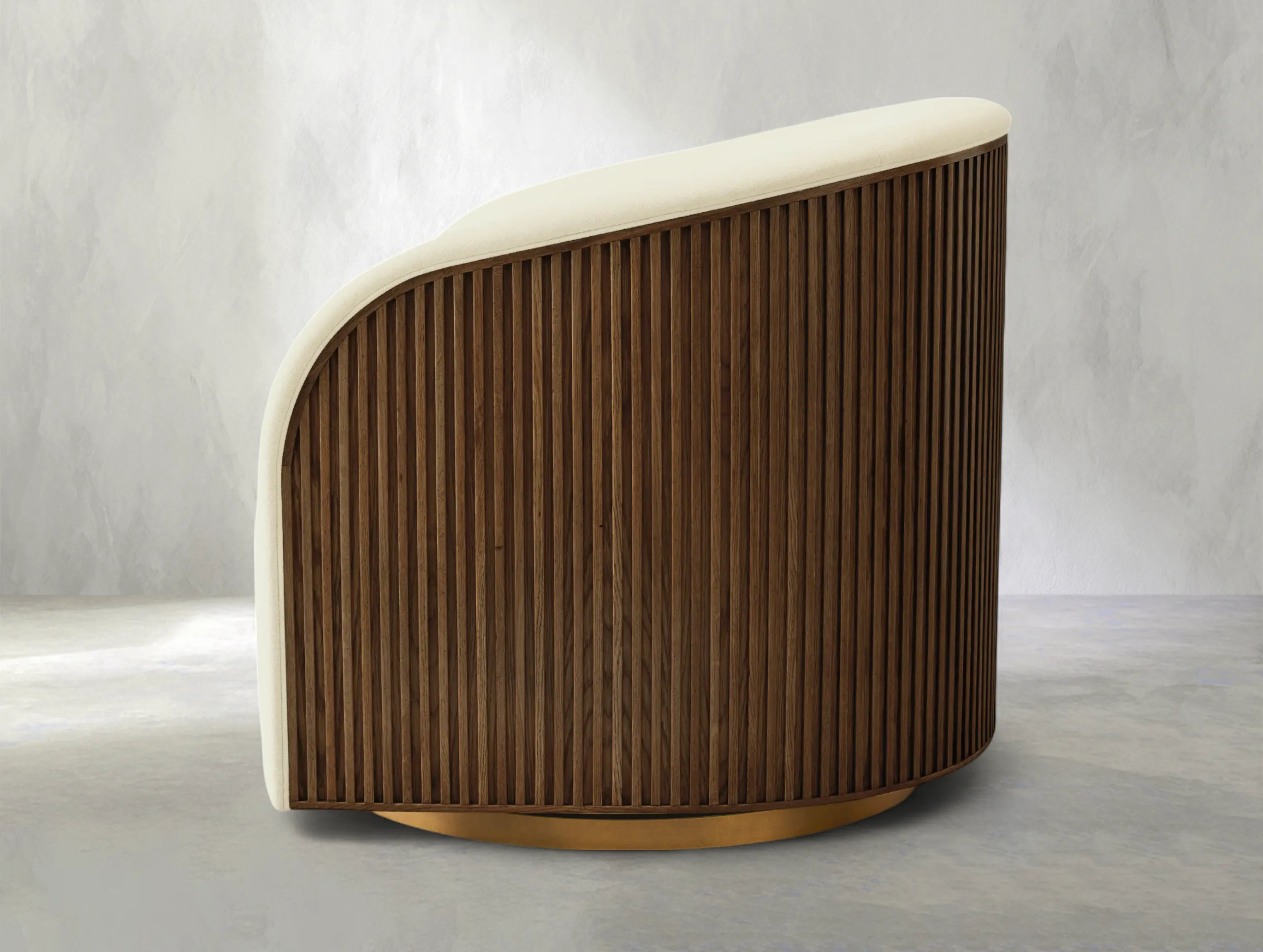 Blending artisan craftsmanship with modern comfort, this swivel chair from Ardenel brings character and sophistication to any space. Crafted from solid red or white oak with elegant reeded wood accents, it pairs rich textures with performance upholstery. A smooth 360-degree swivel base adds versatility, making it ideal for both relaxed lounging and stylish entertaining.