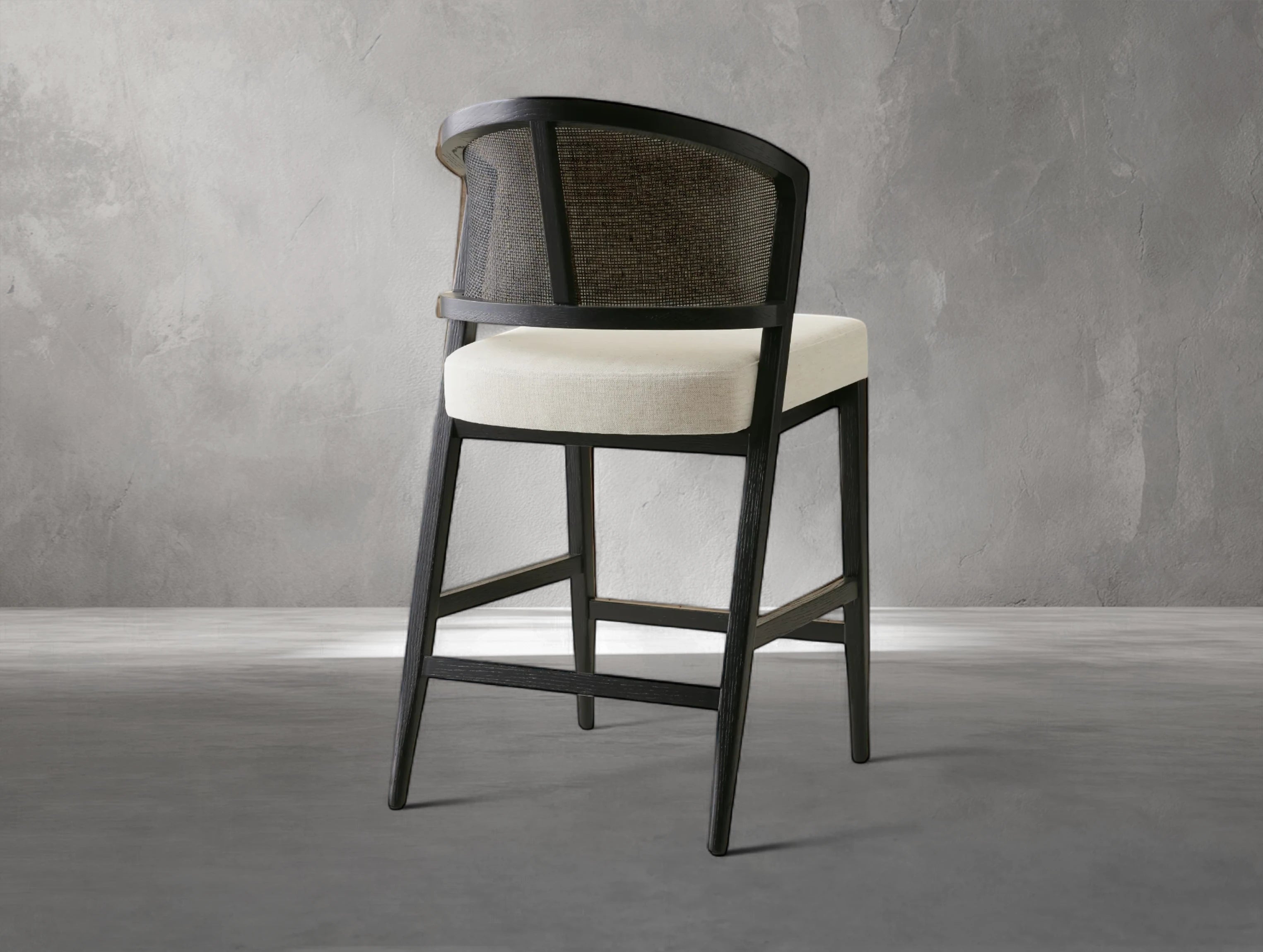The Emily Armless Counter Stool brings graceful curves and vintage charm to modern dining. Inspired by French antiques and midcentury design, it features flared oak legs, a softly curved back, and a rattan cane insert that adds warmth and texture.