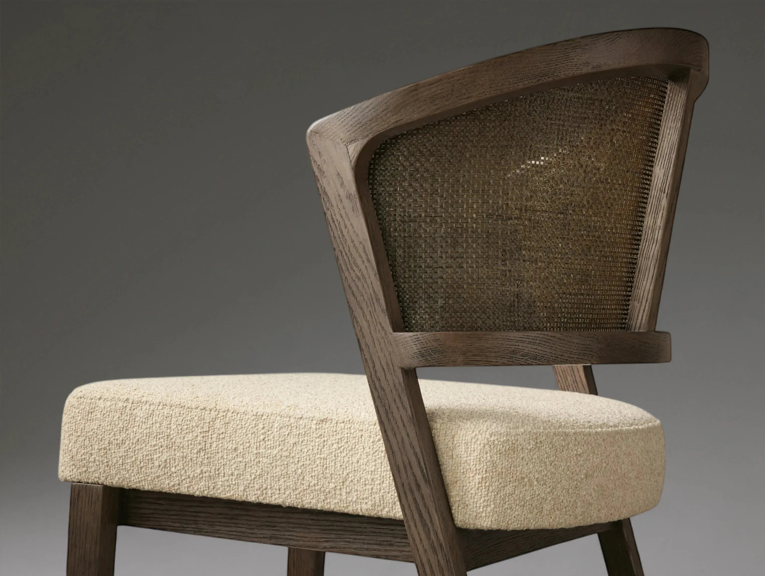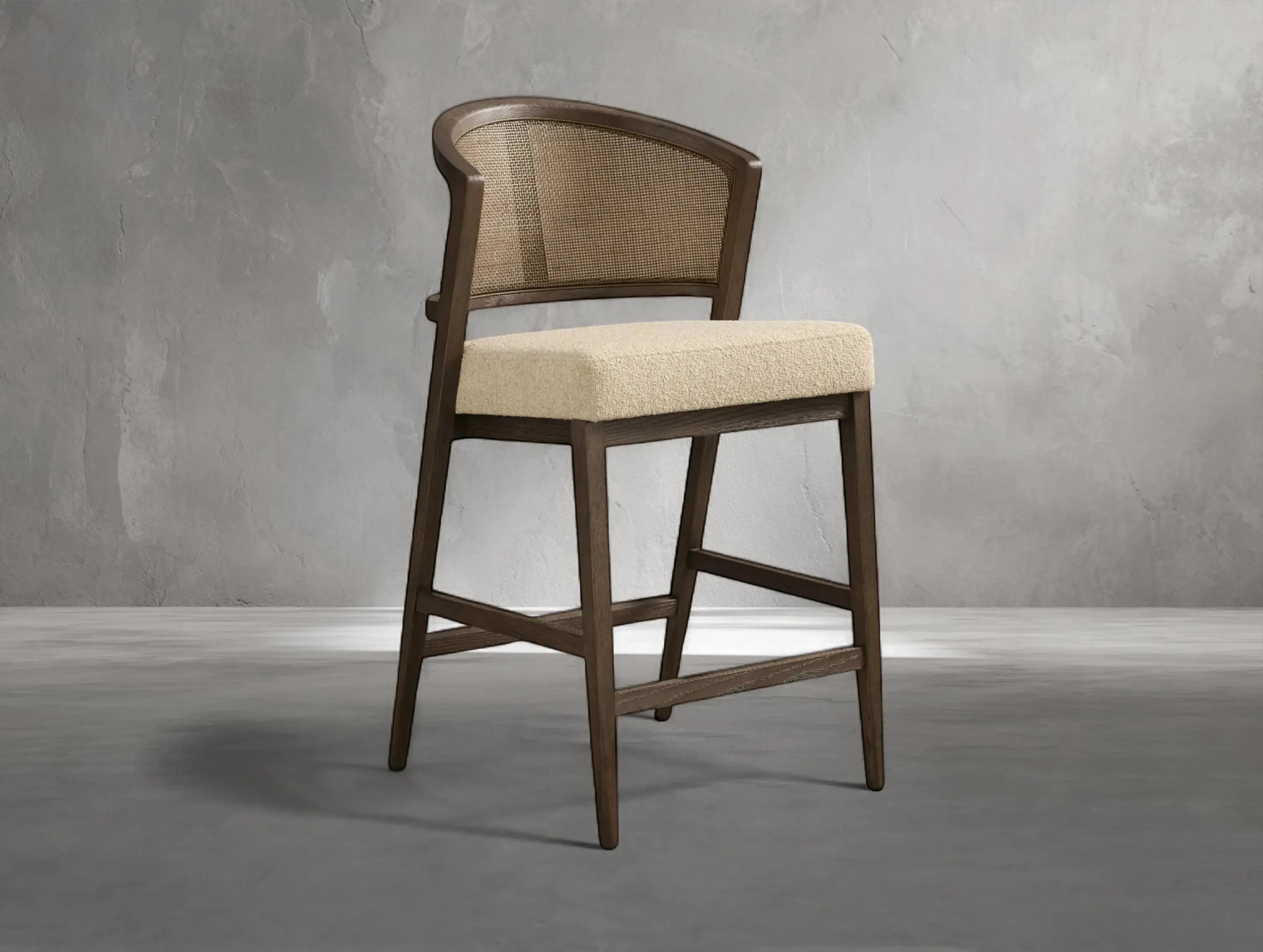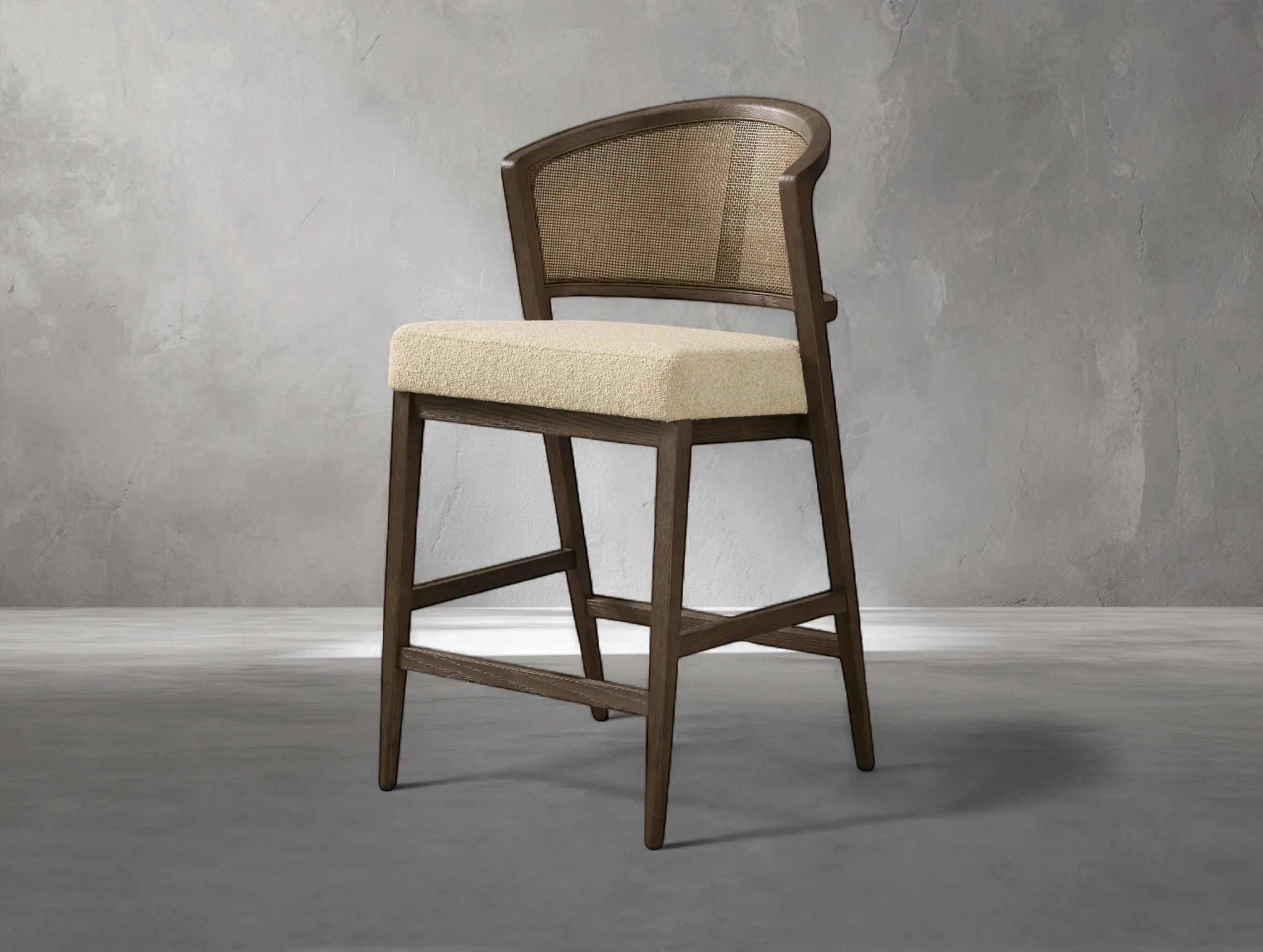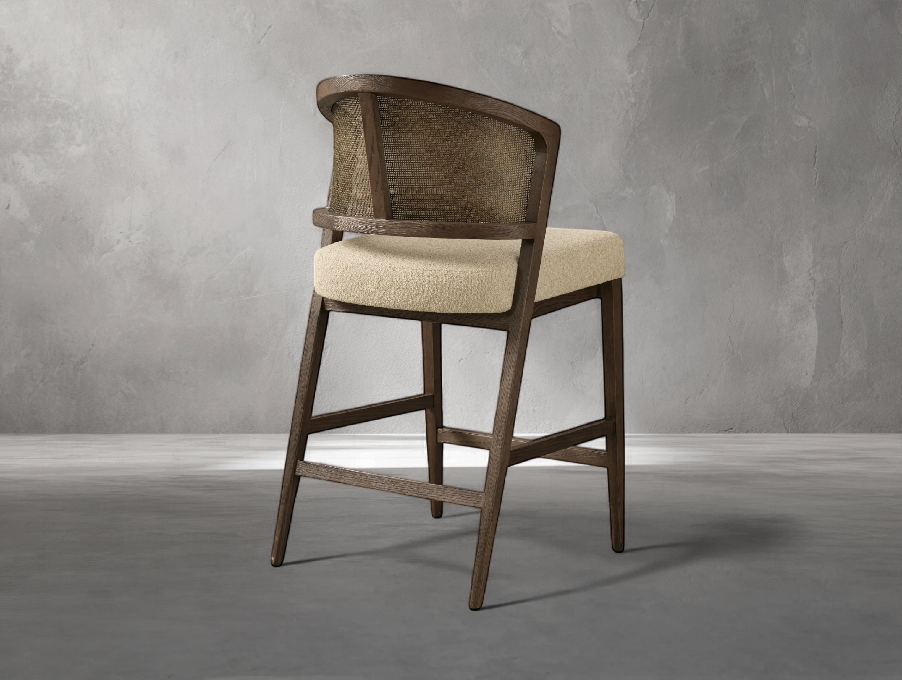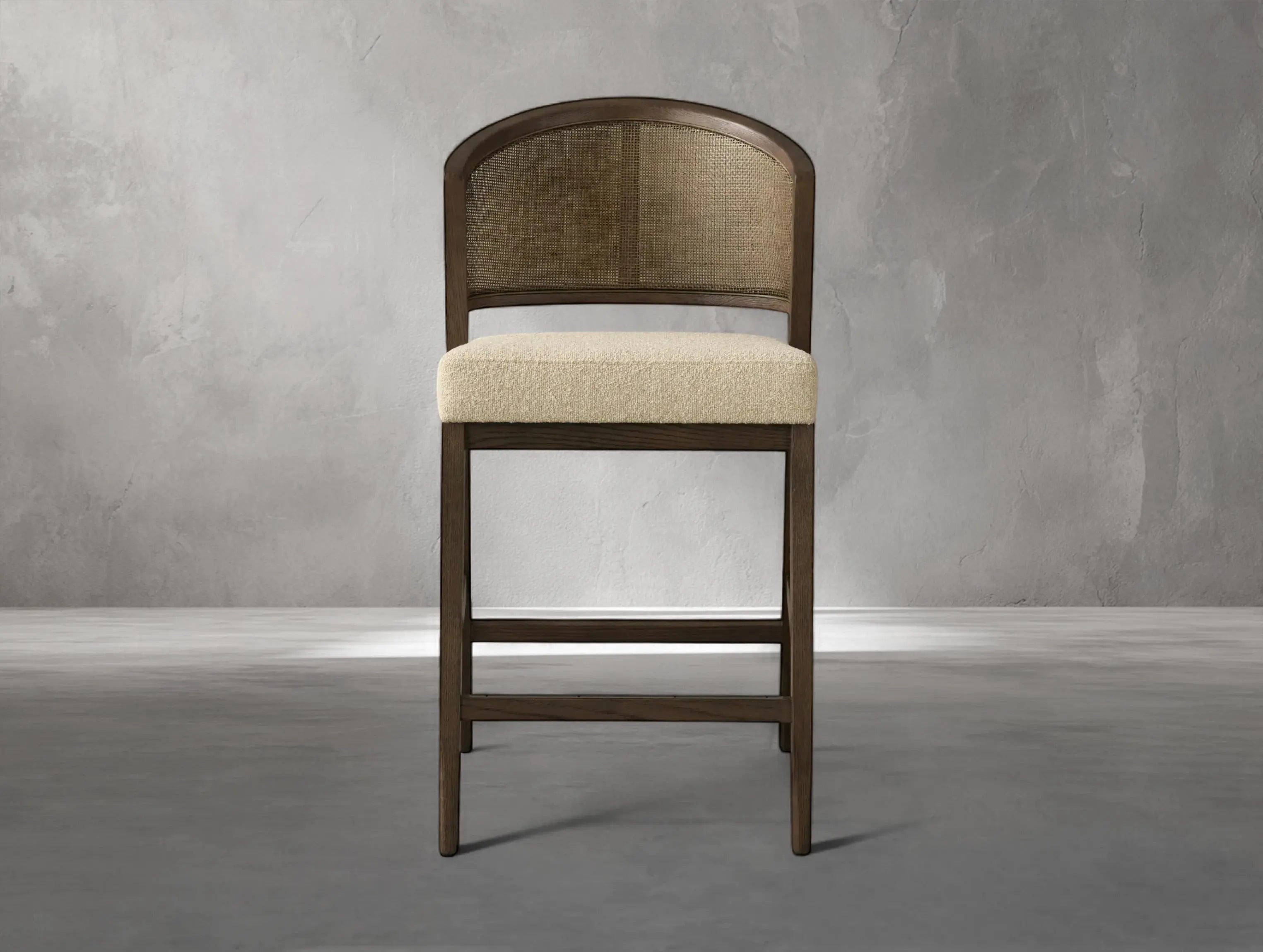 The Emily Armless Counter Stool brings graceful curves and vintage charm to modern dining. Inspired by French antiques and midcentury design, it features flared oak legs, a softly curved back, and a rattan cane insert that adds warmth and texture.