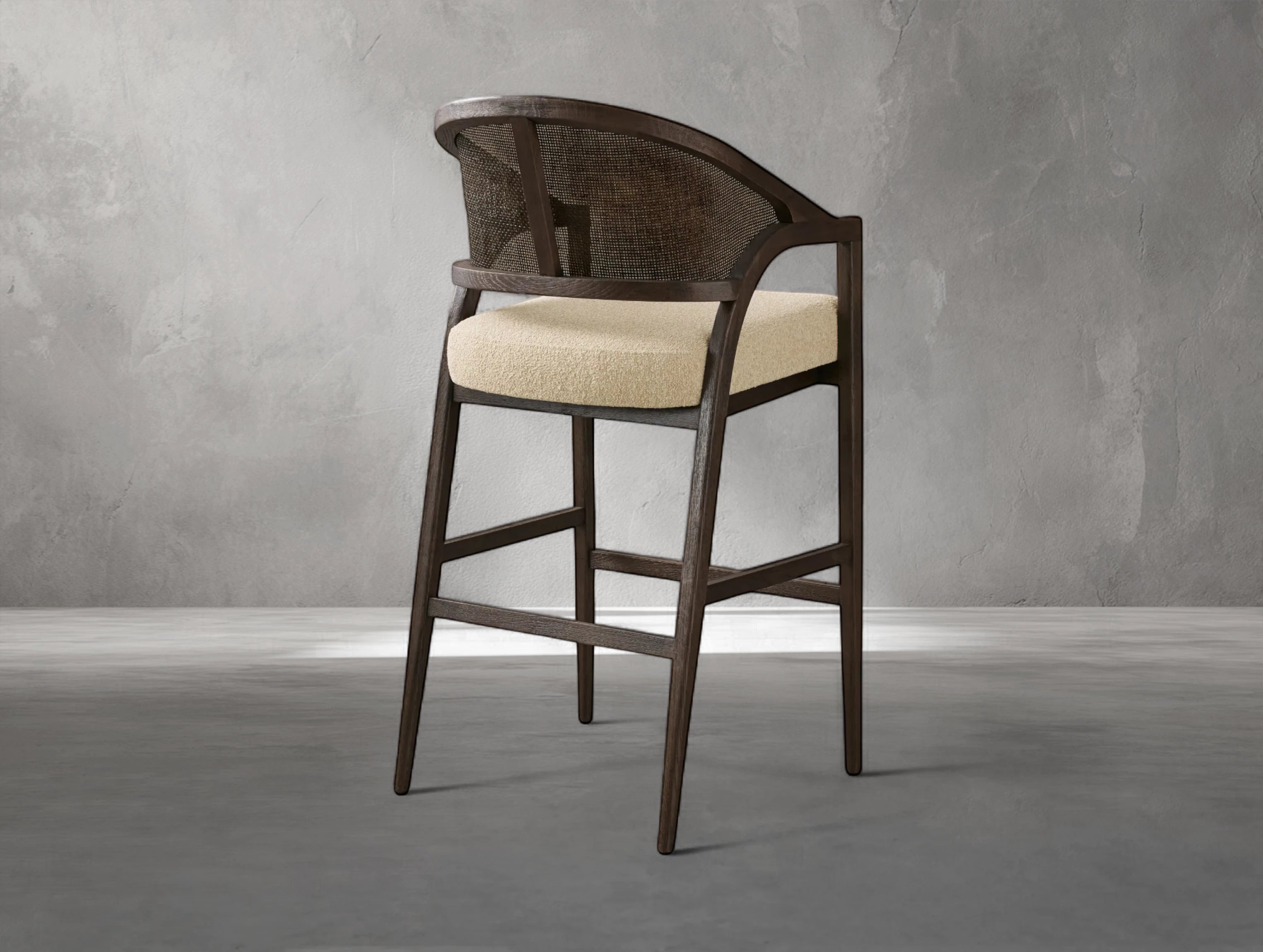 The Emily Stool blends the elegance of classic French antiques with the charm of midcentury modern design. Its flared oak legs, curved backrest, and rattan cane detail bring a timeless character, while a generously cushioned seat offers lasting comfort.