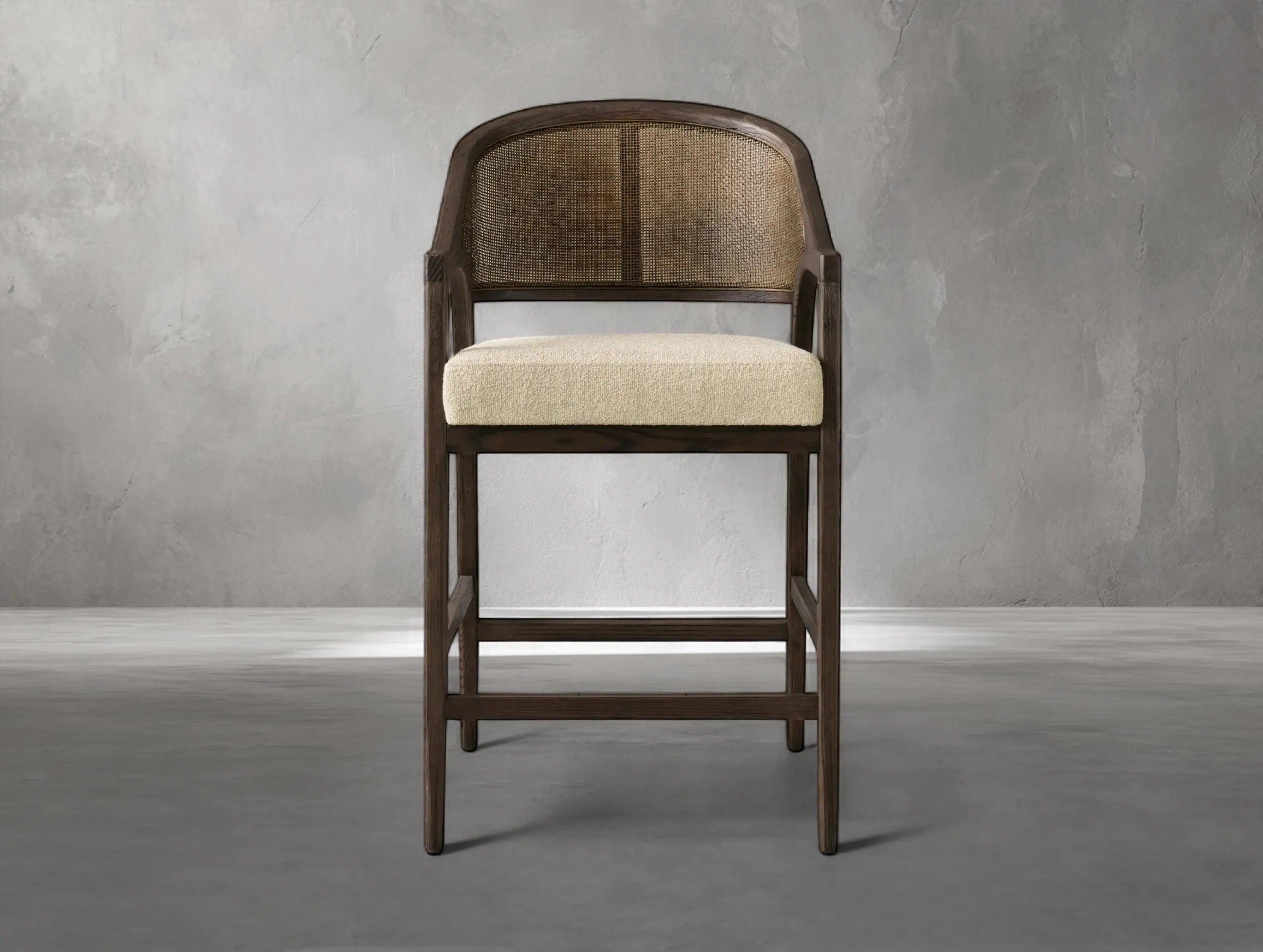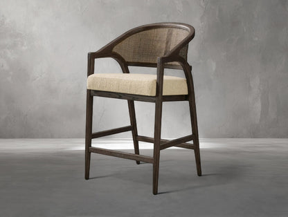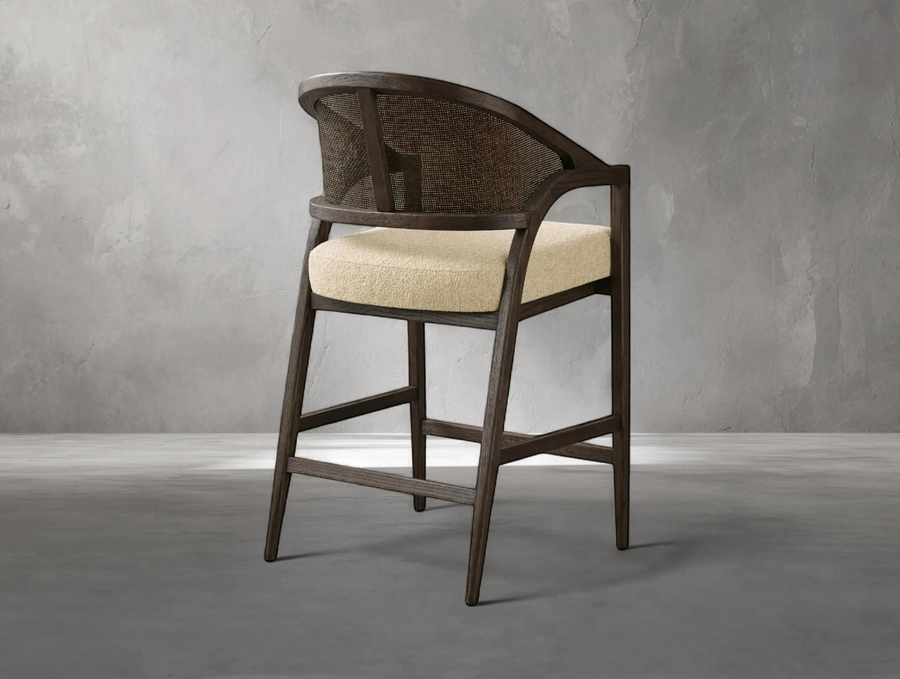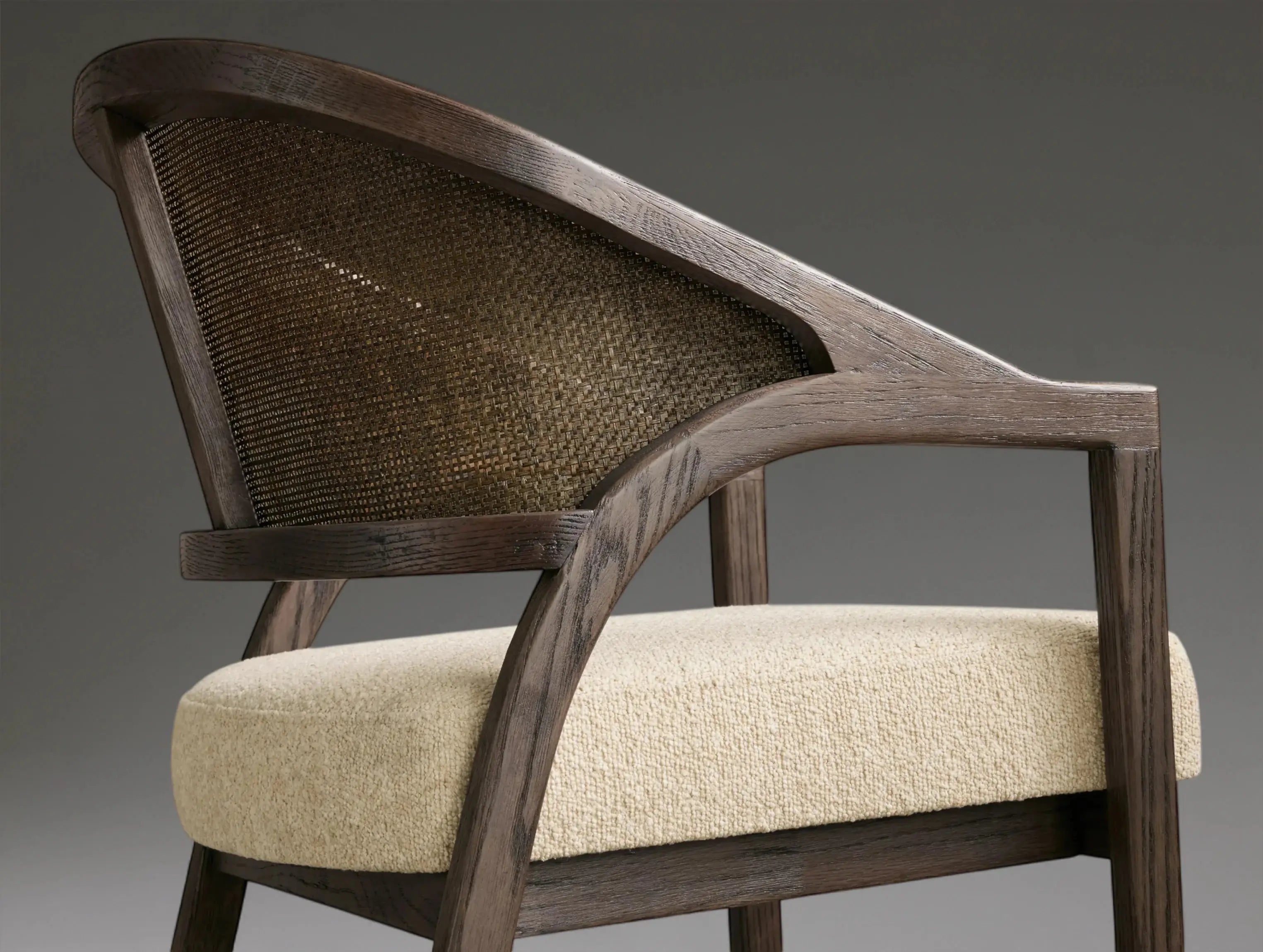 The Emily Stool blends the elegance of classic French antiques with the charm of midcentury modern design. Its flared oak legs, curved backrest, and rattan cane detail bring a timeless character, while a generously cushioned seat offers lasting comfort.