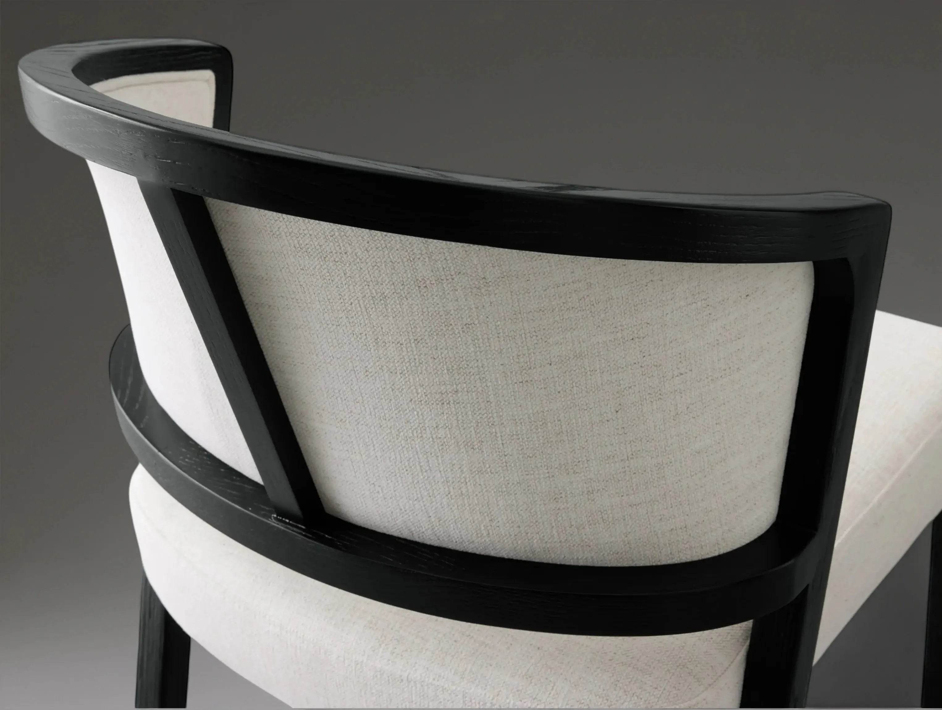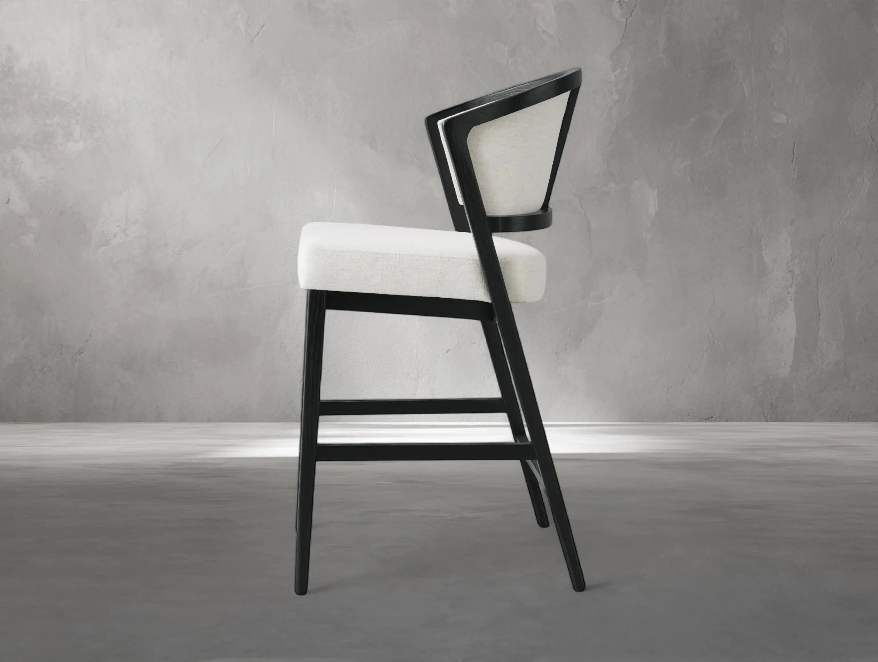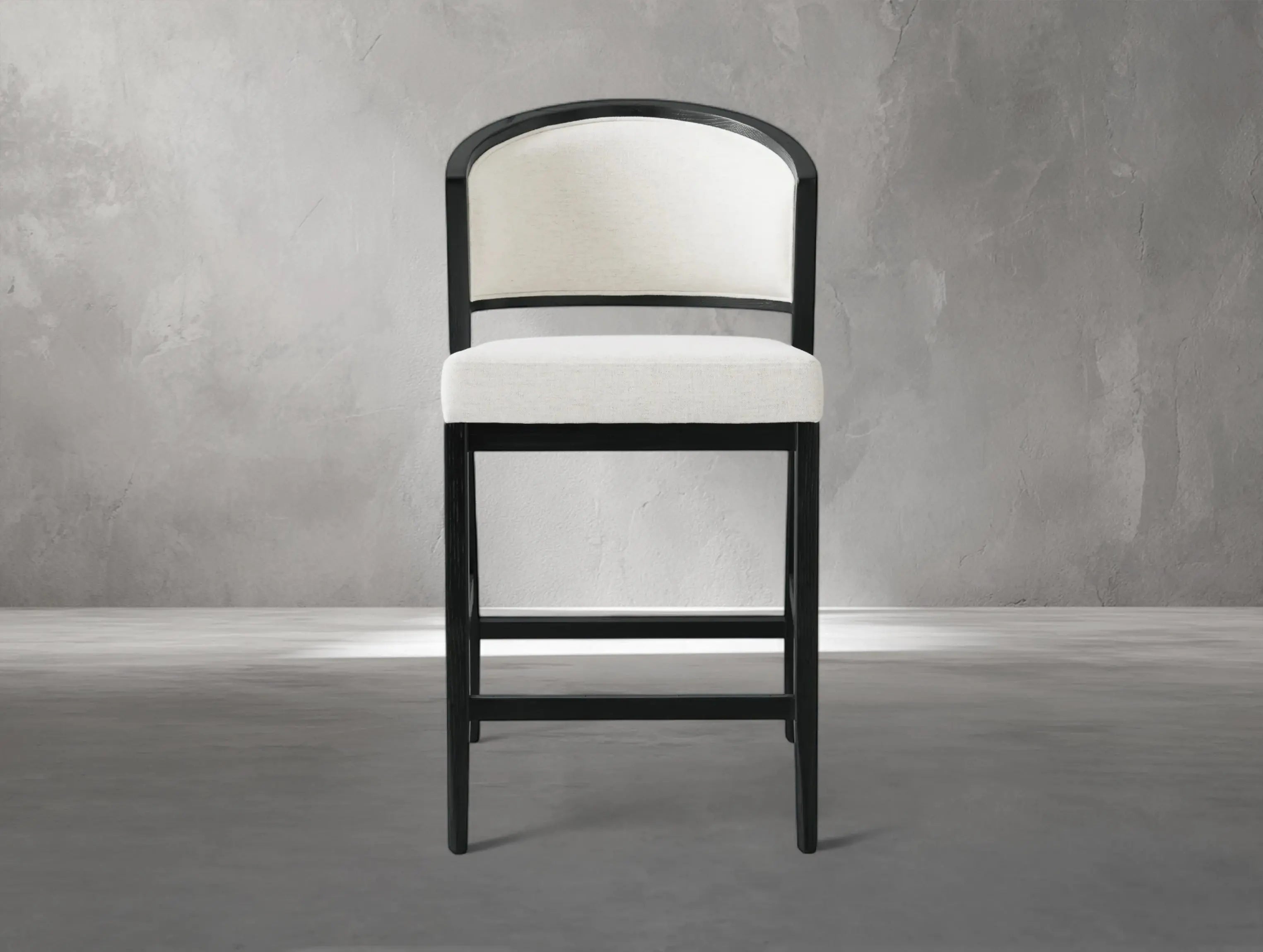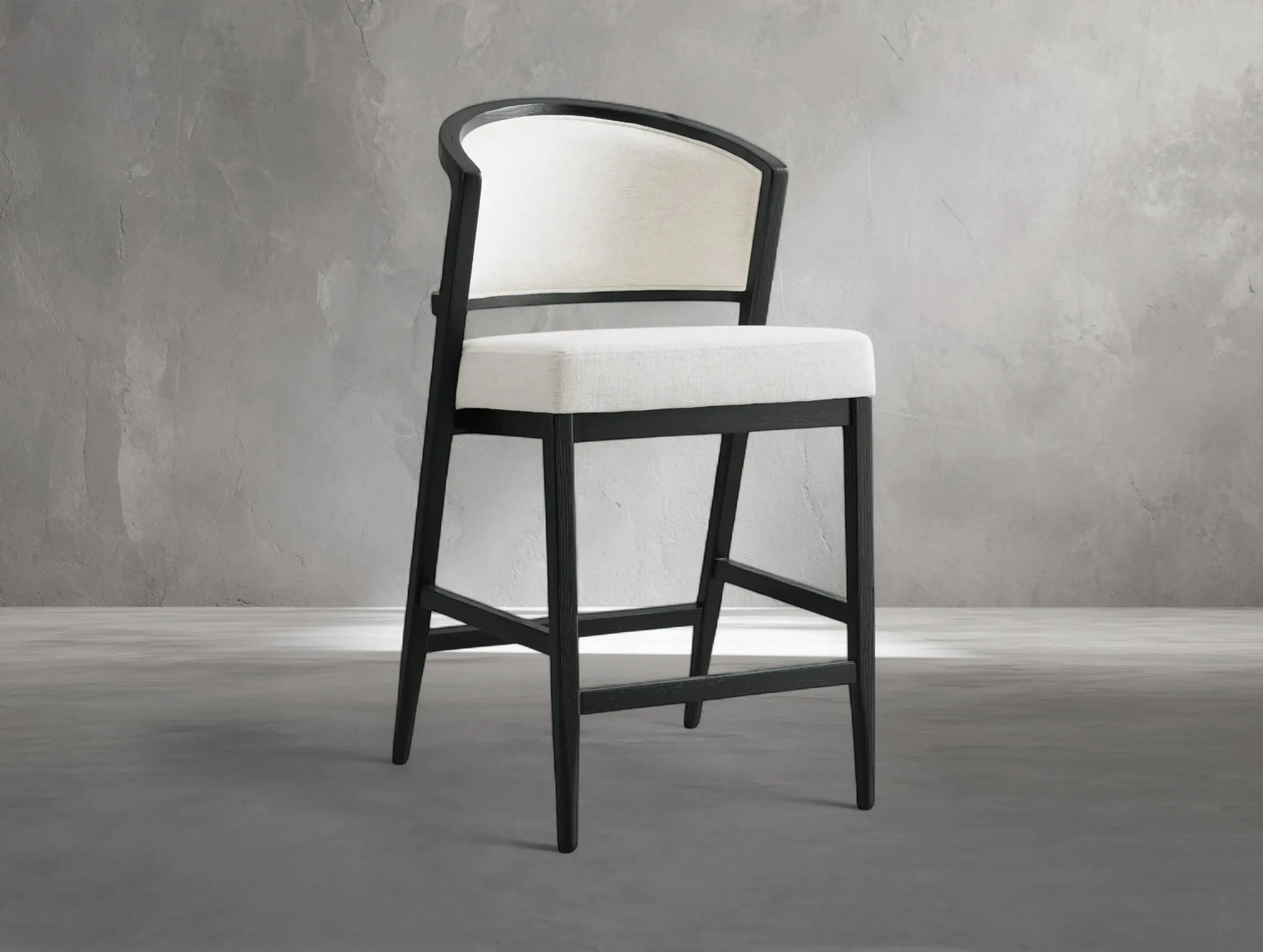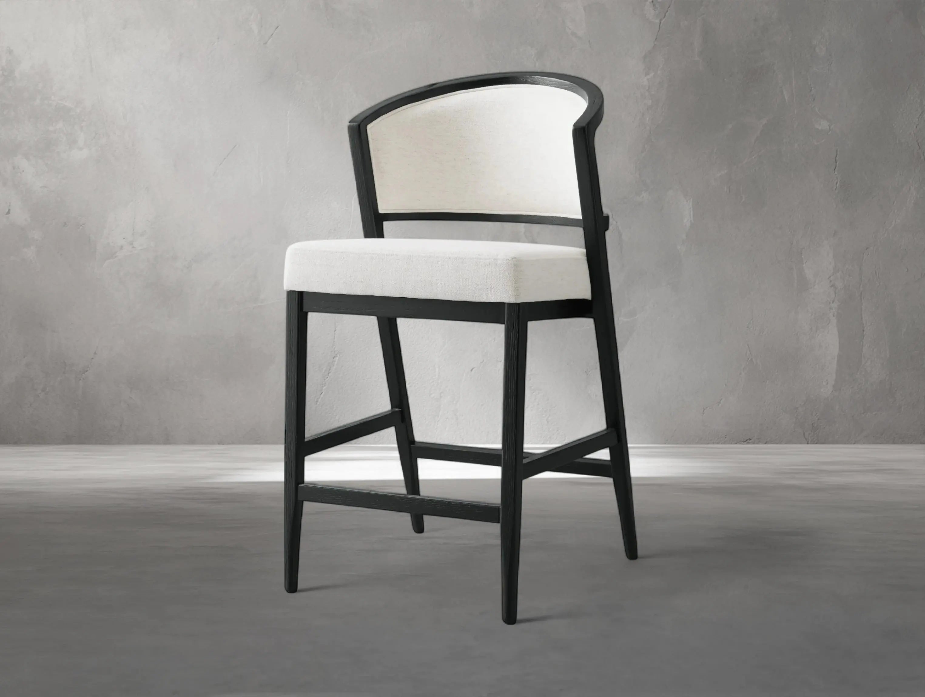 Finished by hand for a soft, refined sheen, this stool is available in a range of customizable fabrics and finishes. Whether styled around a kitchen island or high-top table, Emily brings understated elegance to any space.