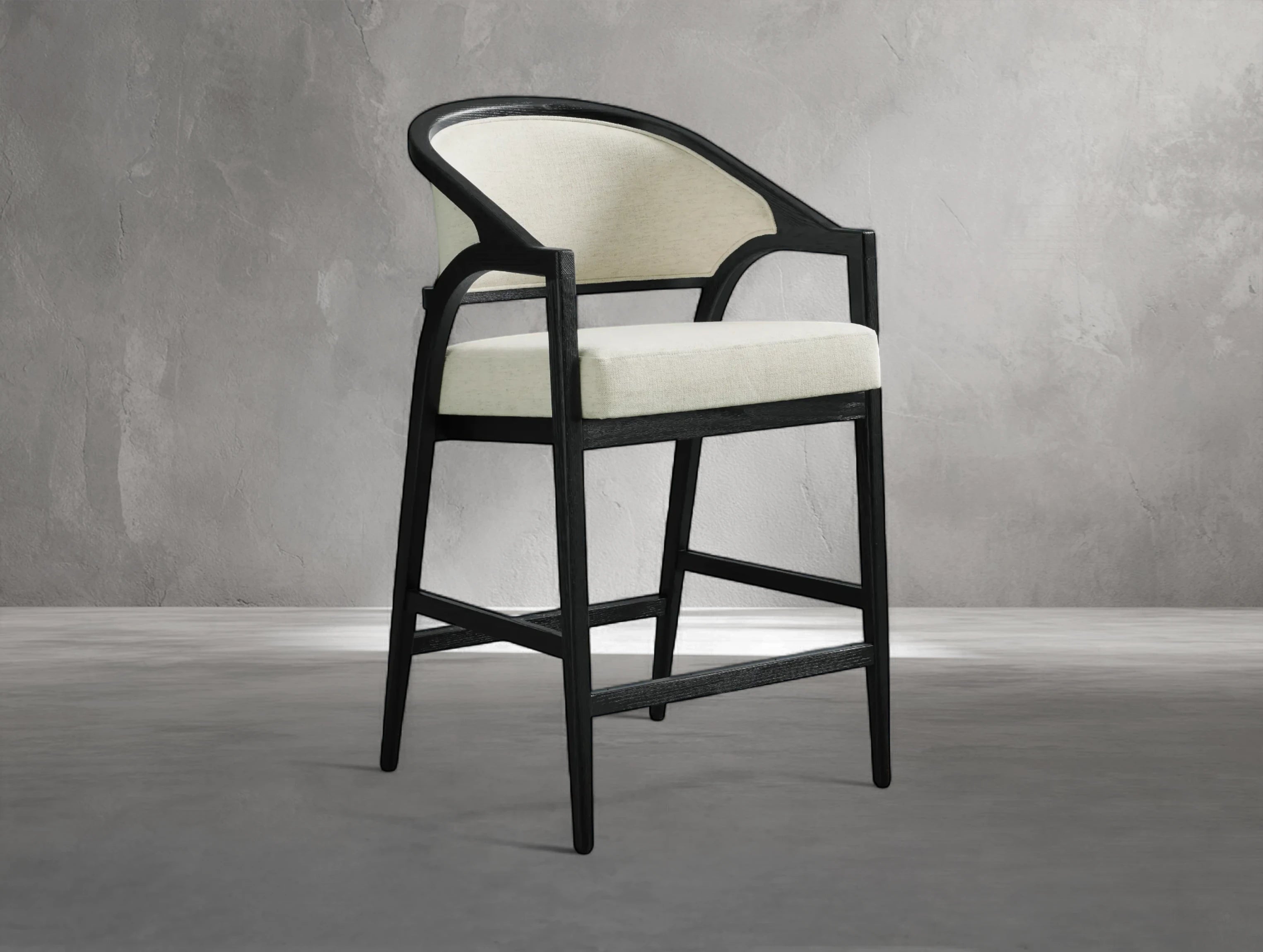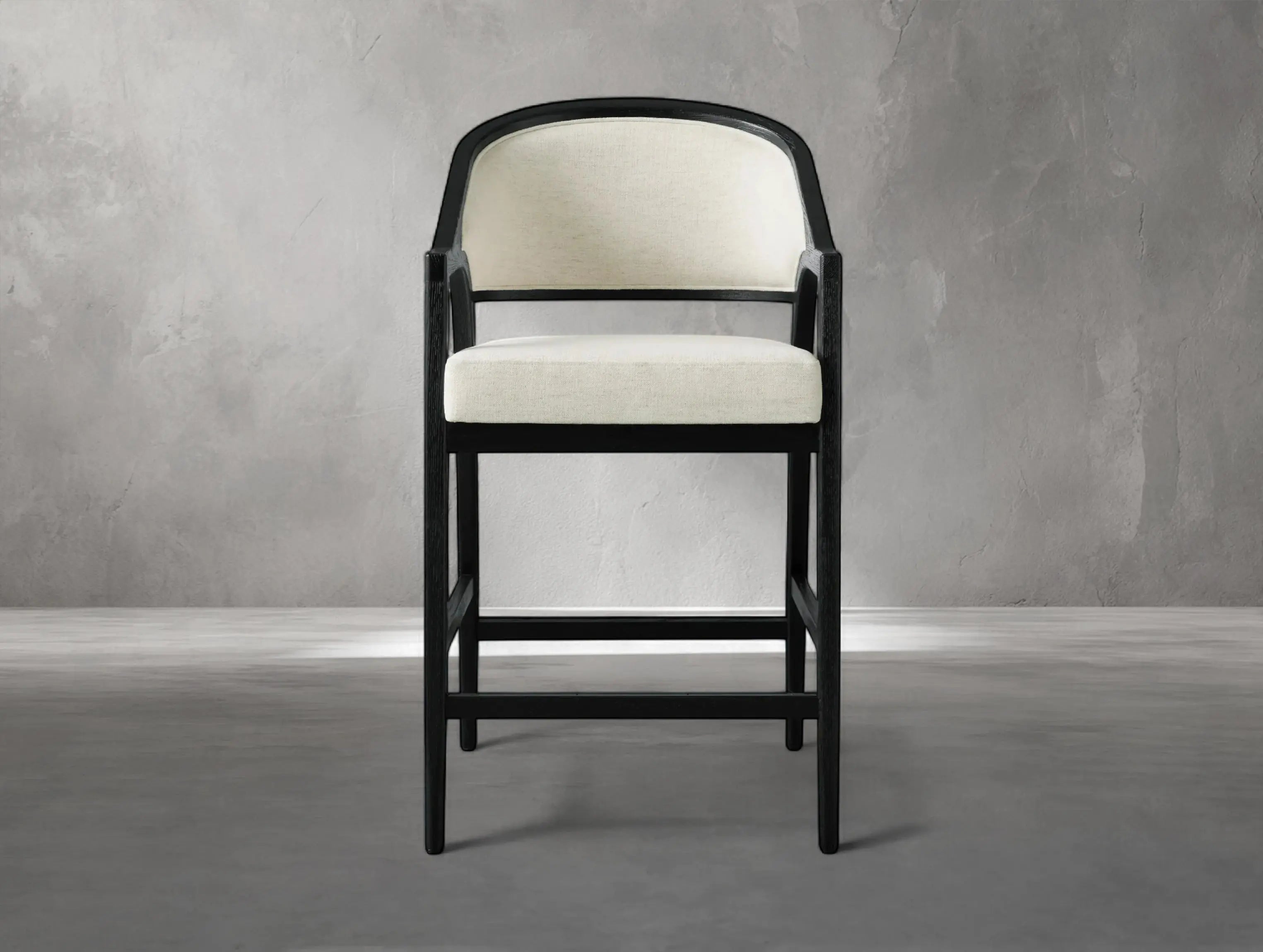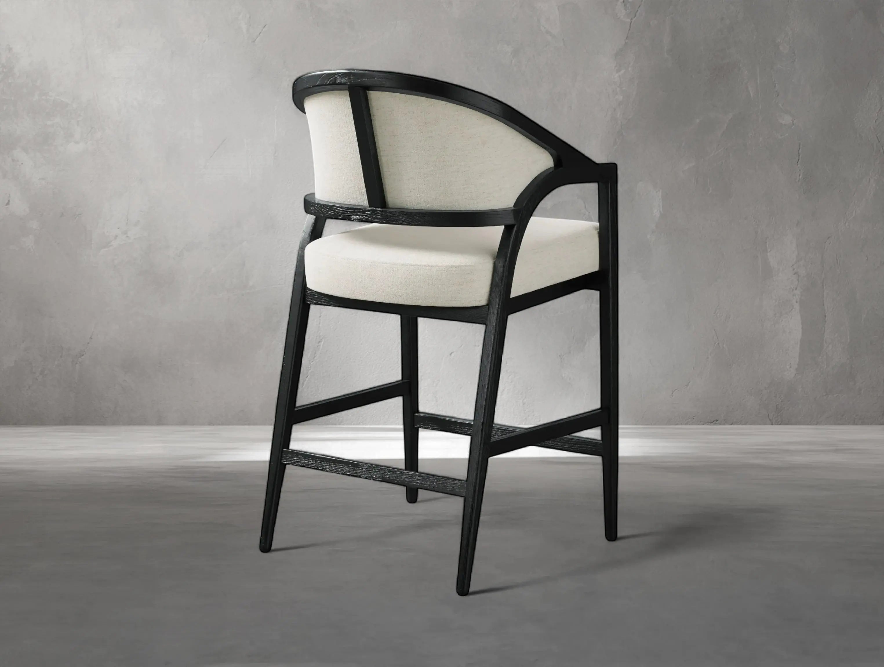 The Emily Upholstered Back Counter Stool brings graceful design and everyday comfort to your kitchen or dining space. With flared oak legs, a curved silhouette, and fully upholstered back and seat, it channels the elegance of French antiques with a modern sensibility.