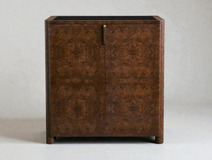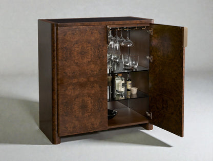 This burl wood bar cabinet highlights the rich beauty of walnut burl through a refined silhouette defined by gentle curves and warm auburn tones. Swirling grain patterns create depth and visual movement, while smoked glass and brass hardware introduce a sophisticated contrast. Inside, a mirrored back, glass shelving, and integrated lighting enhance the display of glassware and spirits. Both functional and sculptural, it serves as a striking focal point for dining rooms, living spaces, or entertaining areas.