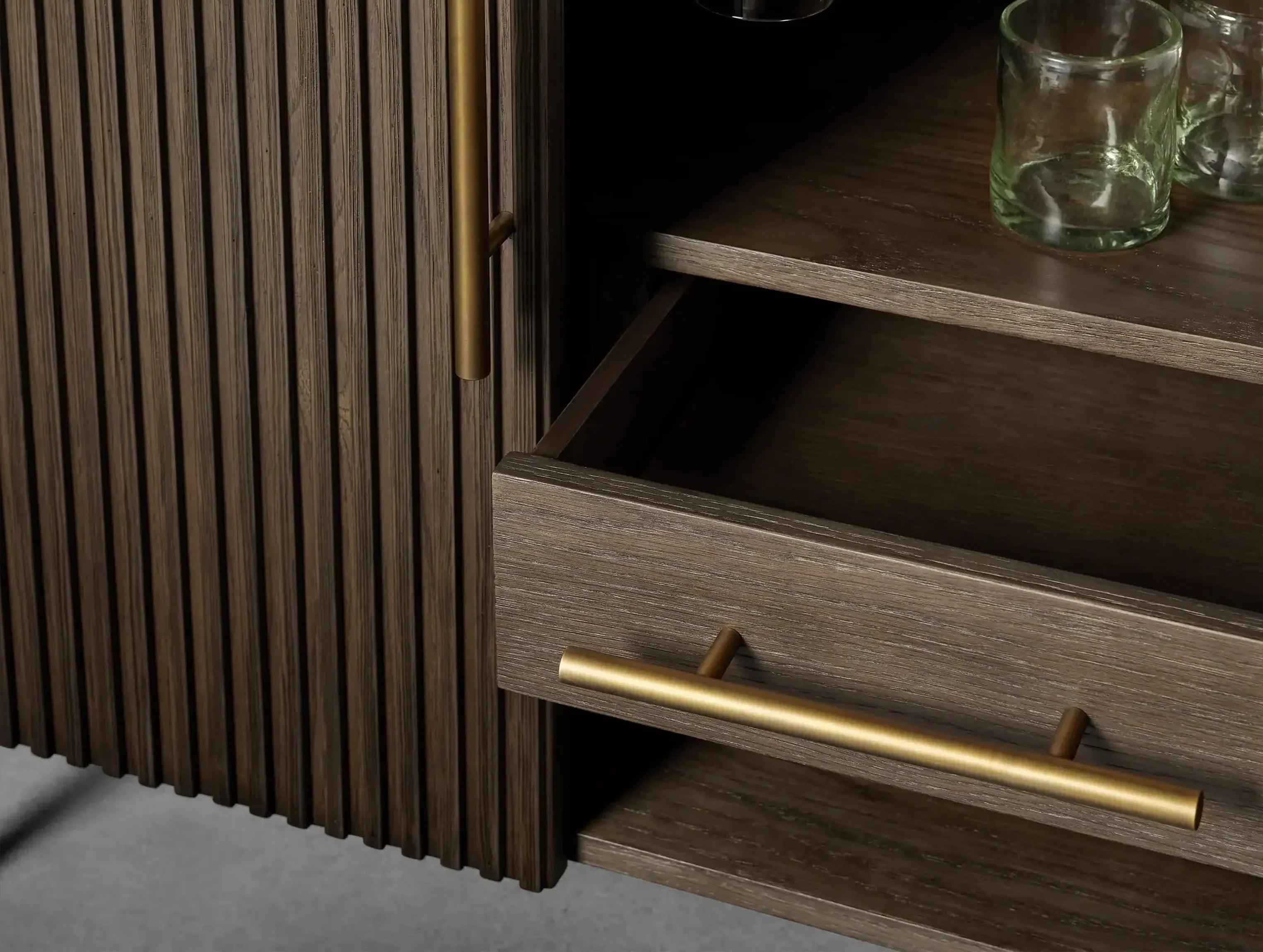 Inside, you’ll find thoughtfully designed storage for bottles and stemware, along with interior drawers and adjustable shelving. With its soft-close doors, brass-finished hardware, and artisan joinery, Rolphin blends beauty with practicality for dining rooms, lounges, or work-from-home nooks.