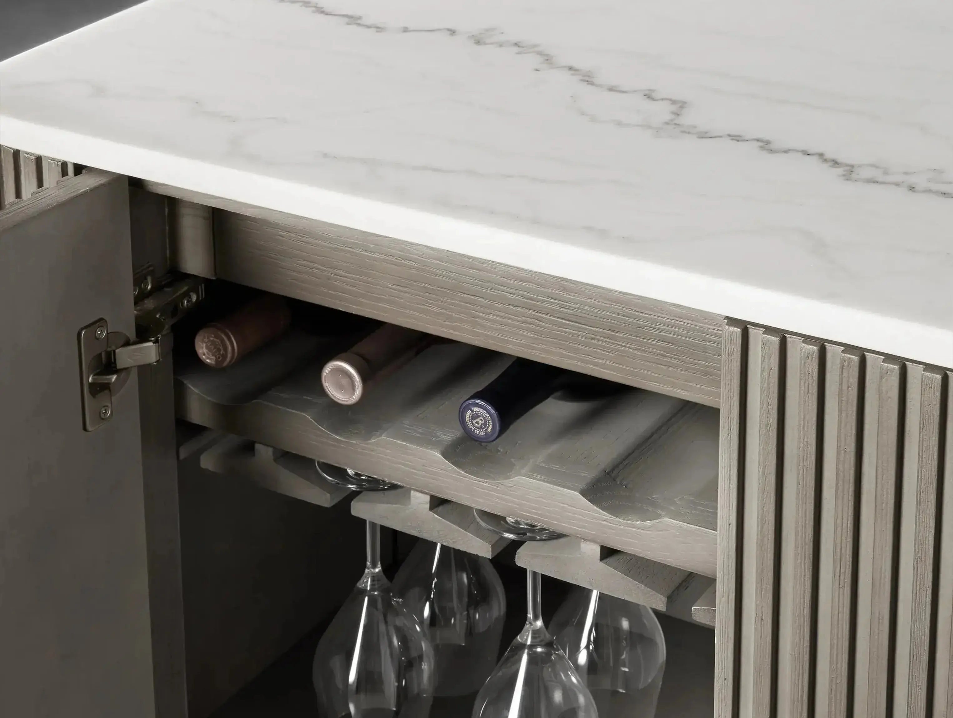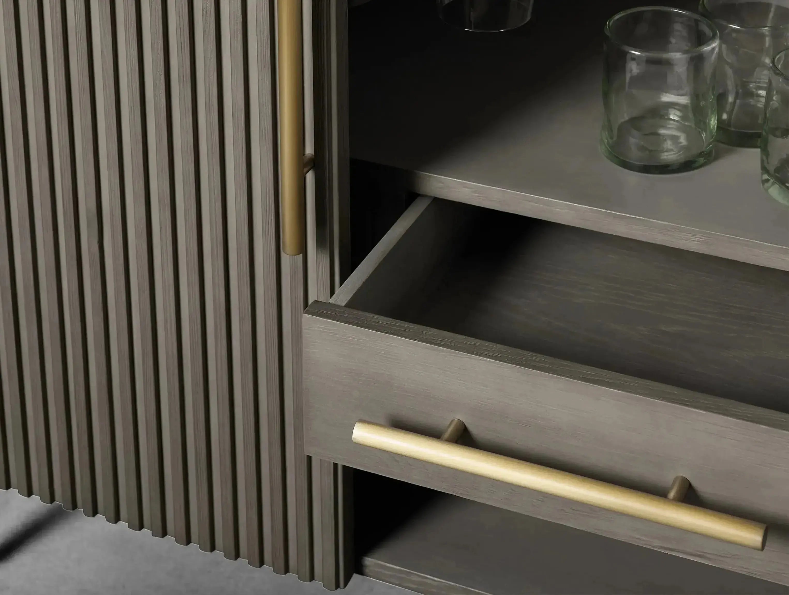 Inside, you’ll find thoughtfully designed storage for bottles and stemware, along with interior drawers and adjustable shelving. With its soft-close doors, brass-finished hardware, and artisan joinery, Rolphin blends beauty with practicality for dining rooms, lounges, or work-from-home nooks.
