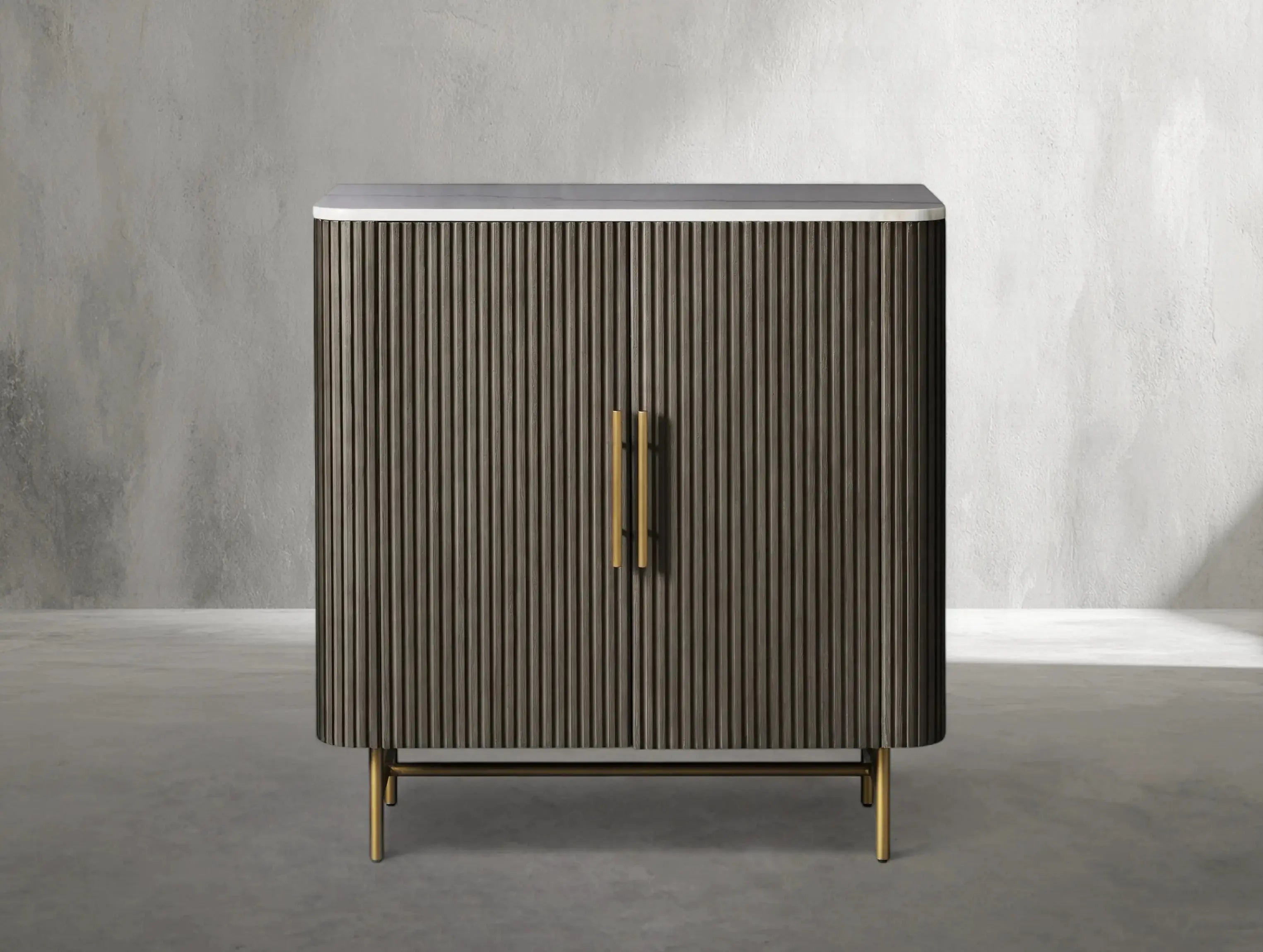 The Rolphin Bar Cabinet brings elevated charm to any space with its rich mix of textures and materials. Crafted from hand-finished white oak or Finnish pine, each piece is accented with reeded oak detailing and a polished stone top—creating a chic, modern focal point for entertaining or everyday elegance.