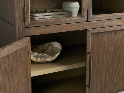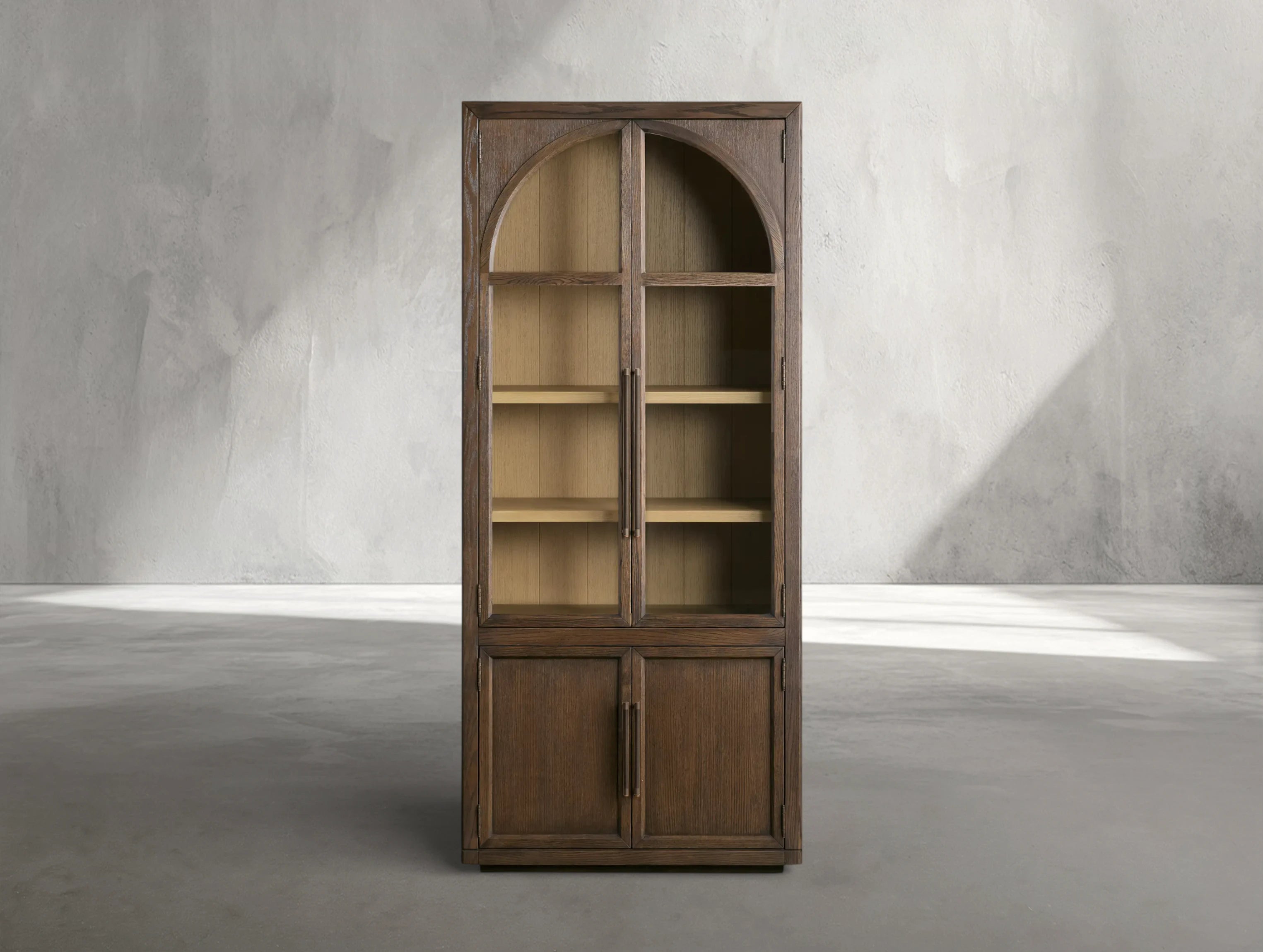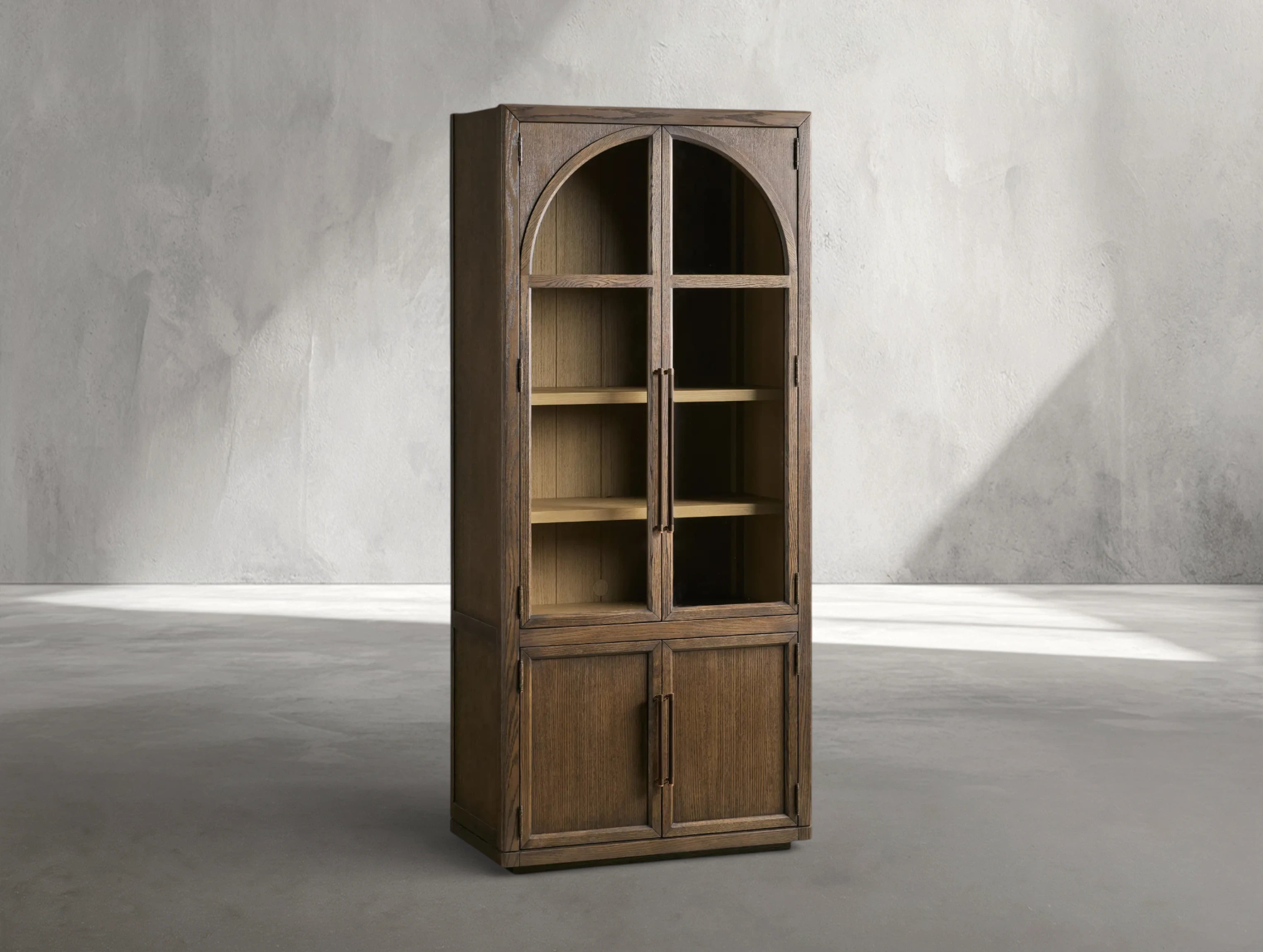 Defined by a clean square silhouette, this glass-front cabinet blends architectural clarity with refined detailing. The transparent doors feature a softly integrated arch, adding subtle visual interest without disrupting the modern form. Inside, open shelving provides generous space for both curated displays and everyday essentials. Thoughtfully balanced in proportion and material, the piece brings a composed, elevated presence to any interior.