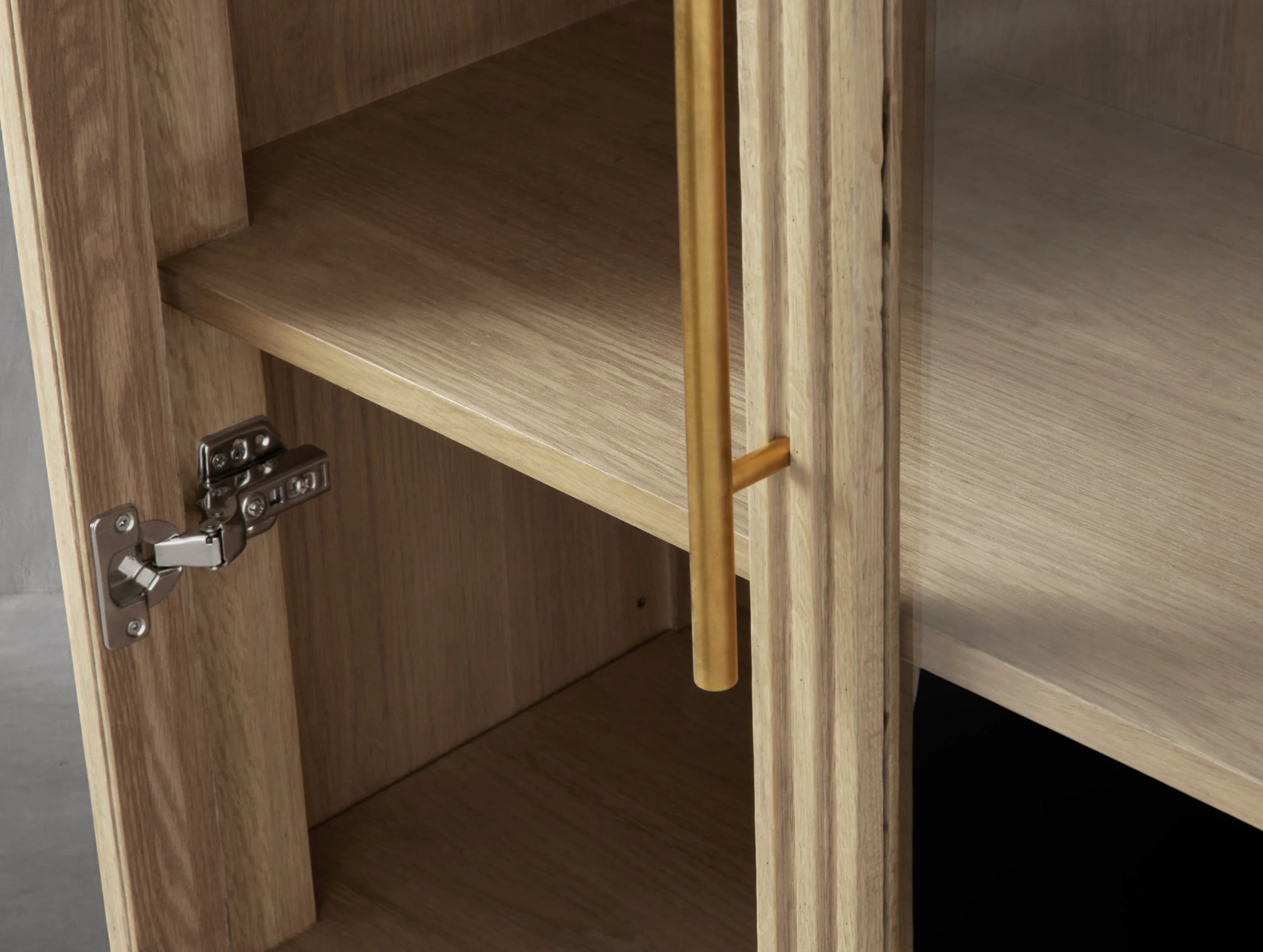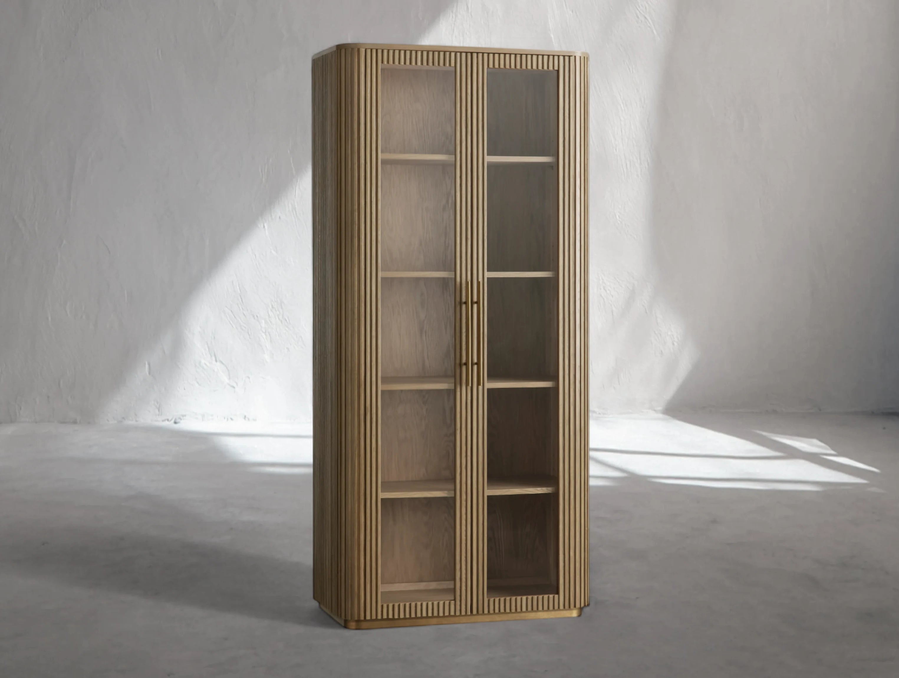 The Rolphin glass cabinet showcases a sophisticated mixed-material design that pairs natural wood with sleek glass for timeless appeal. Crafted from hand-finished Finnish pine or premium white oak, it features reeded oak detailing, tempered glass doors with brass pulls, and a brass-finished plinth base. With adjustable and fixed shelving, this cabinet offers both display and storage versatility for any room in your home.