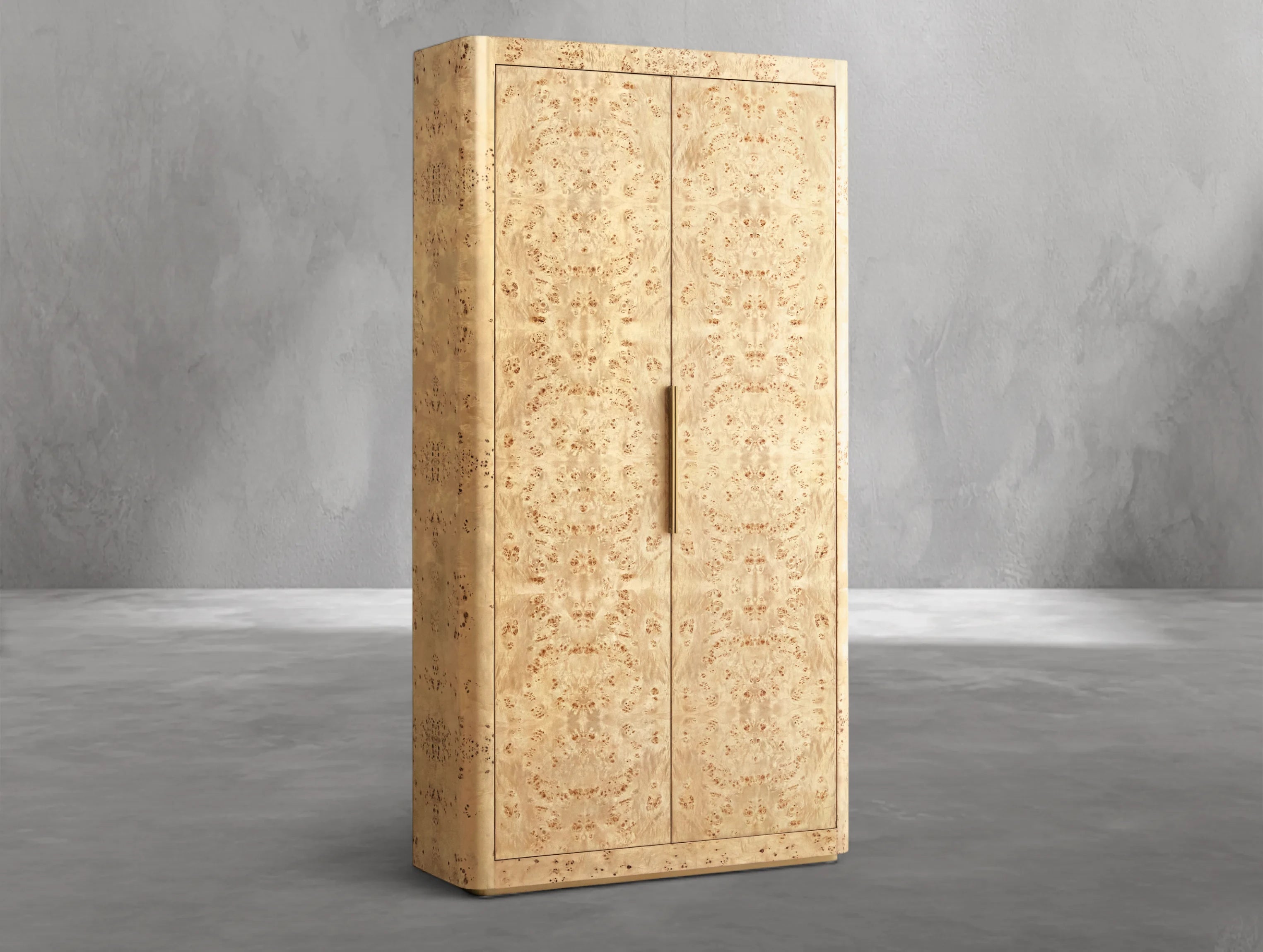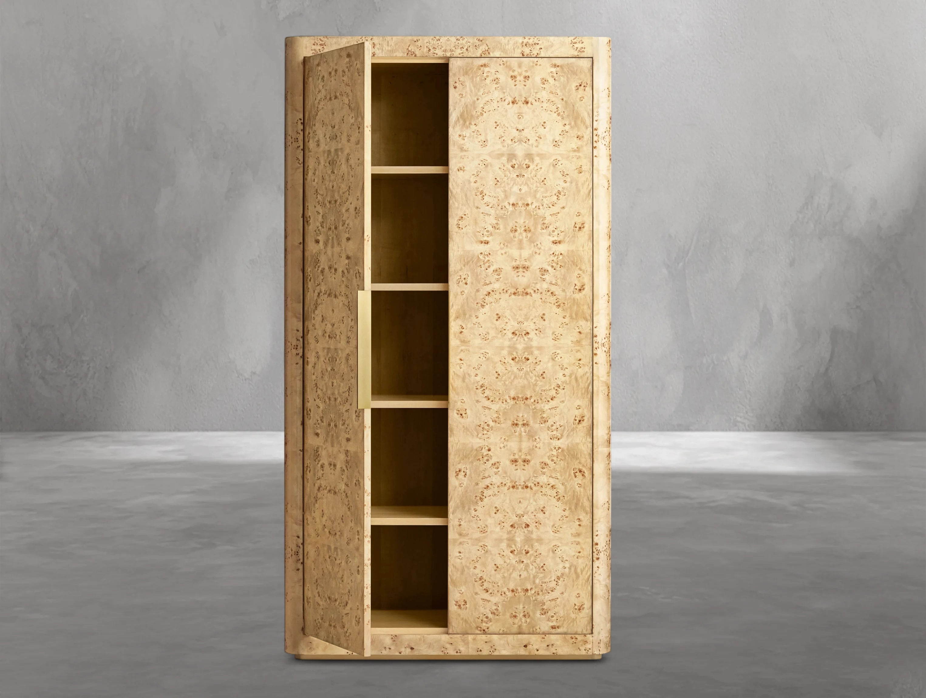 The Roryland Burl Cabinet embodies the quiet sophistication of 1970s postmodern design, defined by its minimal geometry and the rich organic beauty of burl wood. Each surface is hand-wrapped in fine burl veneers, revealing intricate swirls and natural tonal variations that make every piece one of a kind.