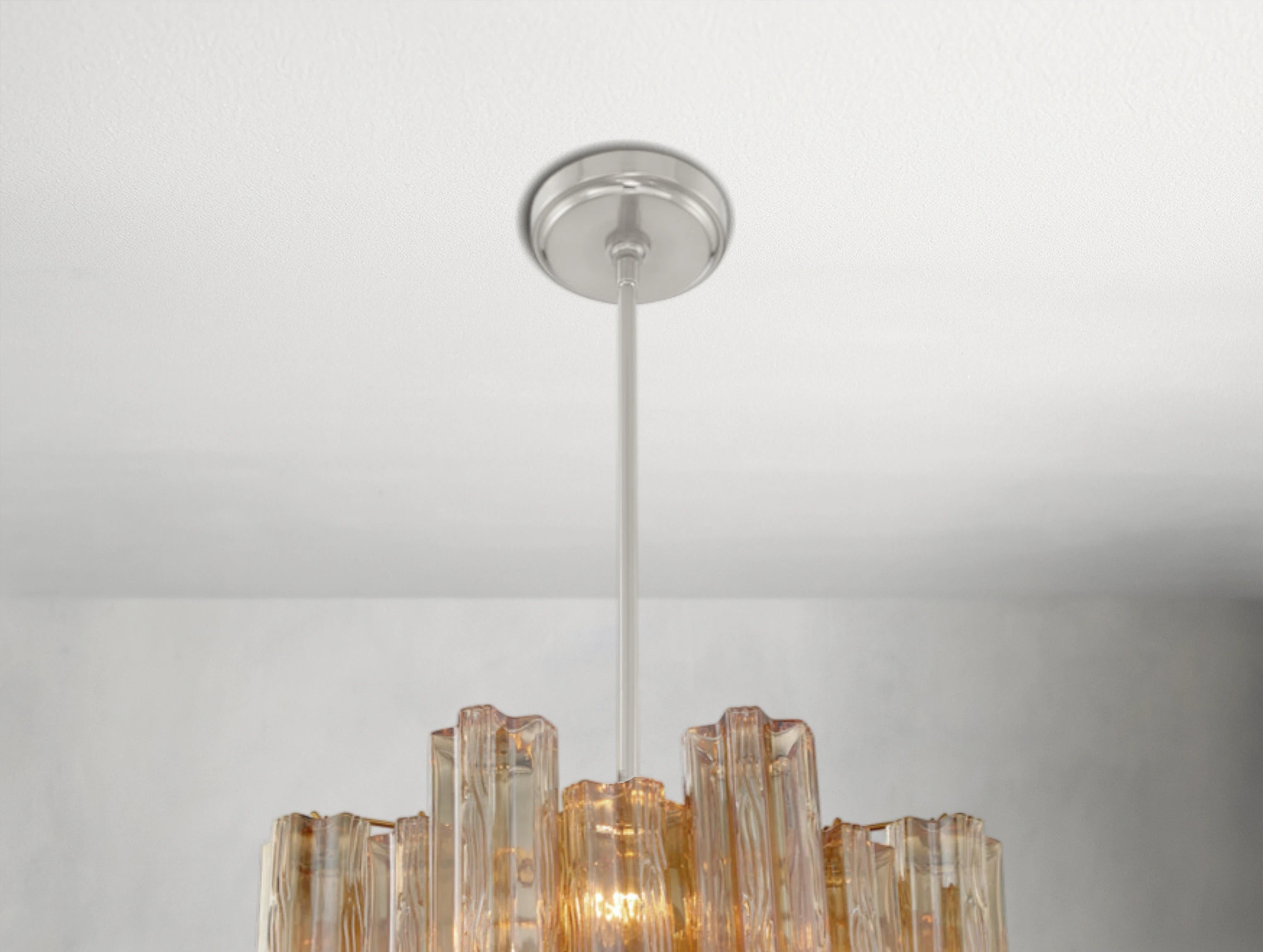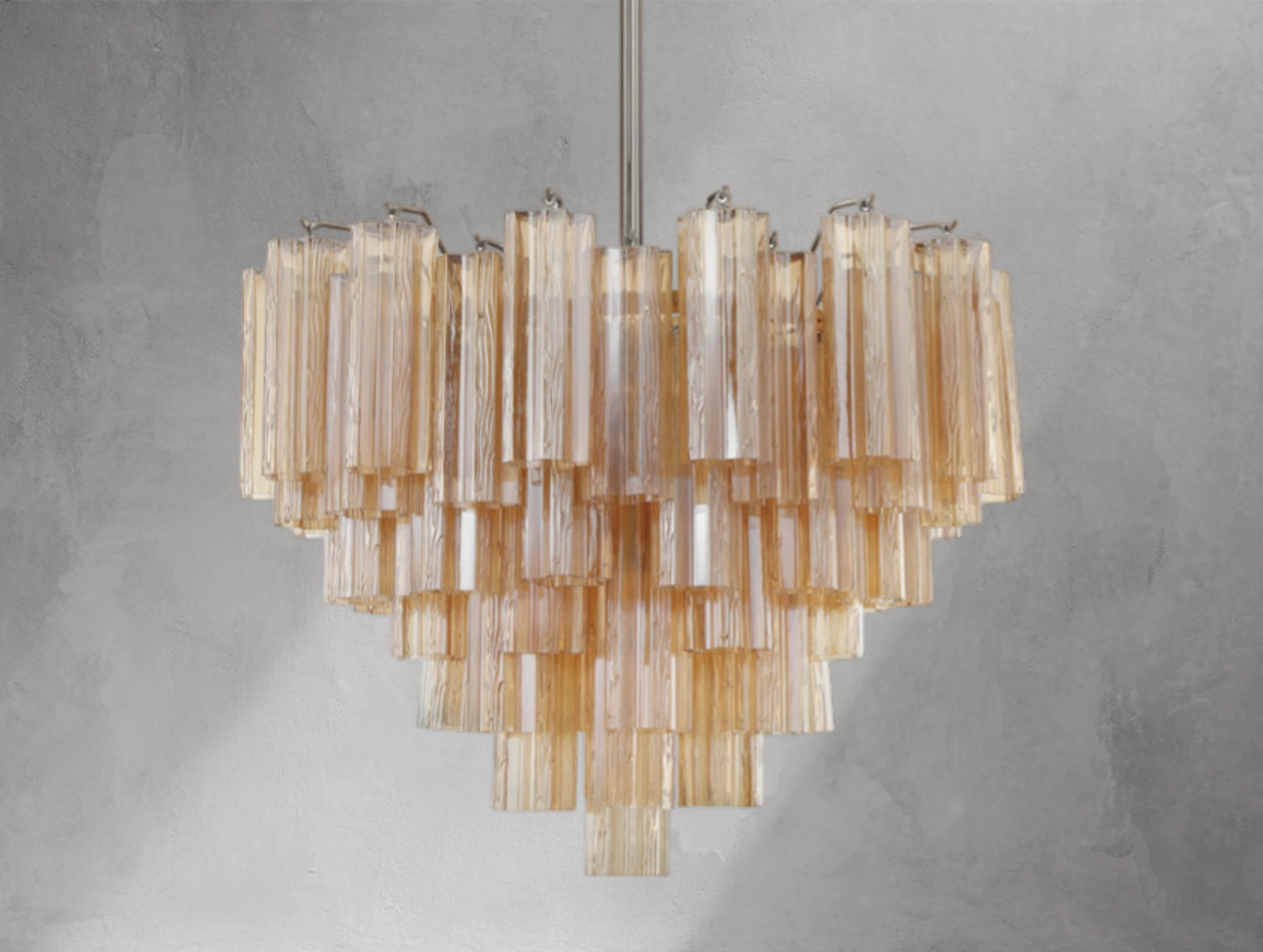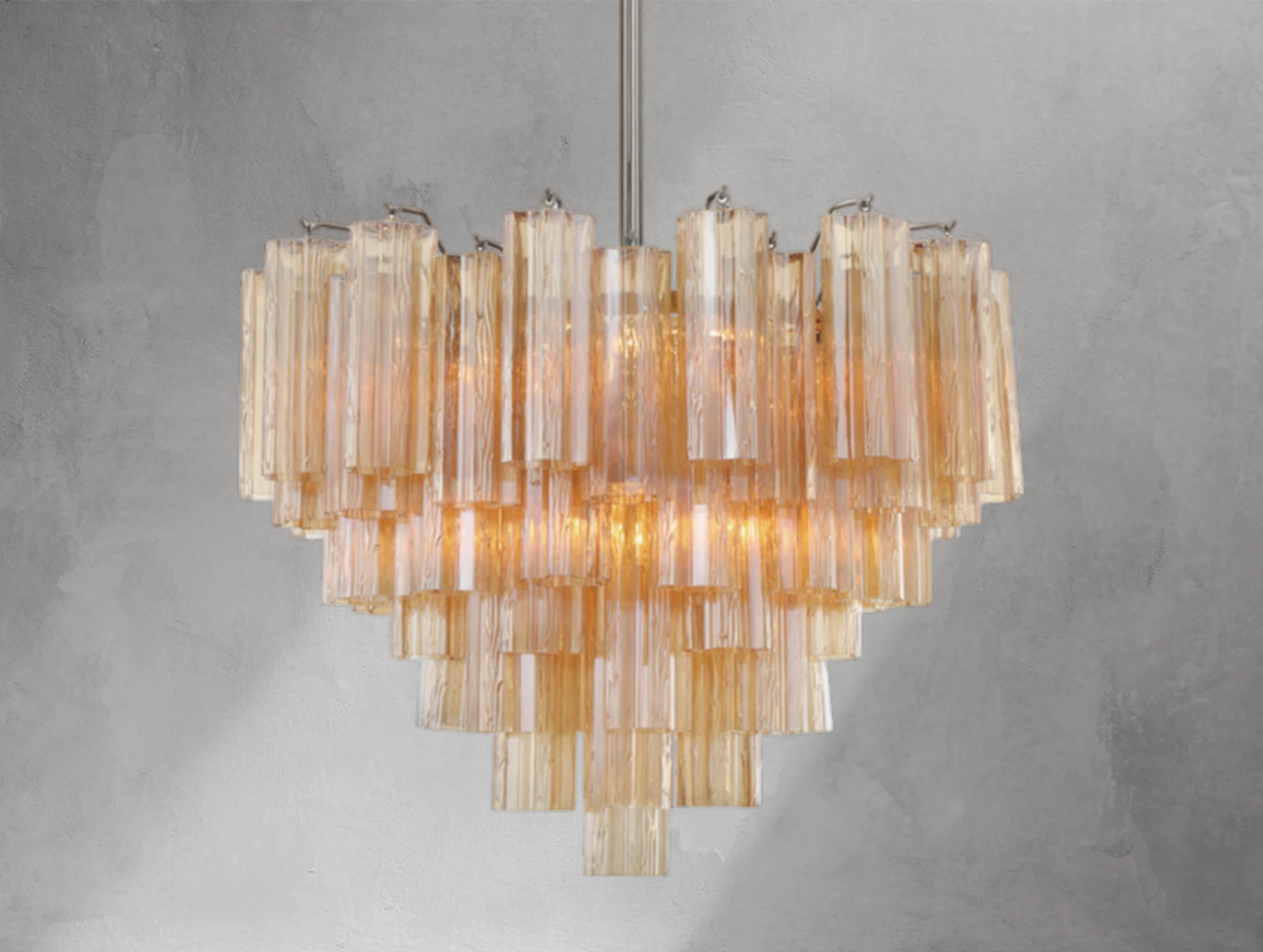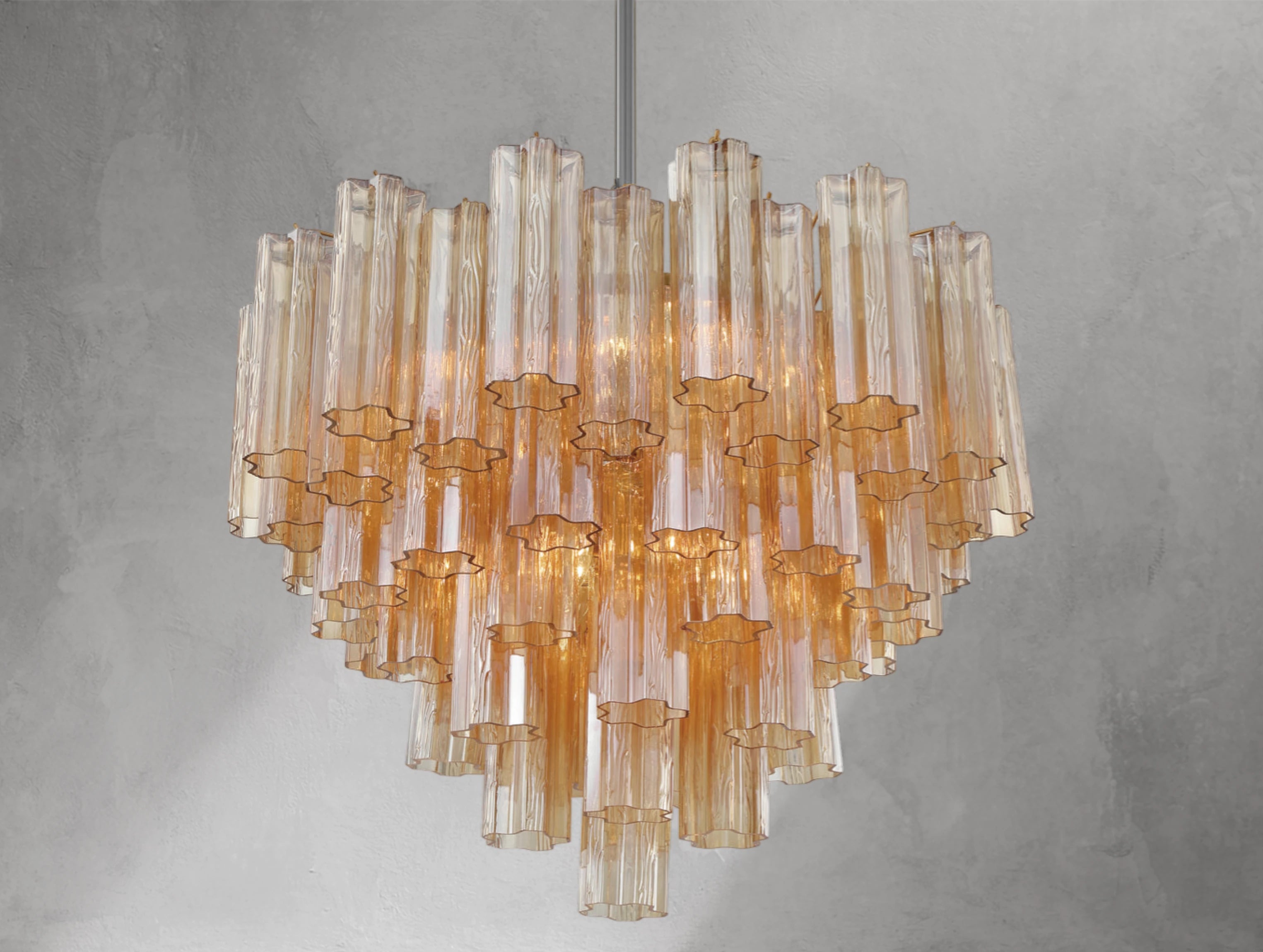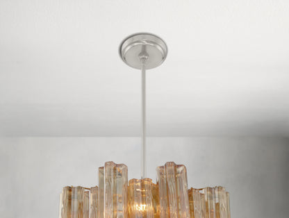 Each chandelier forms a five-point rounded star, adding sculptural beauty and radiant illumination to your space. Choose from clear, amber, smoke, white, or the captivating Autumn mix — a striking blend of amber, clear, and smoke glass.