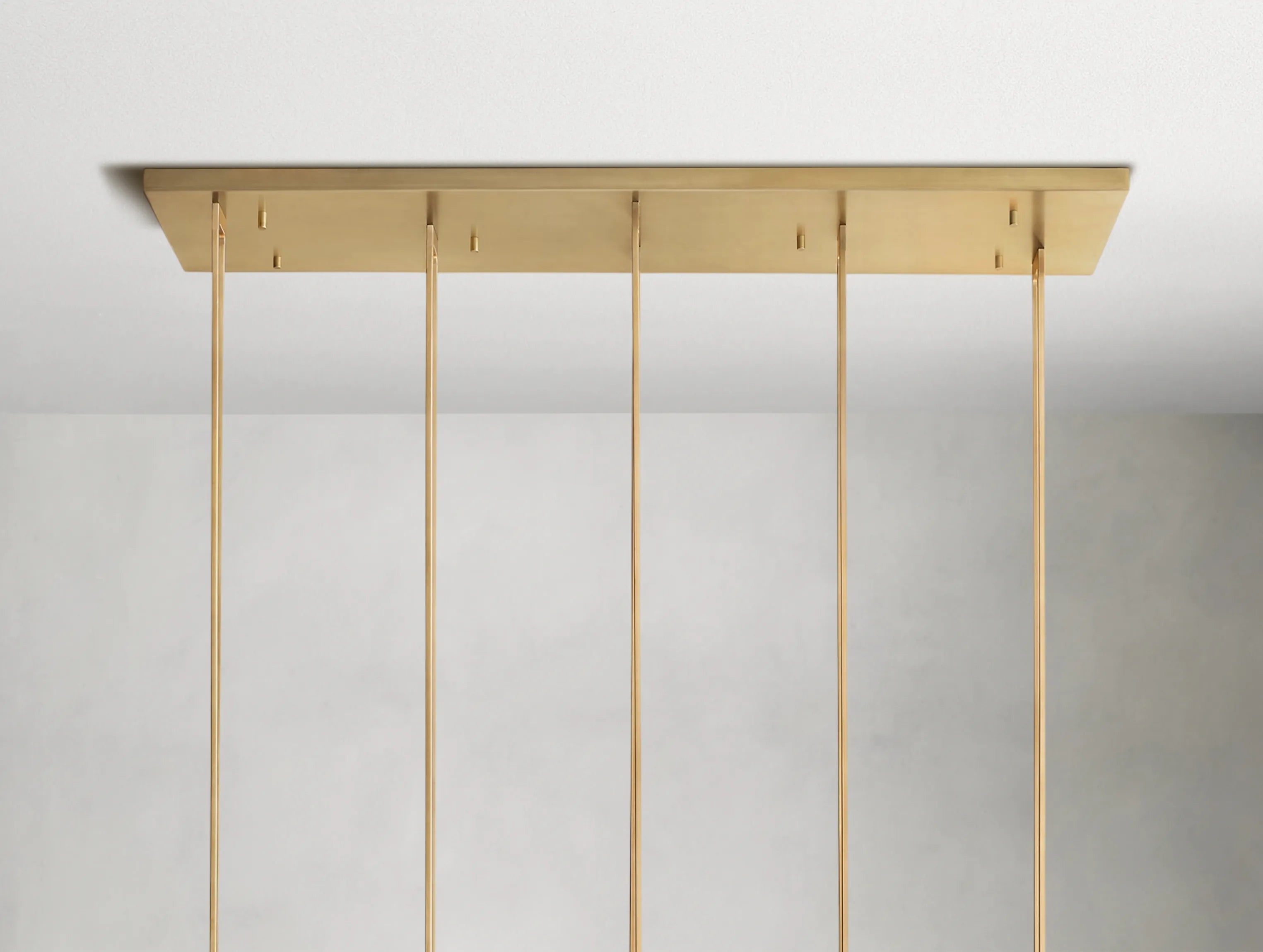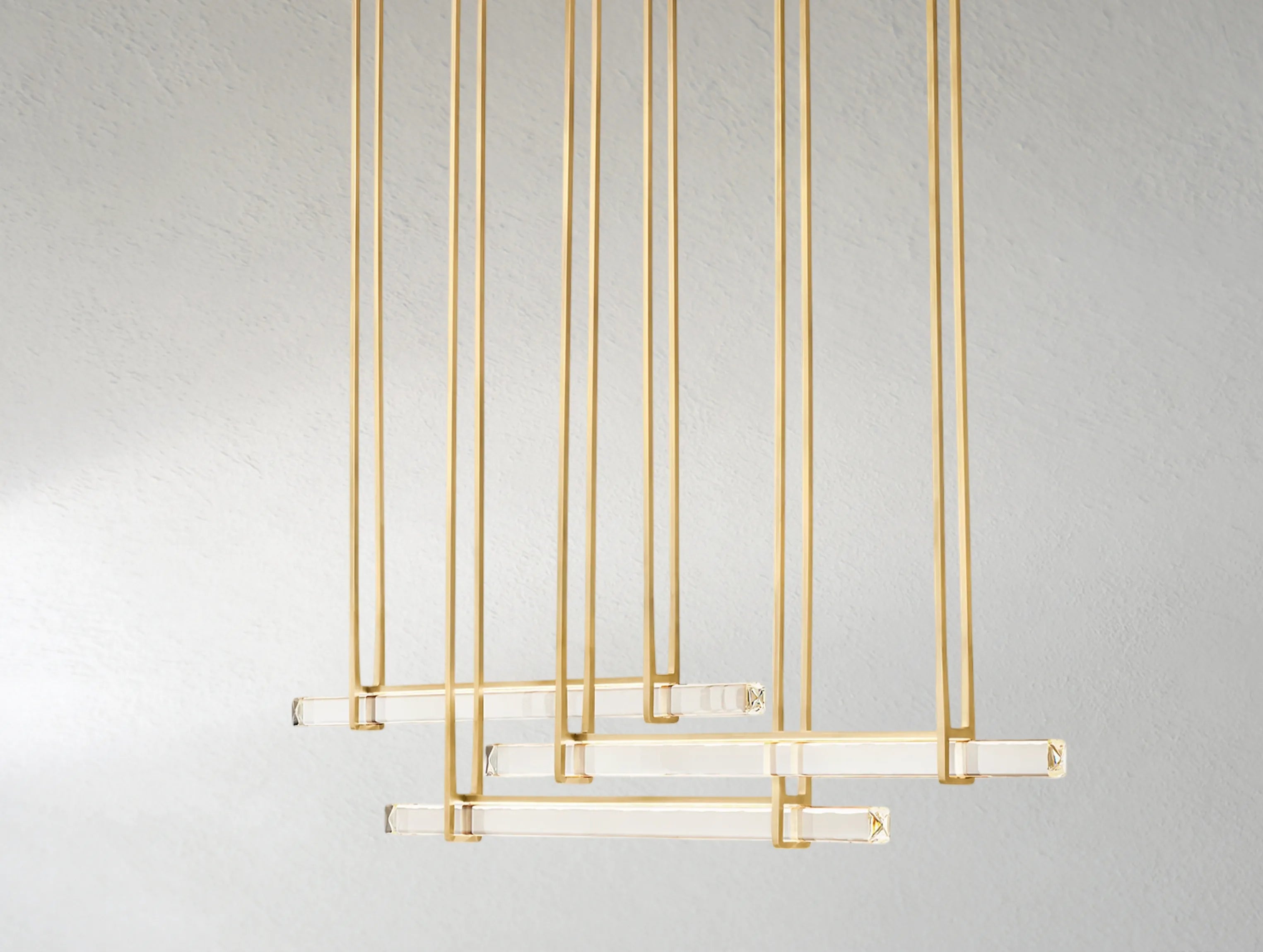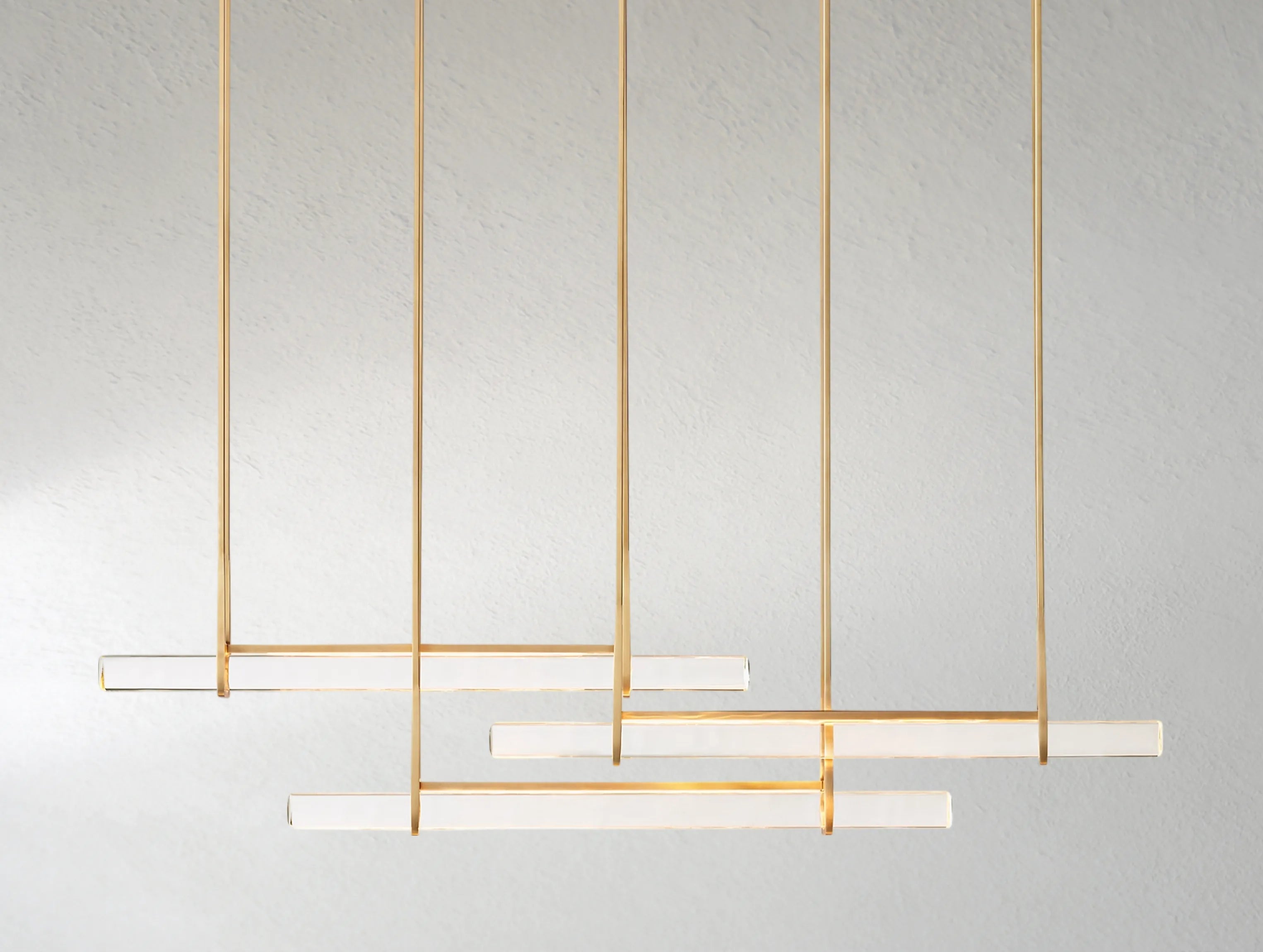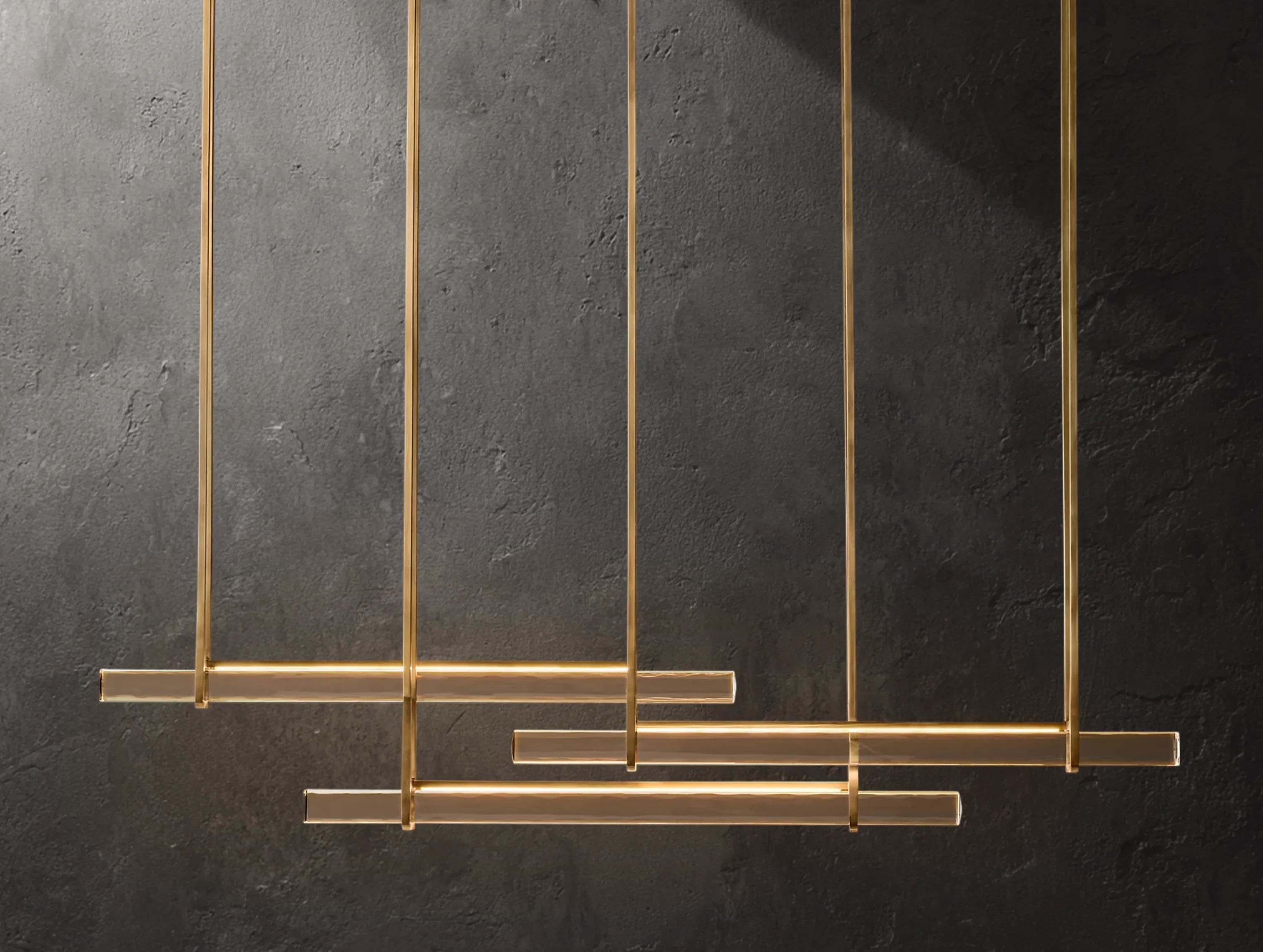 Inspired by 1960s Italian minimalism, the Ardenel Ardubon Horizontal Single Bar Chandelier features a seamless prism of hand-polished K9 crystal, appearing to float within a solid brass frame.
