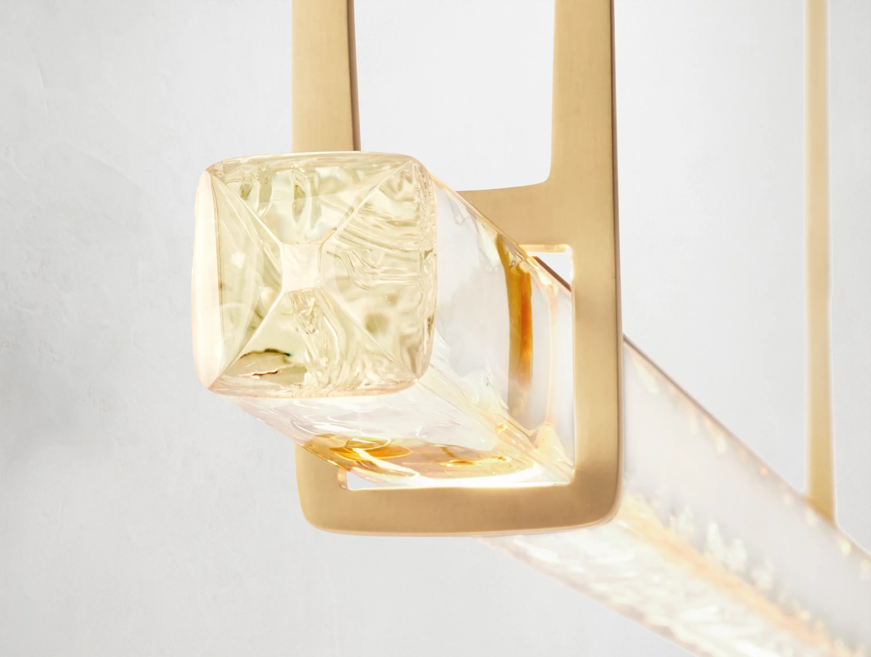 The crisp silhouette is refined yet dramatic, while the textured crystal refracts warm light from a concealed elongated LED. The result is a balanced composition of material and illumination—perfect above dining tables, kitchen islands, or any contemporary space seeking understated elegance.