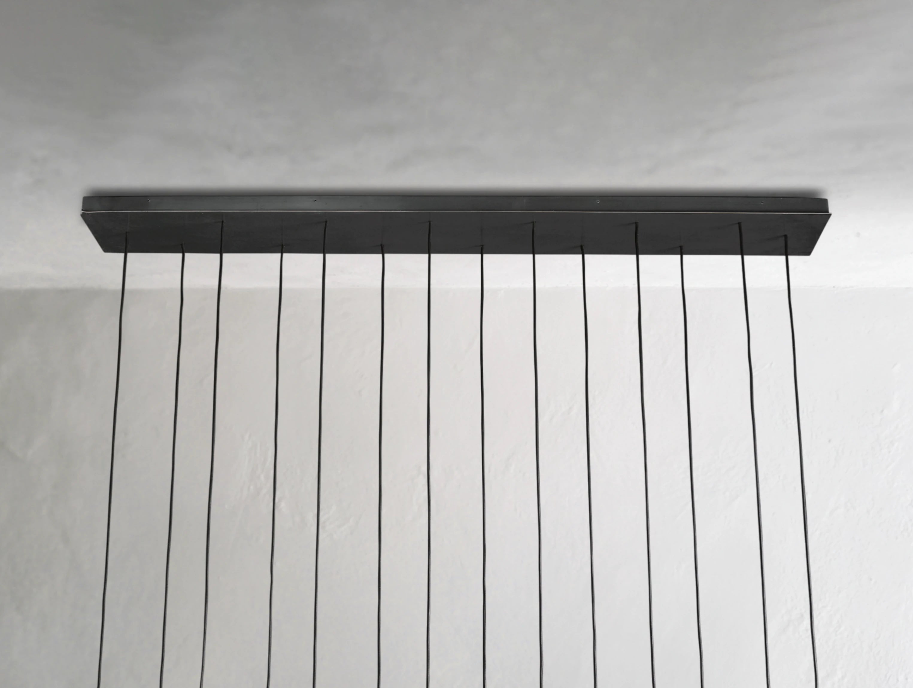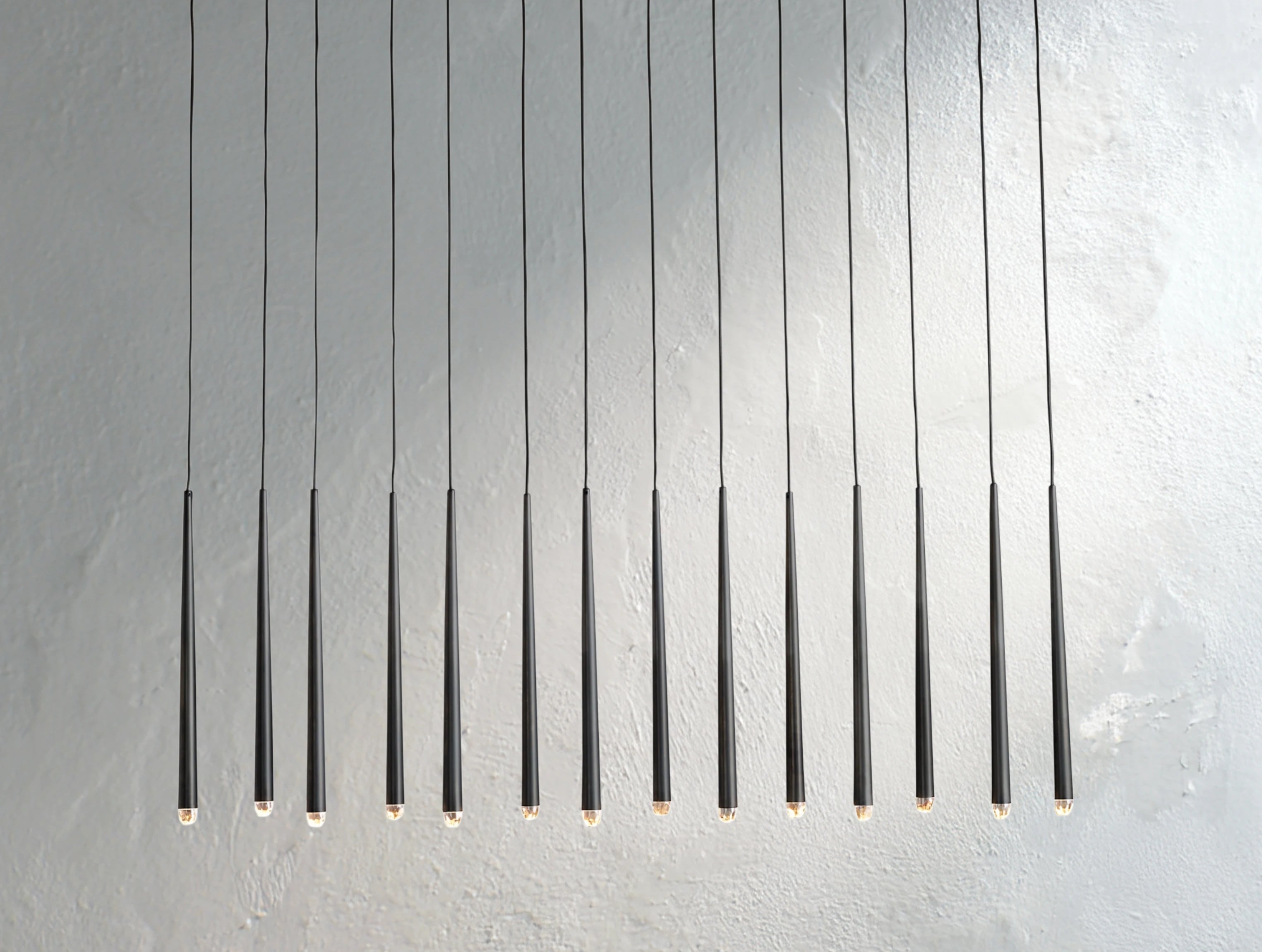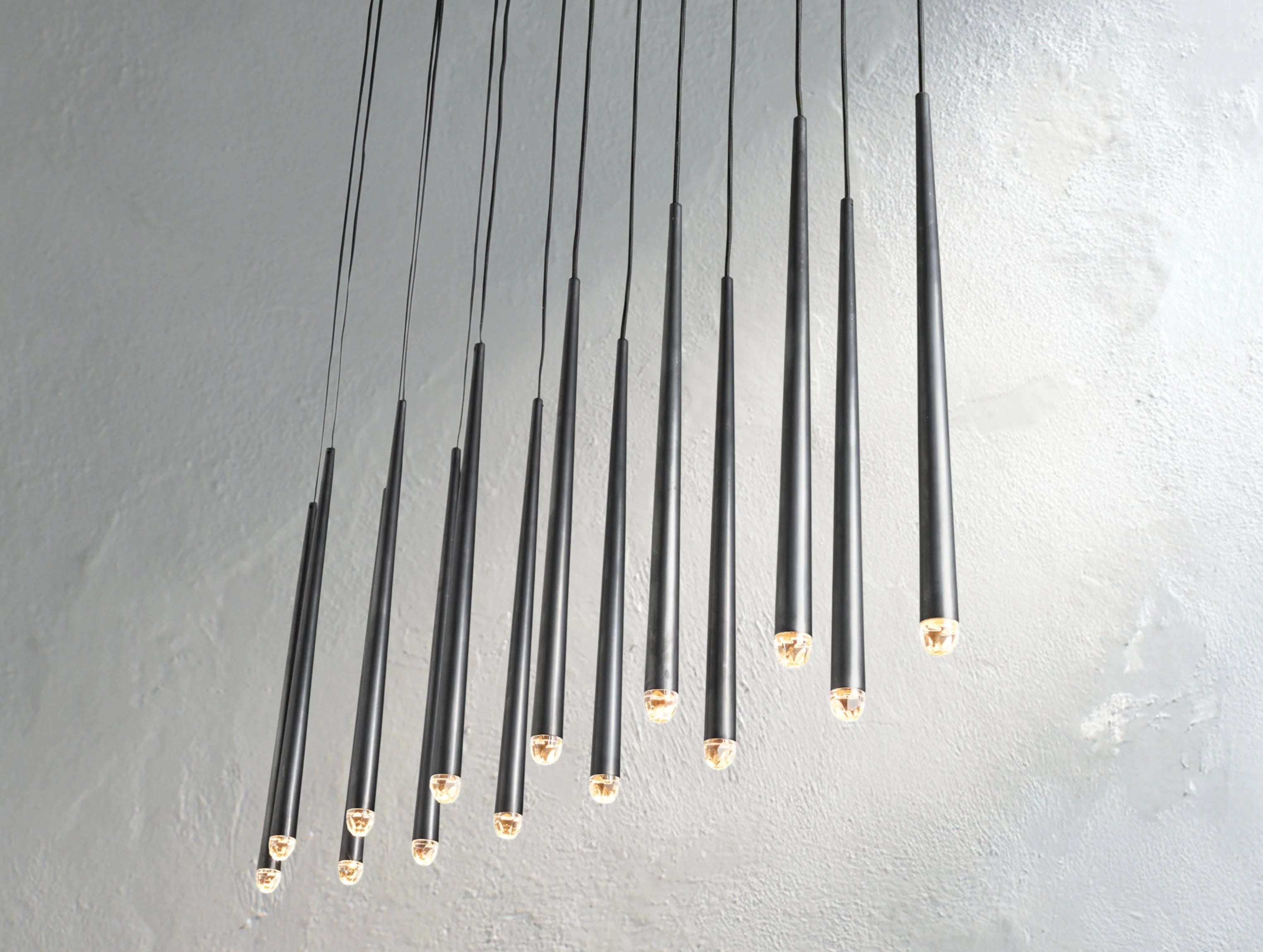 Inspired by the French minimalist lighting of the 1960s, this chandelier features sculptural brass forms suspended from slender black cords. Each faceted glass tip contains an inset LED, casting a warm, glowing light. The elongated silhouette is perfect over dining tables, kitchen islands, or any space that calls for refined modern drama.