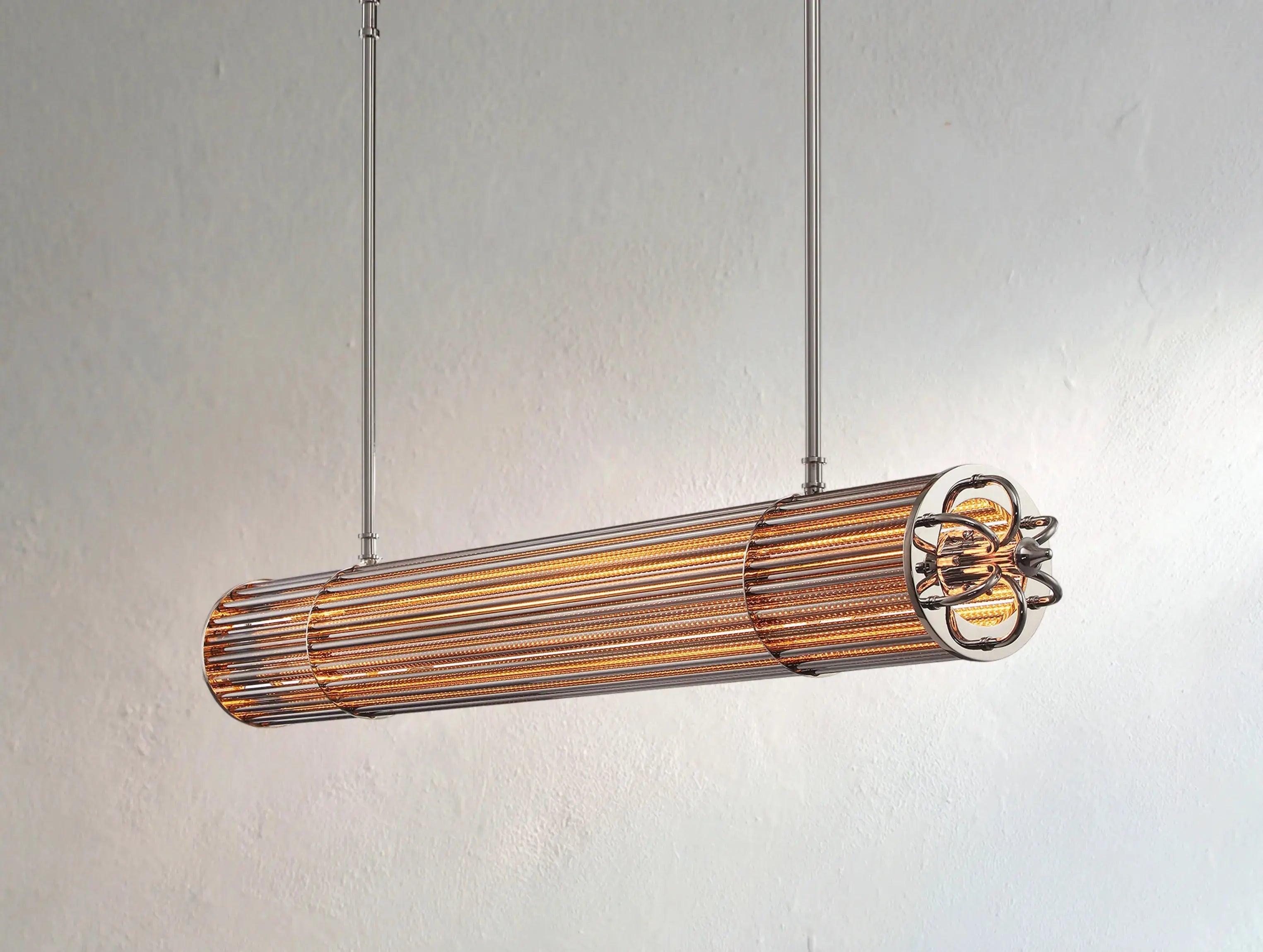 The bronze-plated finish adds a warm, timeworn character, while the linear silhouette makes it ideal for dining tables, kitchen islands, or any space that calls for a sculptural centerpiece. As light diffuses gently through the polished glass, Astrolume transforms the atmosphere—inviting wonder, elegance, and conversation.