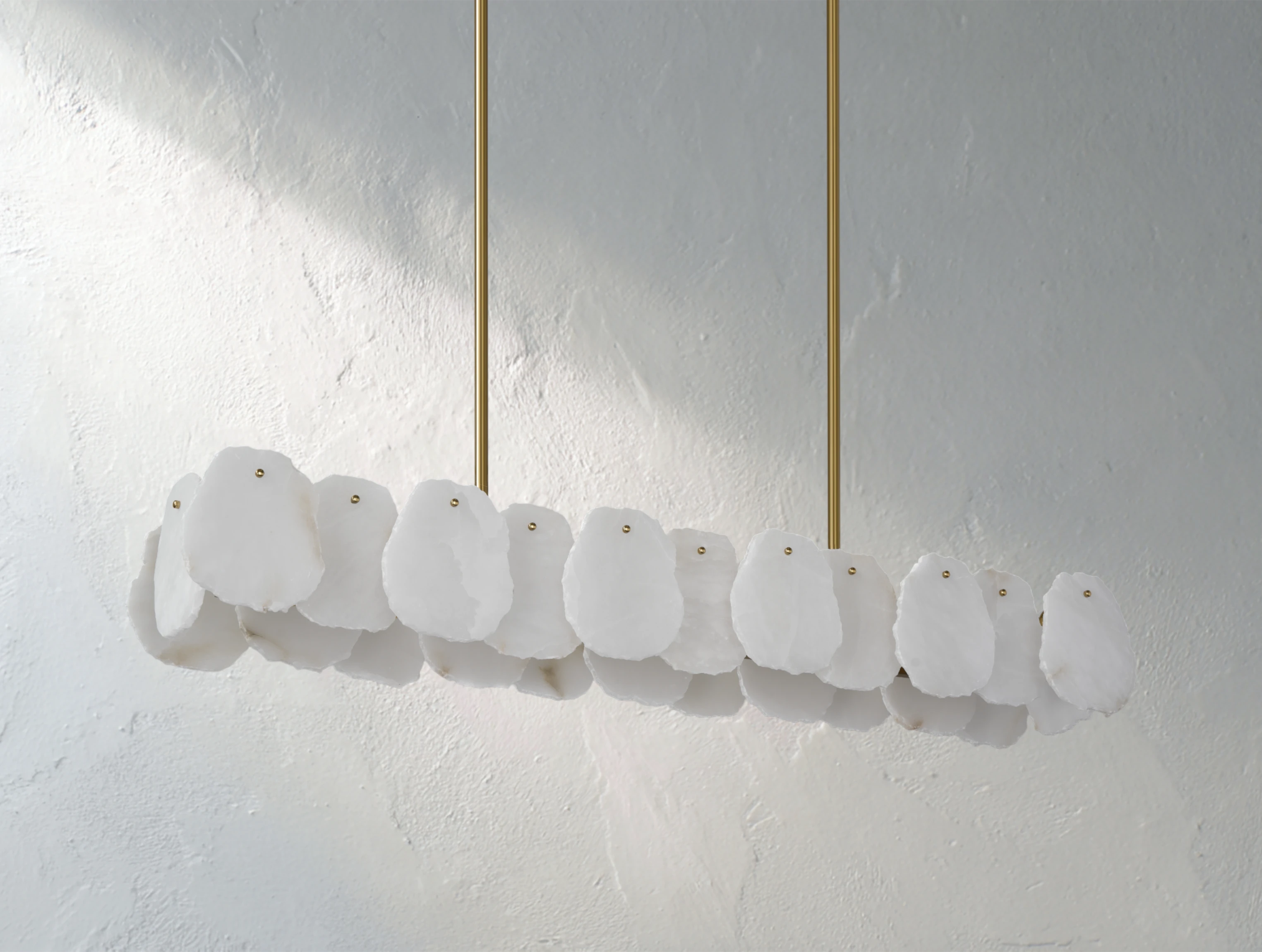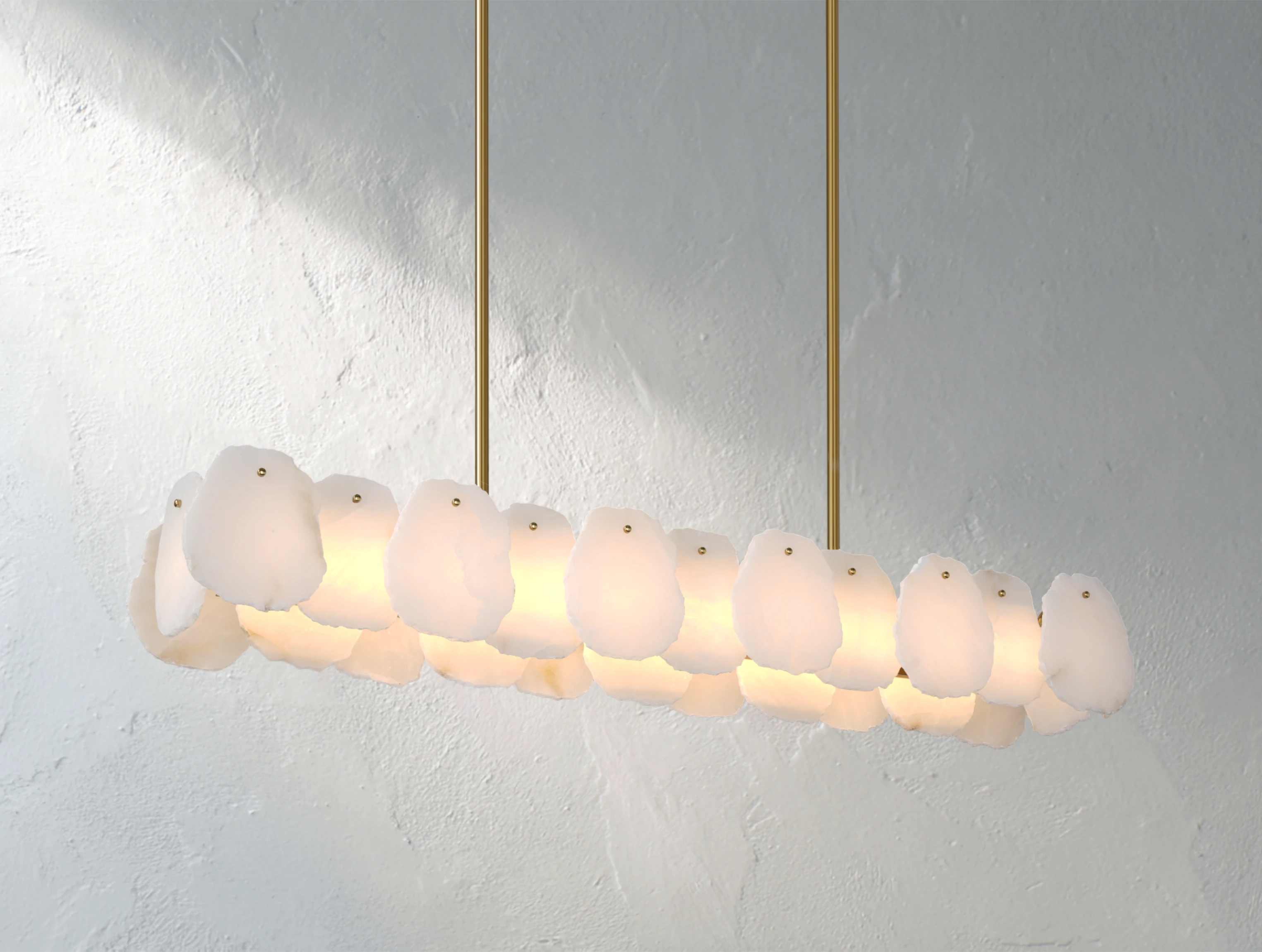 This linear alabaster chandelier draws inspiration from the motion of celestial orbits, translating concentric forms into a refined horizontal composition. Hand-carved alabaster elements are paired with a streamlined metal frame, softly diffusing light to create an even, lunar-like glow. Its elongated silhouette makes it an elegant choice for dining tables, kitchen islands, or long architectural spaces where sculptural presence and ambient lighting work in harmony.
