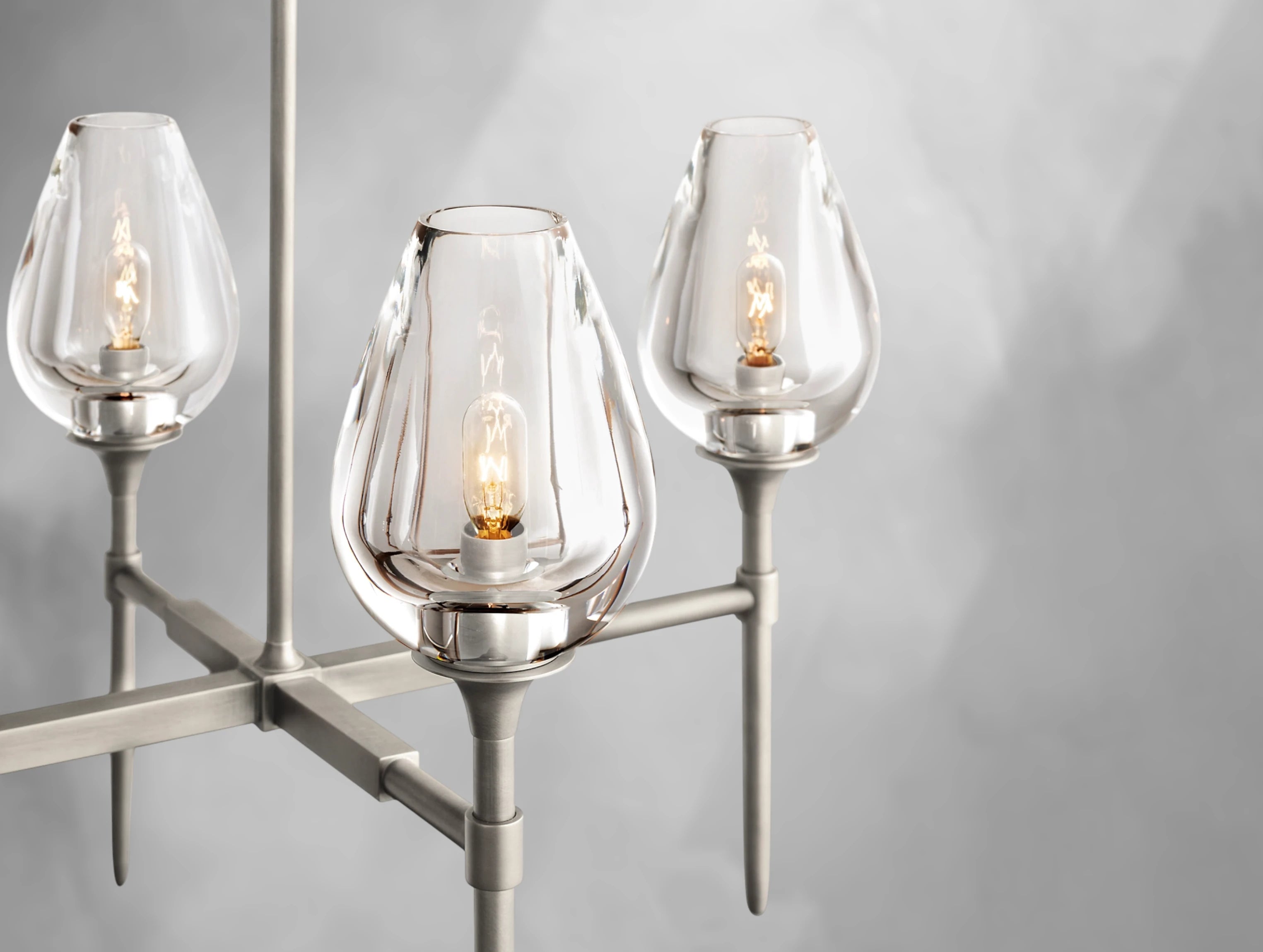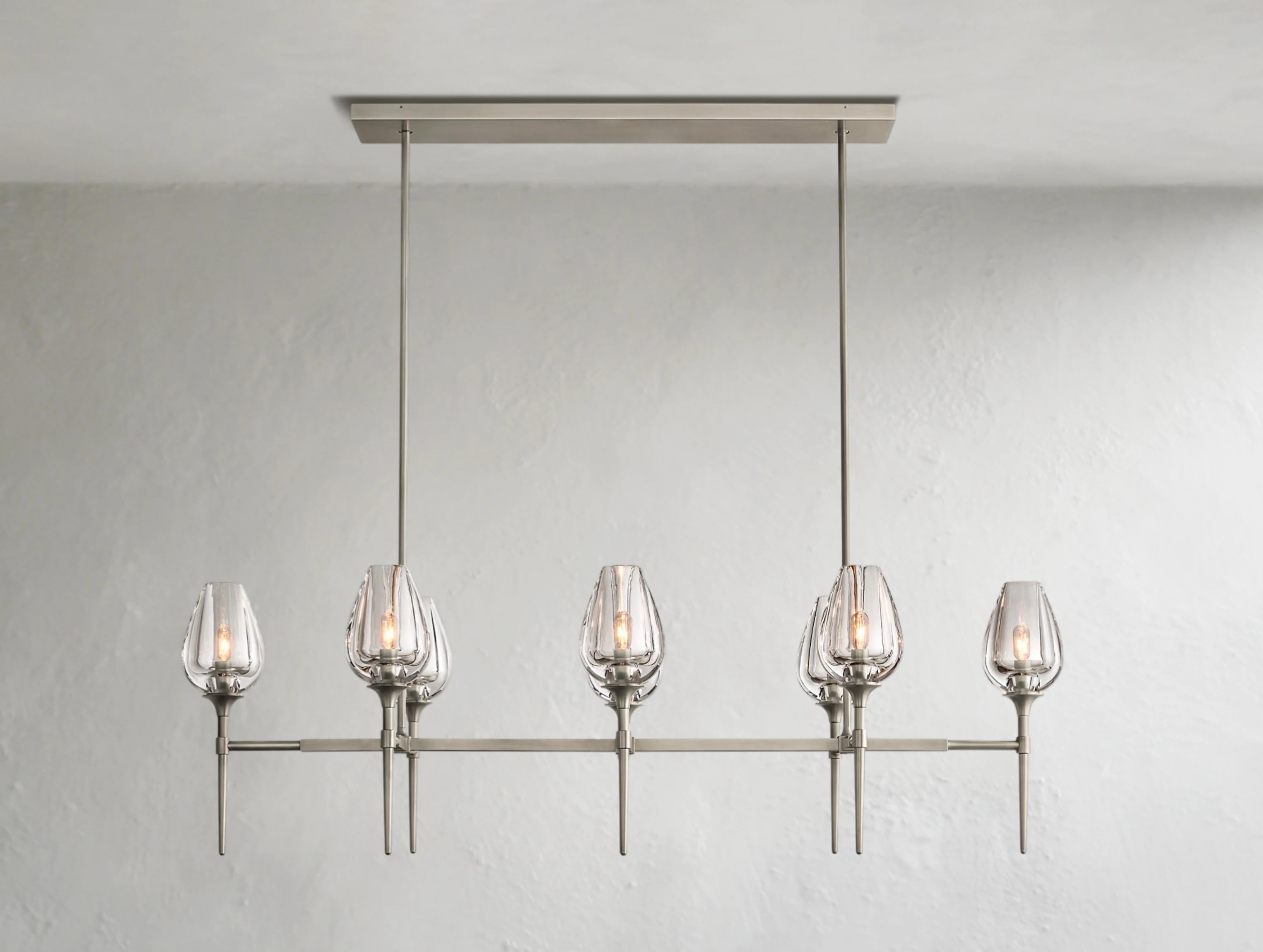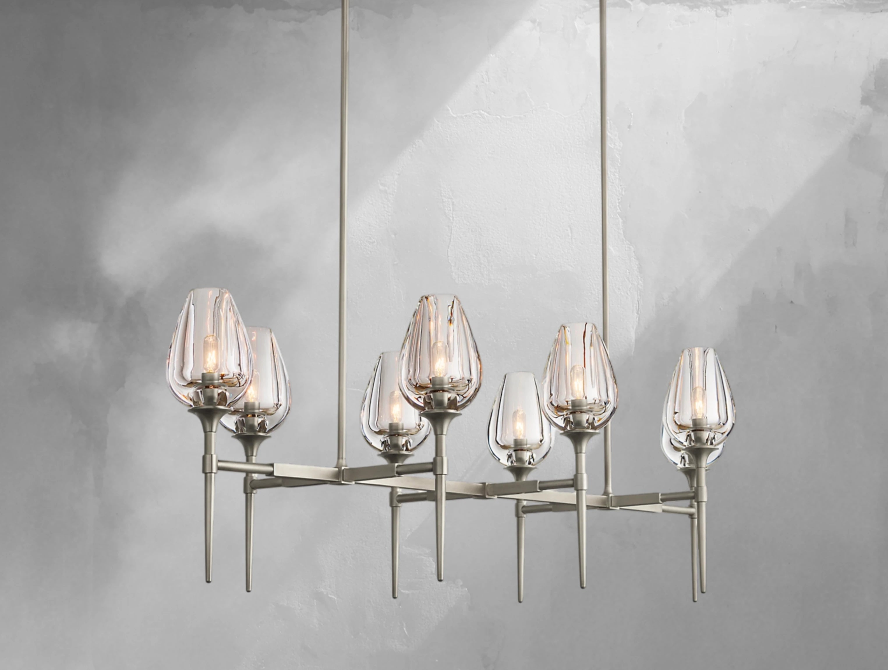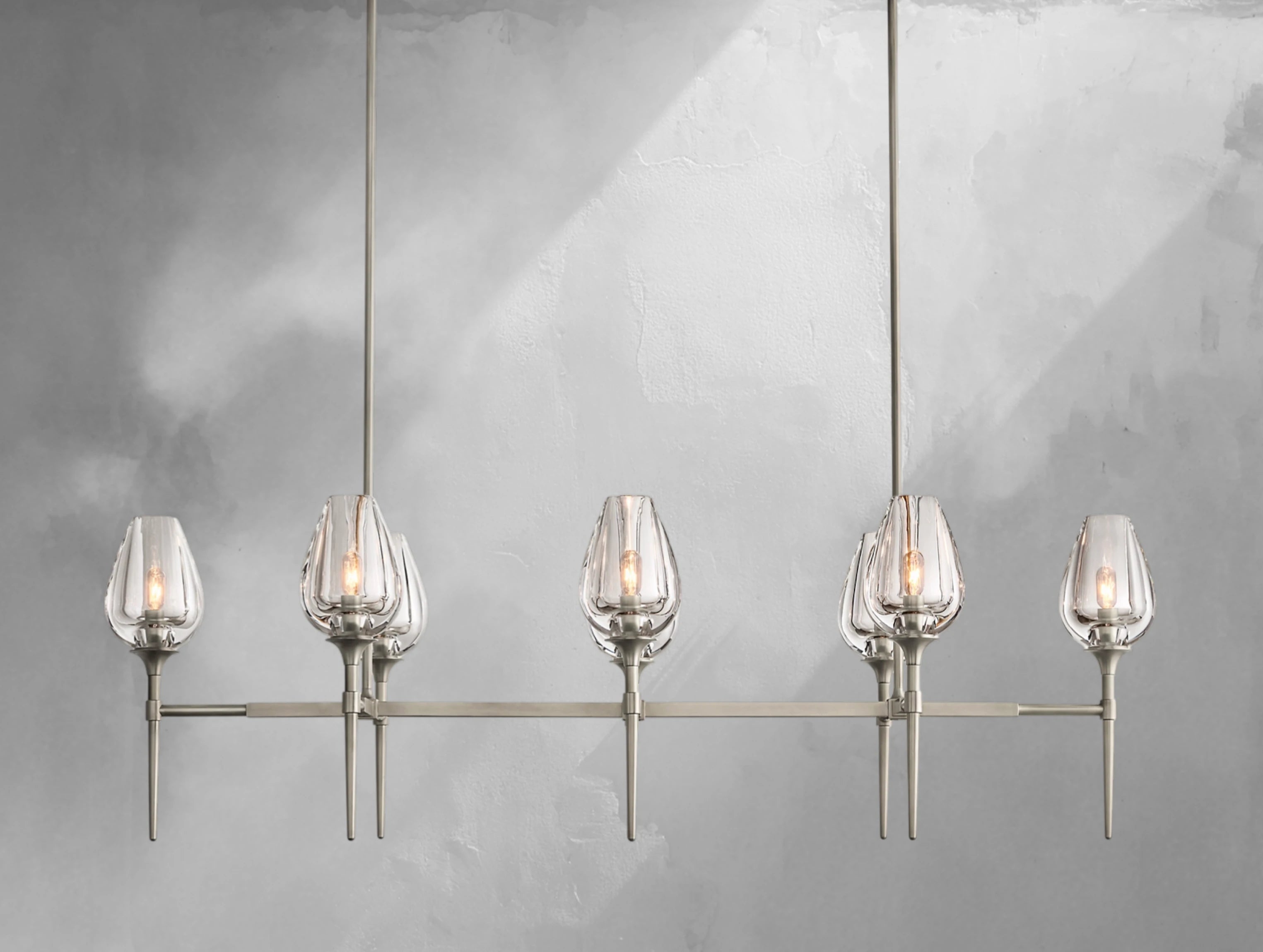 Inspired by the graceful form of tulip petals, this chandelier by master glass artisans captures the beauty of nature in light. Each substantial crystal torchère is lathe-carved from a solid block and hand-polished to reveal soft, petal-like contours that glow warmly when illuminated. Supported by a handcrafted brass frame, the elongated linear design makes an elegant statement above dining tables, kitchen islands, or long living spaces.