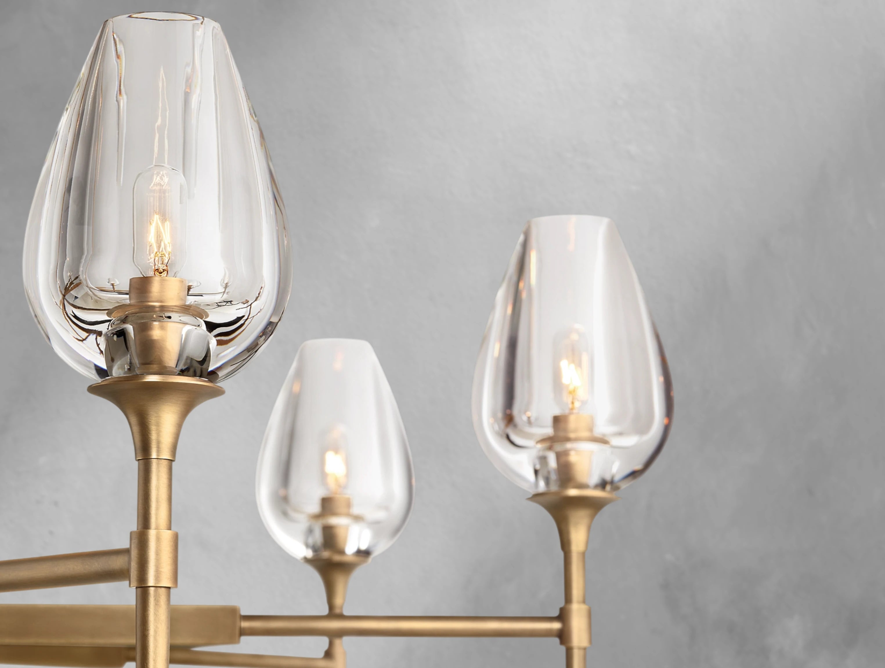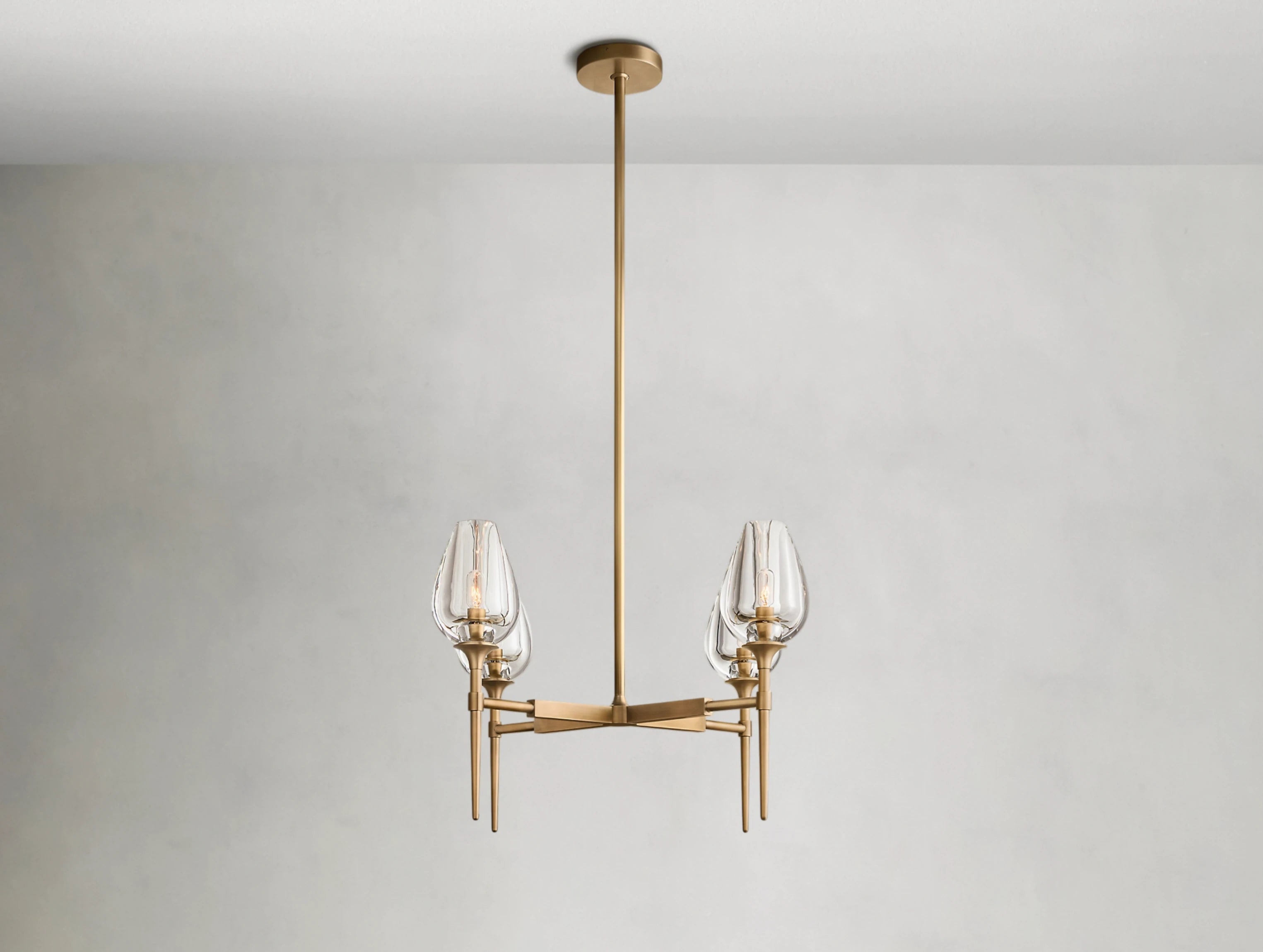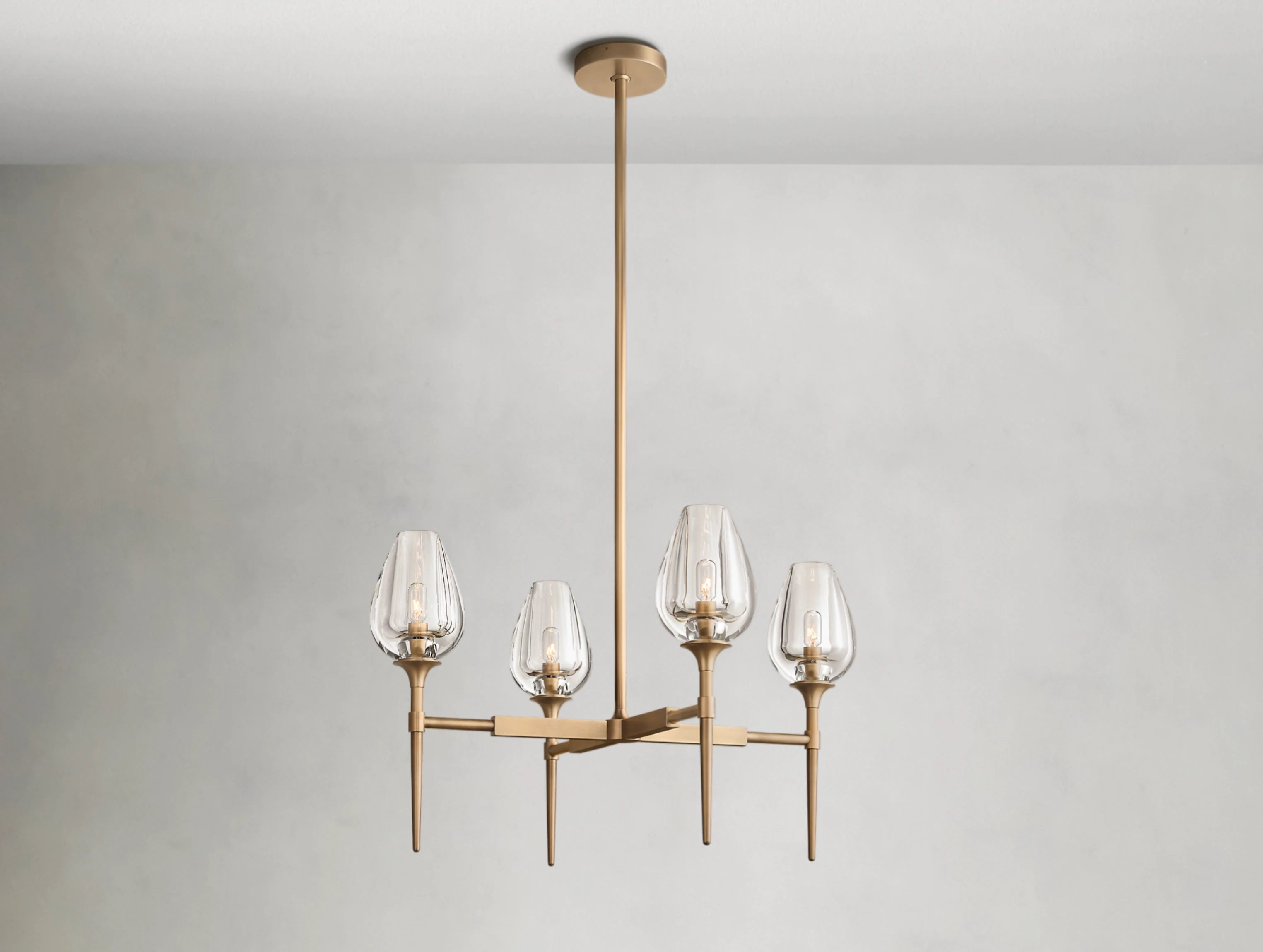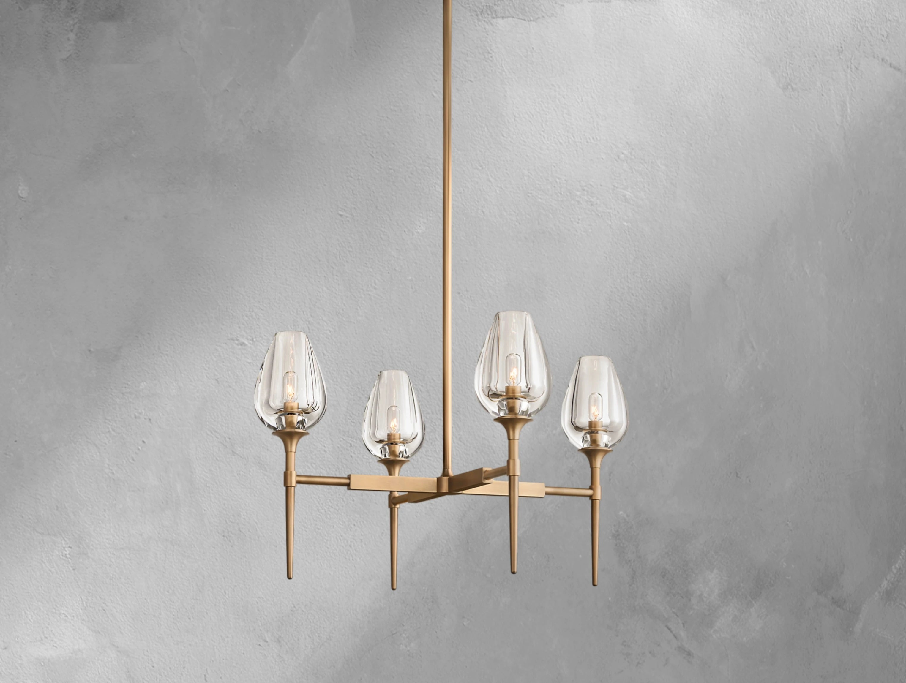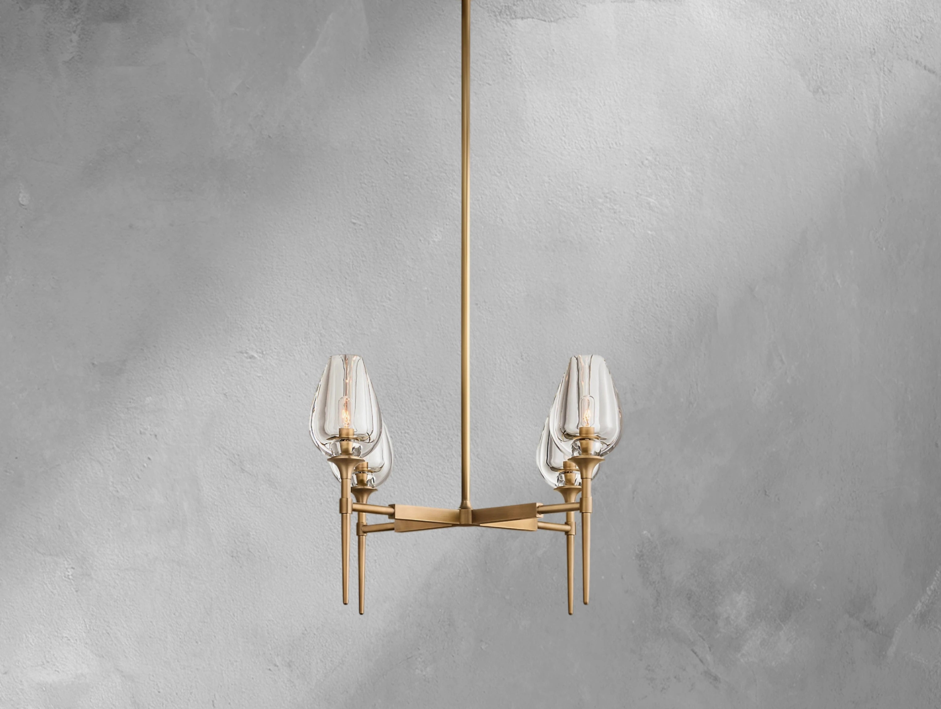 Inspired by a tulip in bloom, this chandelier by master glass artisans captures the organic beauty of nature in crystal. Each lathe-carved glass torchère is shaped from a solid block of crystal, hand-polished to reveal petal-like contours that glow with warmth when lit. Supported by a solid brass frame, the design balances sculptural elegance with atmospheric light.