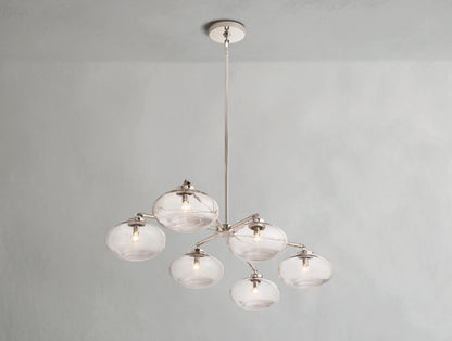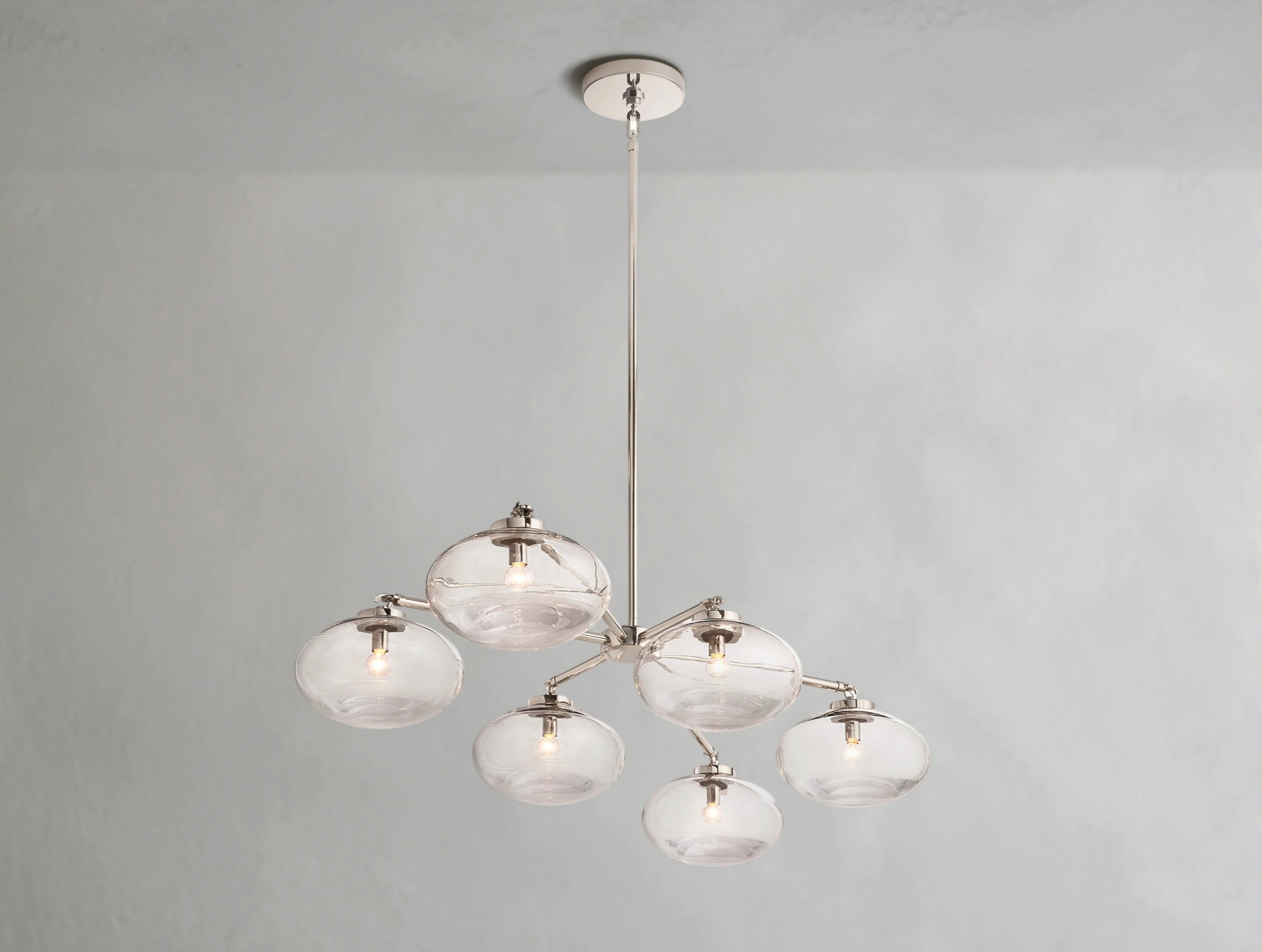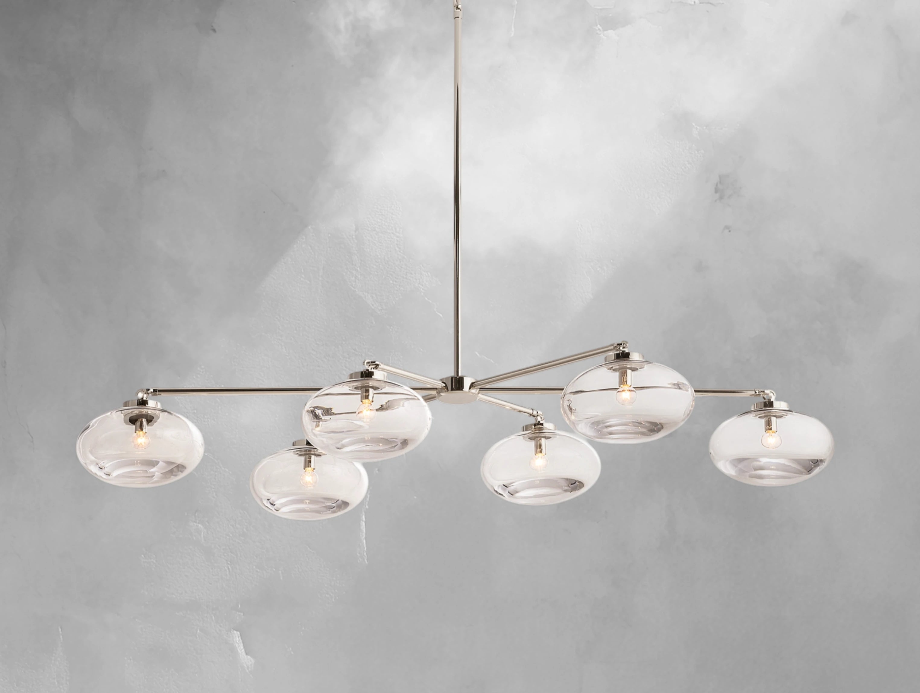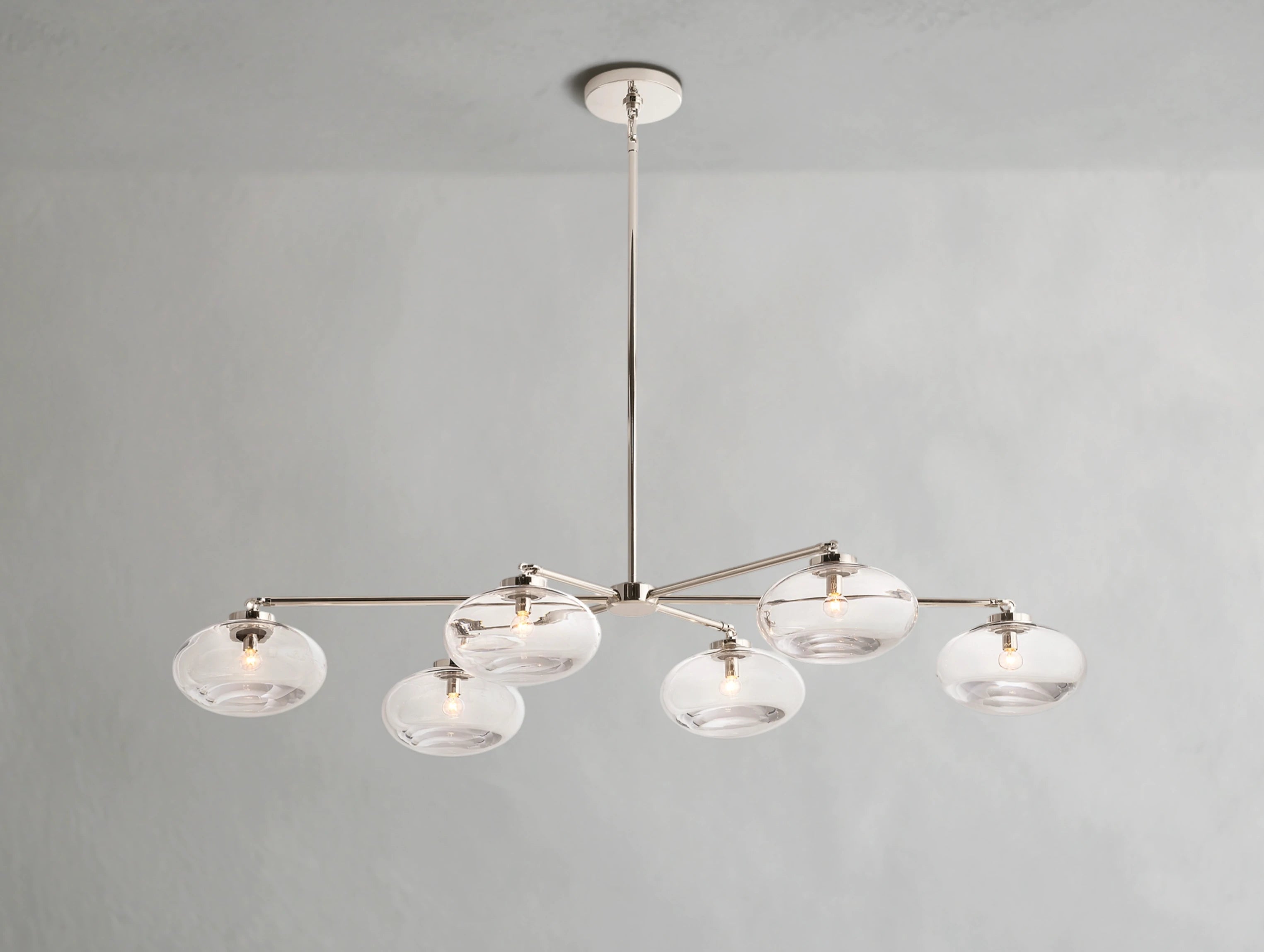An exploration of form and restraint, the Cabret Linear Chandelier features six oval glass globes suspended in seamless alignment. Handblown and delicately anchored to slender steel arms, each globe appears to float midair—lightweight in spirit, yet grounded in exceptional craftsmanship. Designed in San Francisco by Jonathan Browning, it’s a sculptural statement for dining rooms, kitchen islands, and beyond.
