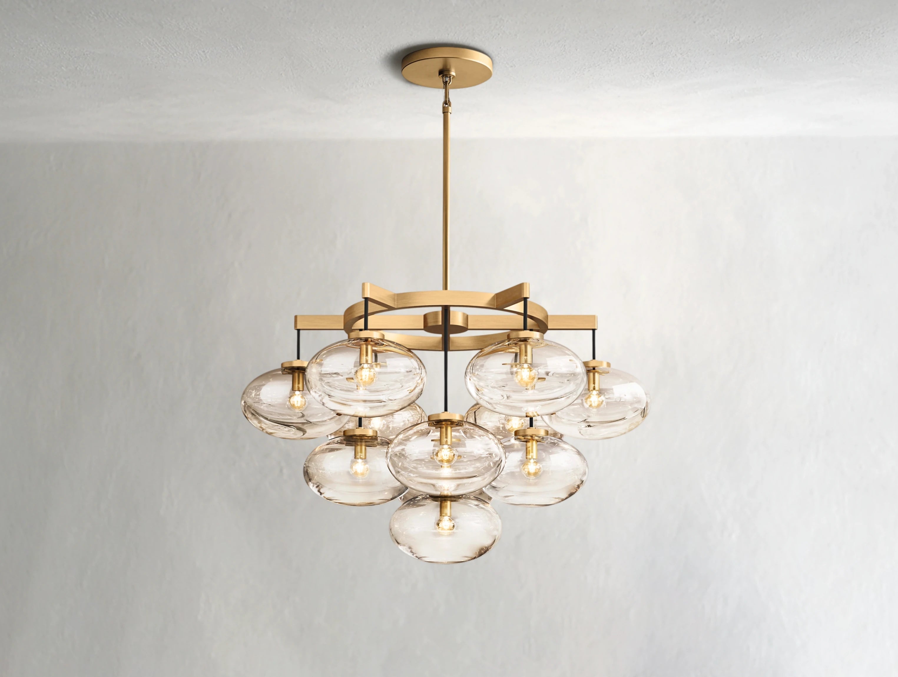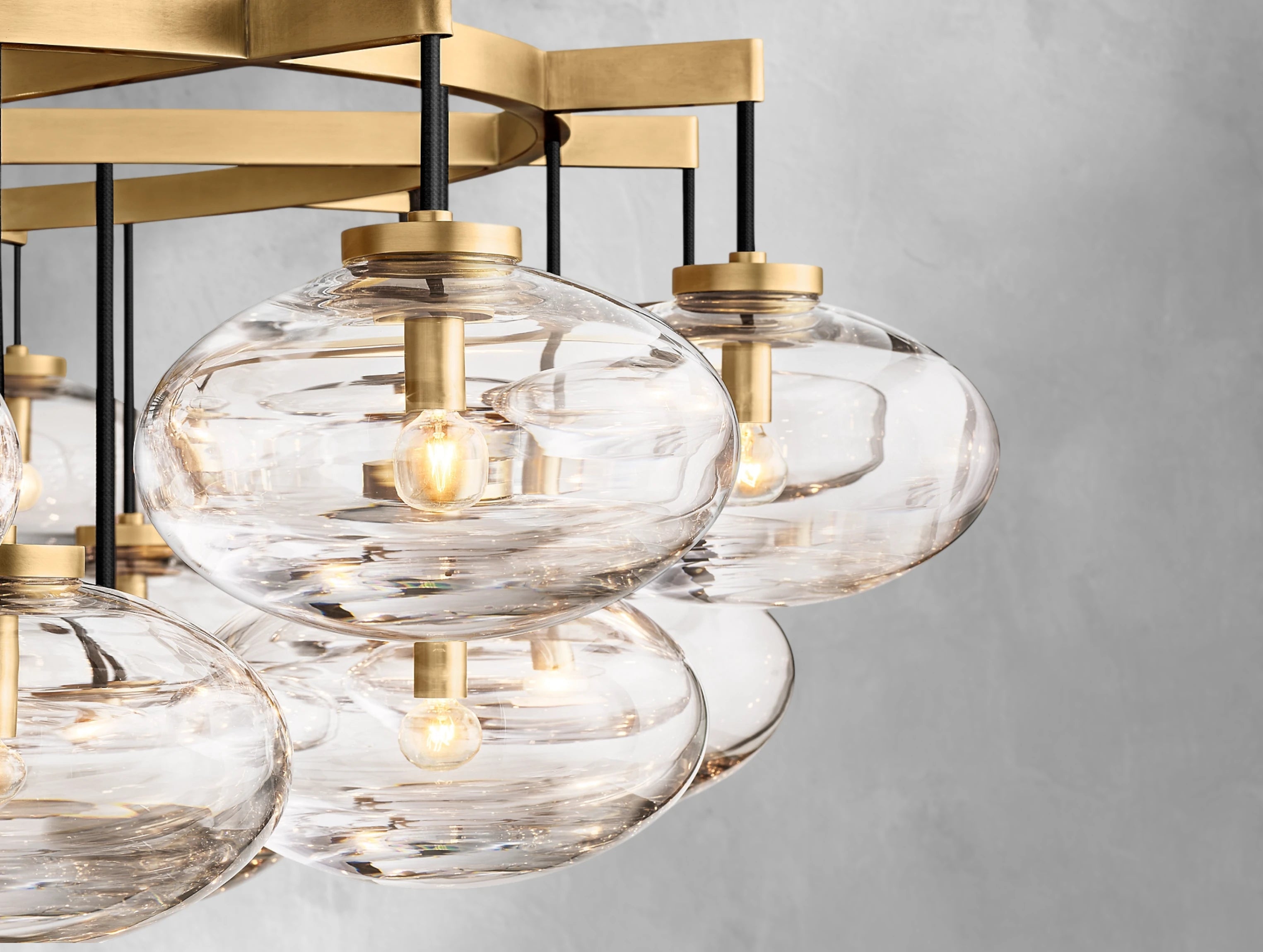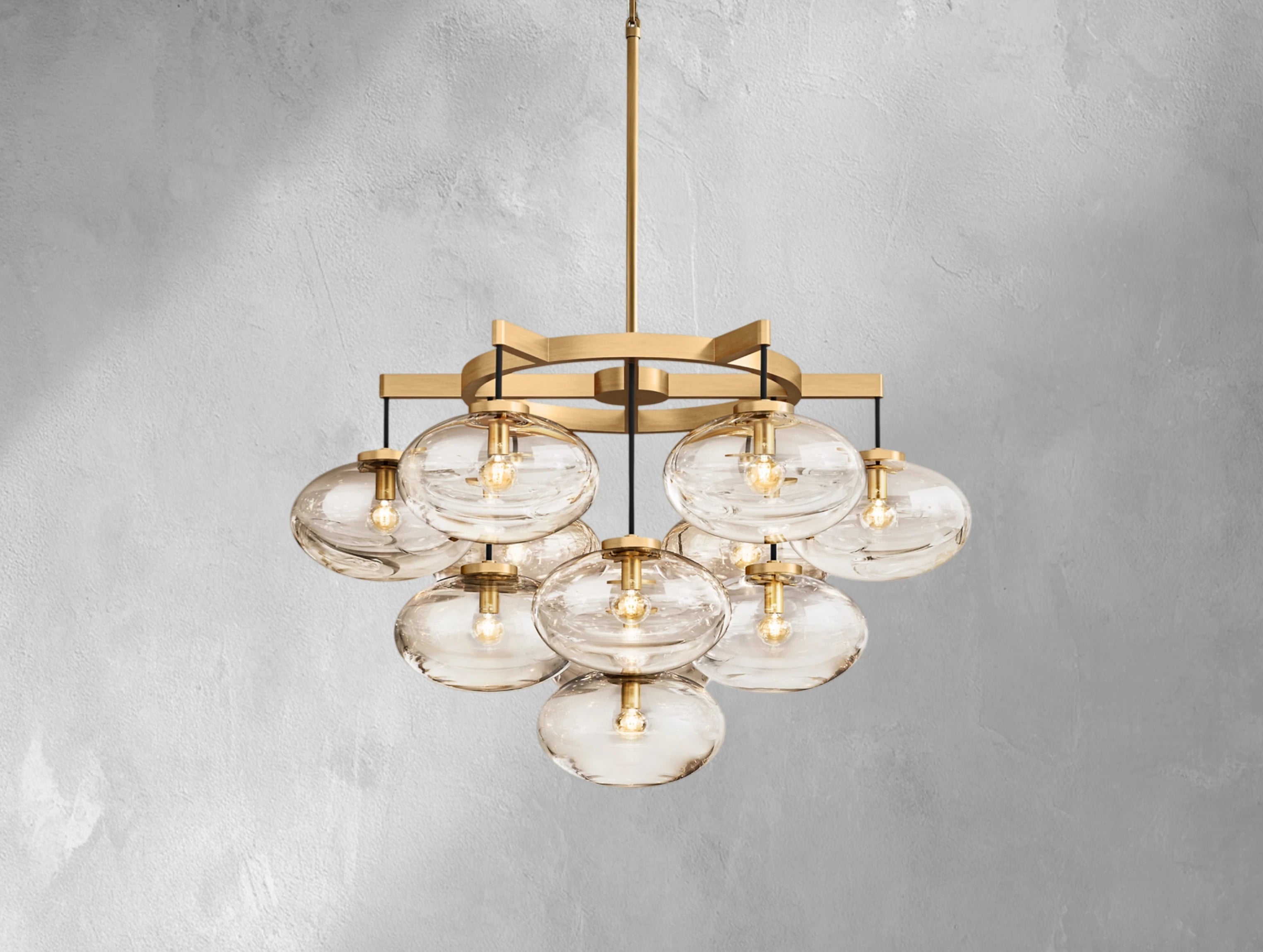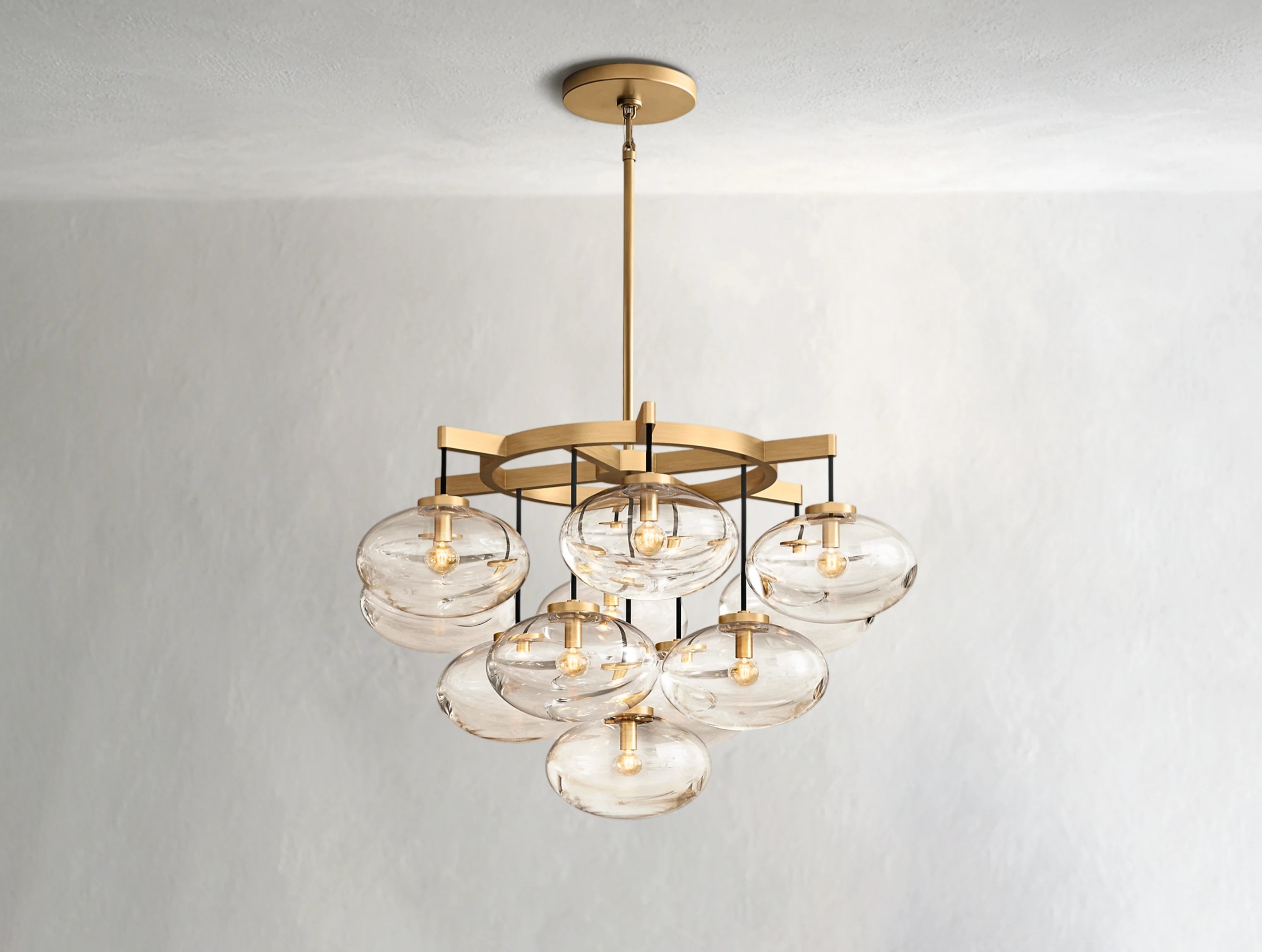 Oval glass globes appear to float effortlessly, suspended from slender cords and anchored by a sleek industrial frame. A modern take on balance and minimalism, this chandelier adds sculptural light and refined presence to any room.