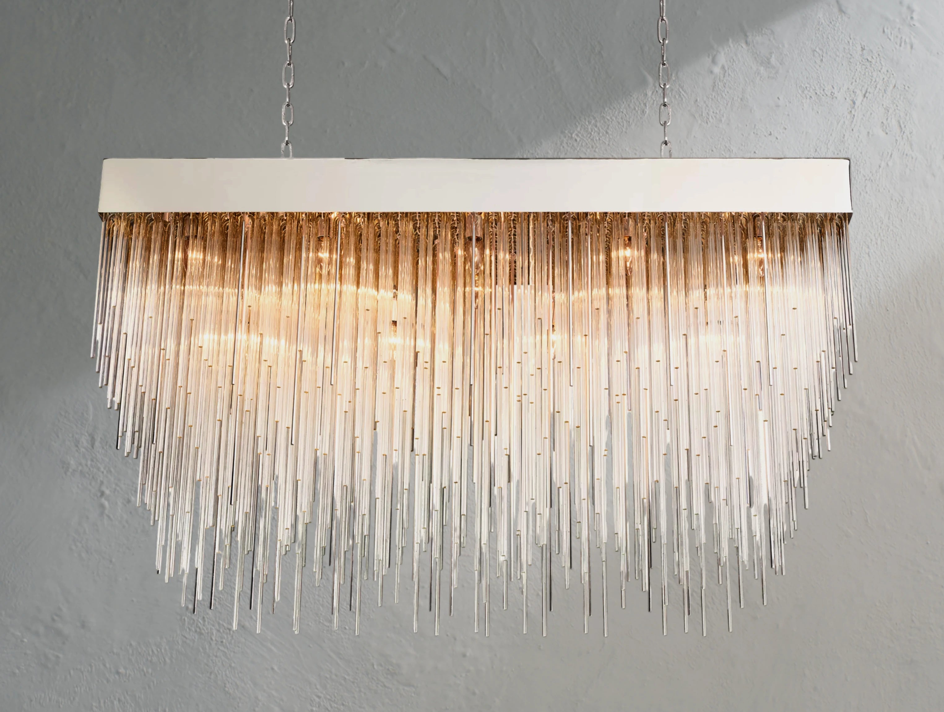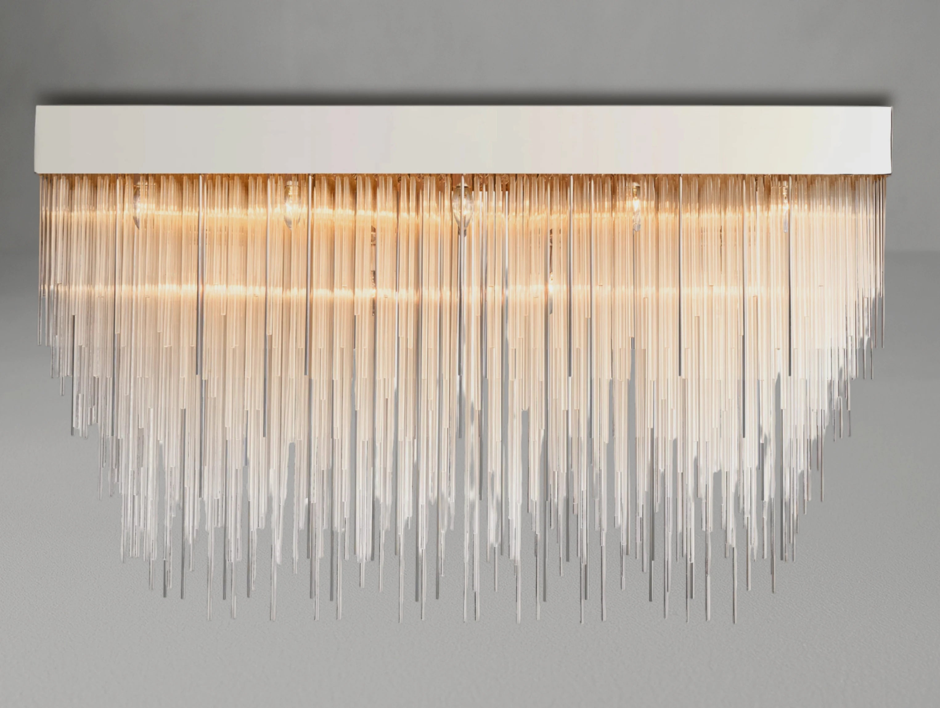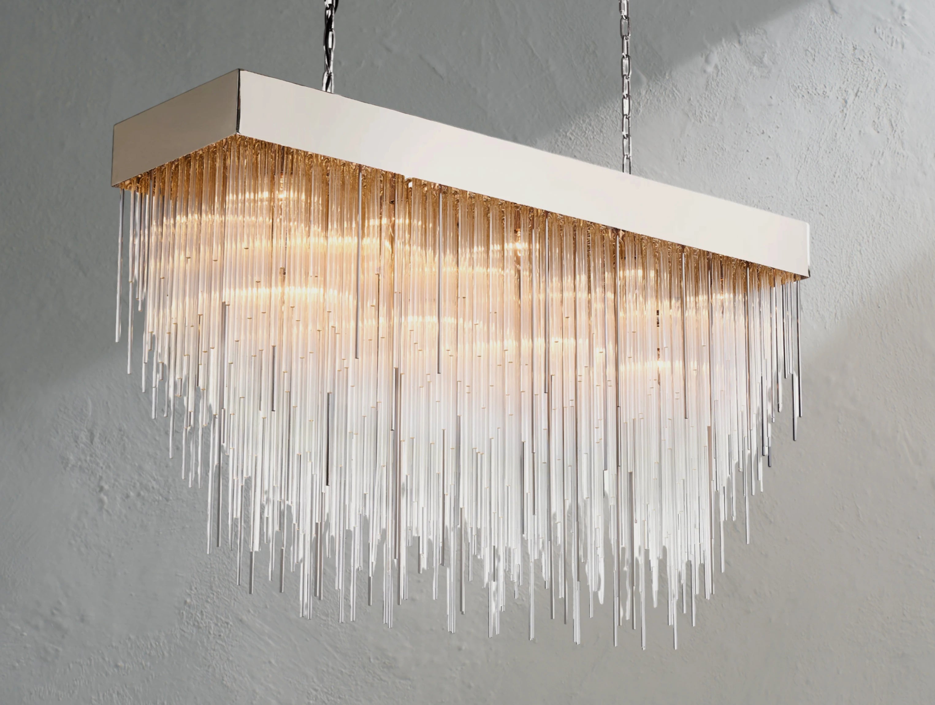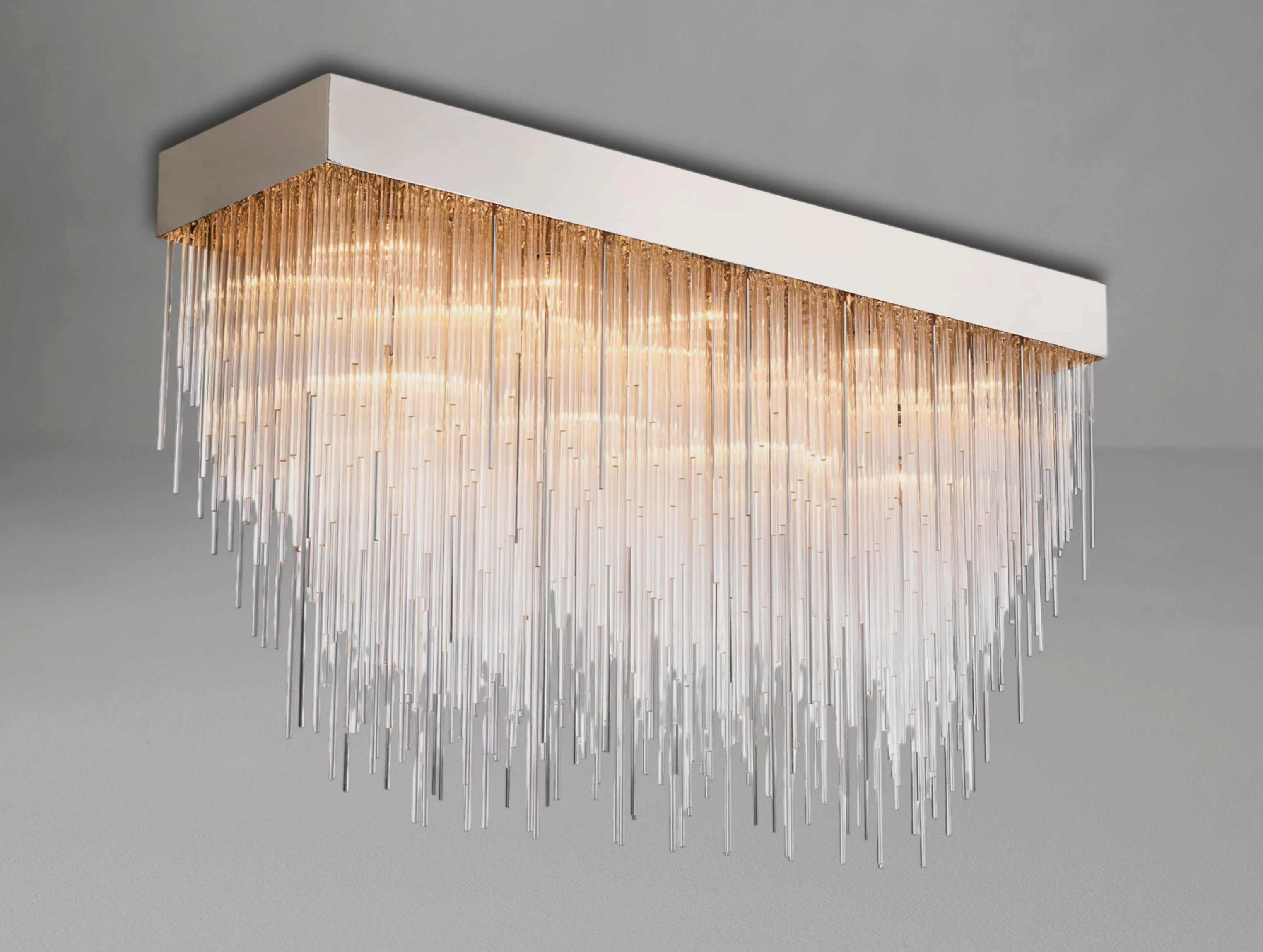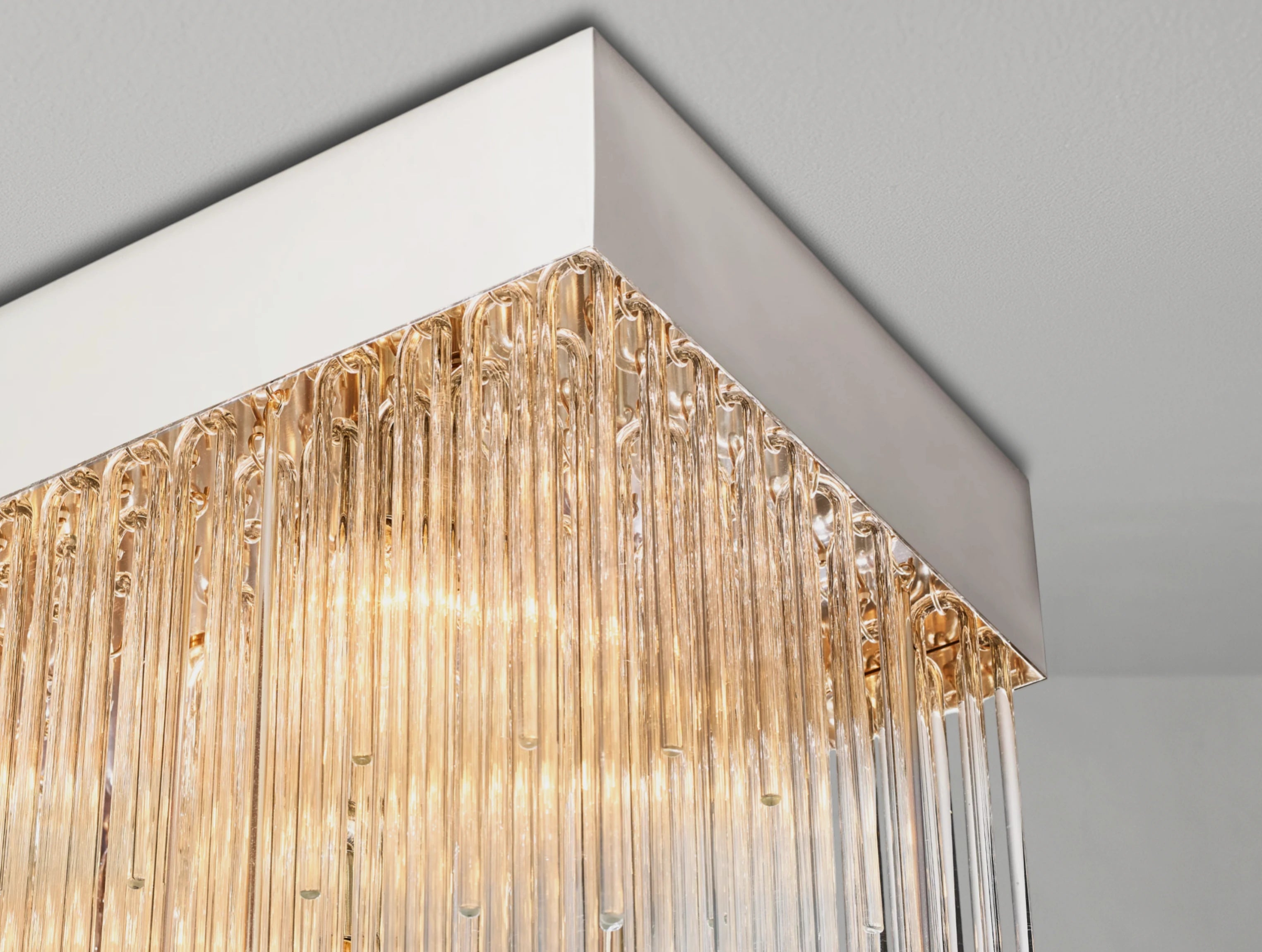 Designed by Timothy Oulton, this square chandelier evokes the mesmerizing beauty of rainfall frozen in time. Hundreds of slender glass tubes and metal rods are suspended in an asymmetric cascade, refracting light to dramatic effect. Luxurious yet versatile, it can be installed as either a flushmount or a pendant chandelier, making it a striking focal point for dining rooms, living areas, or entryways.