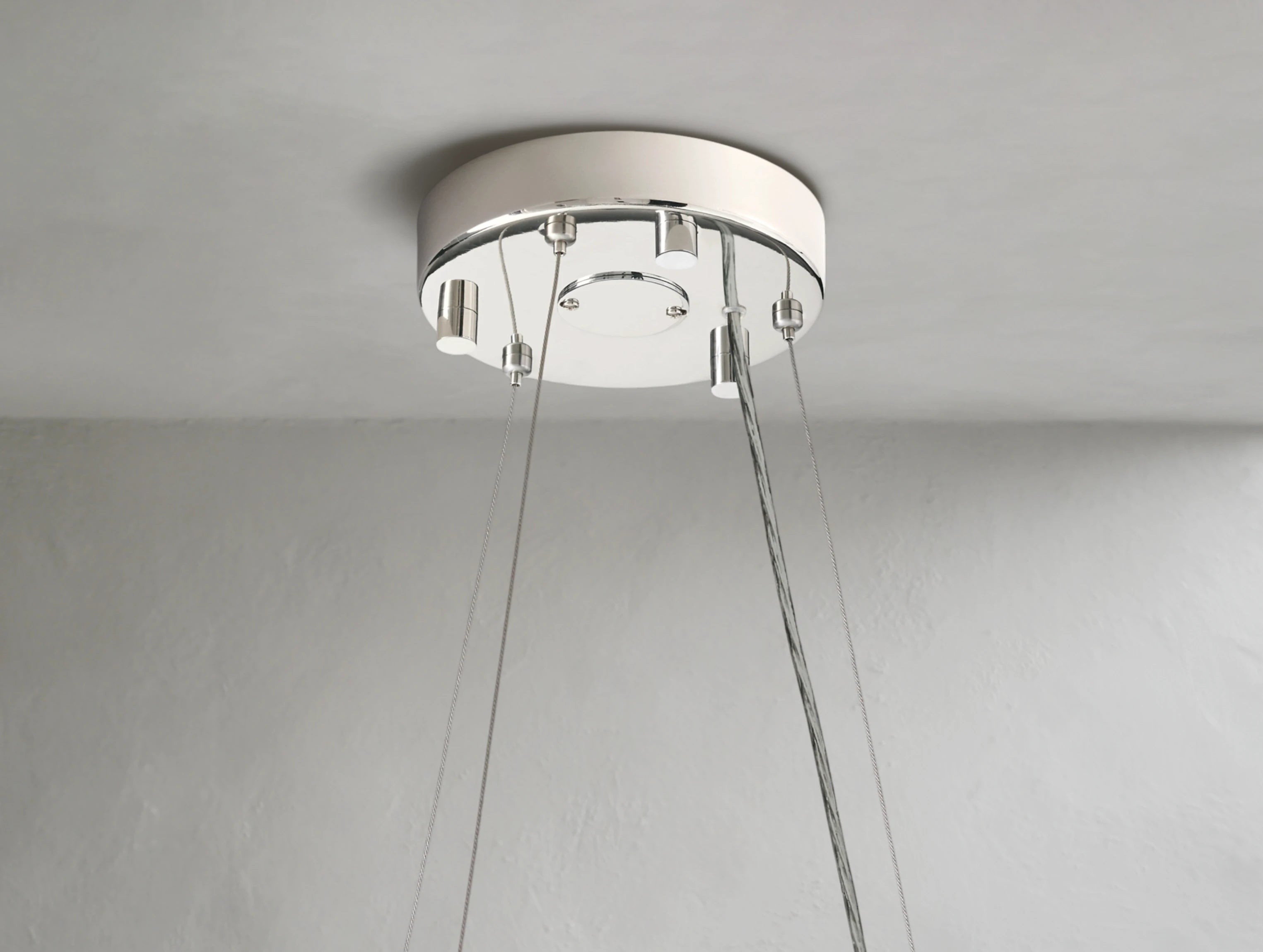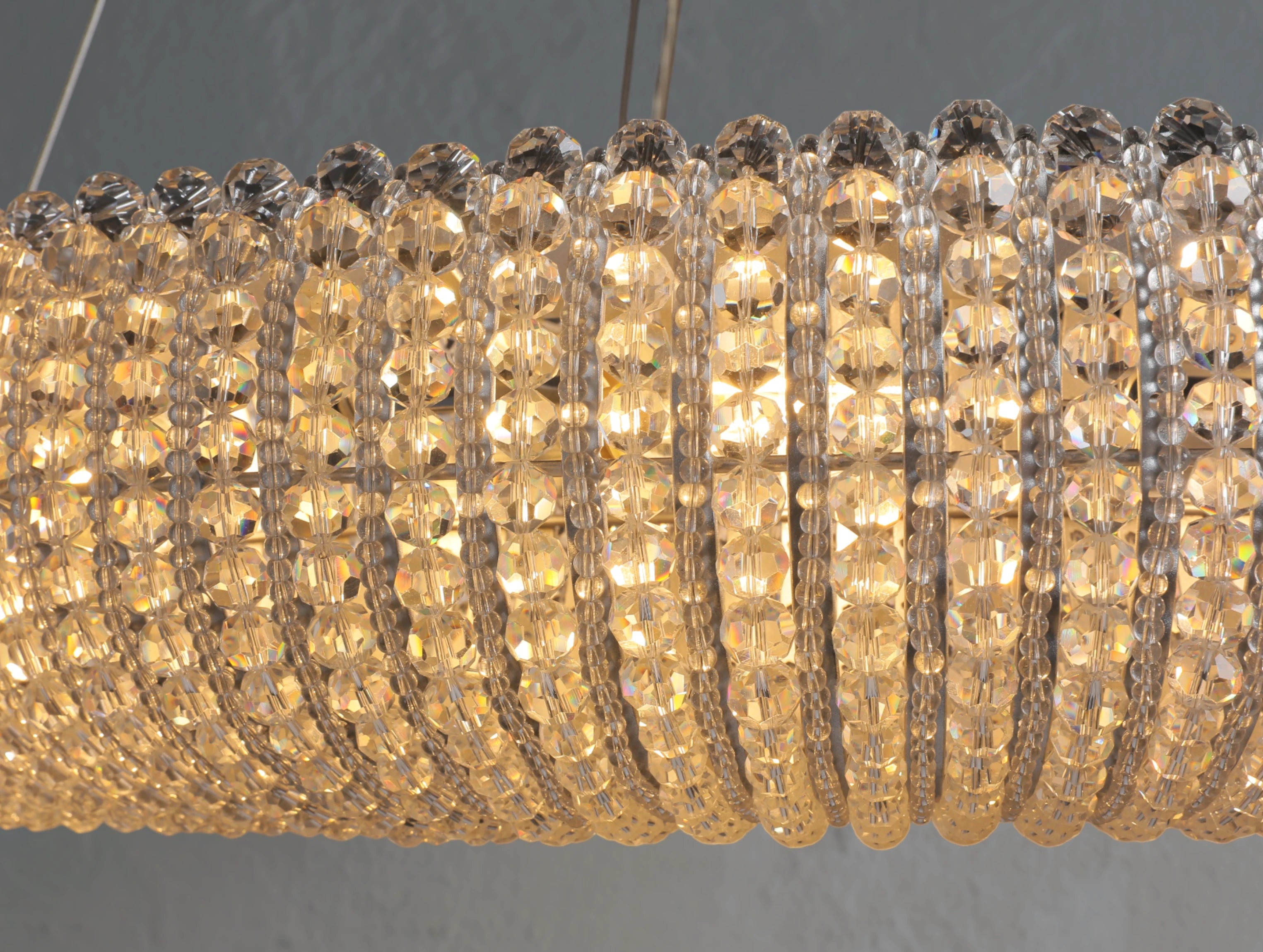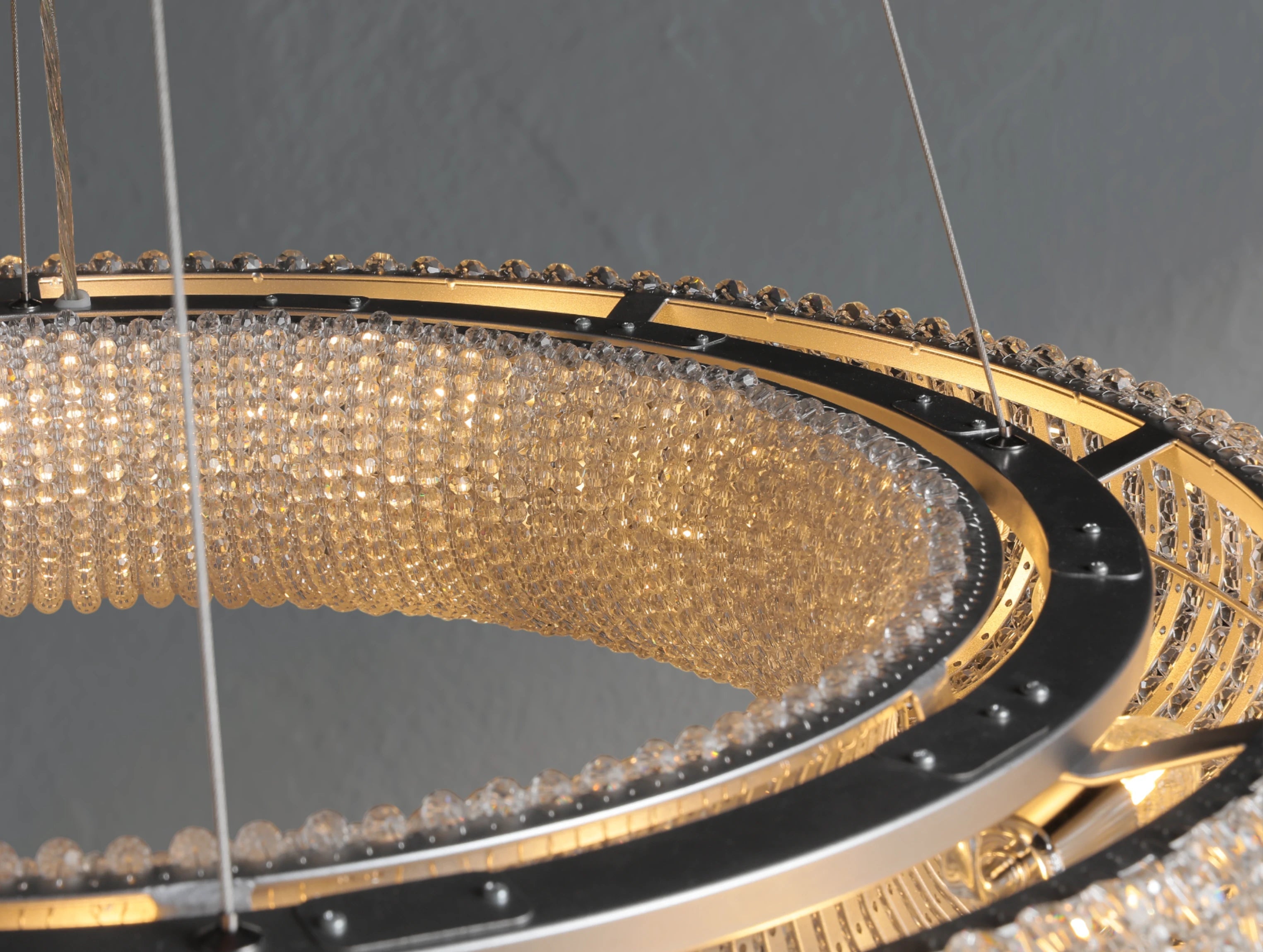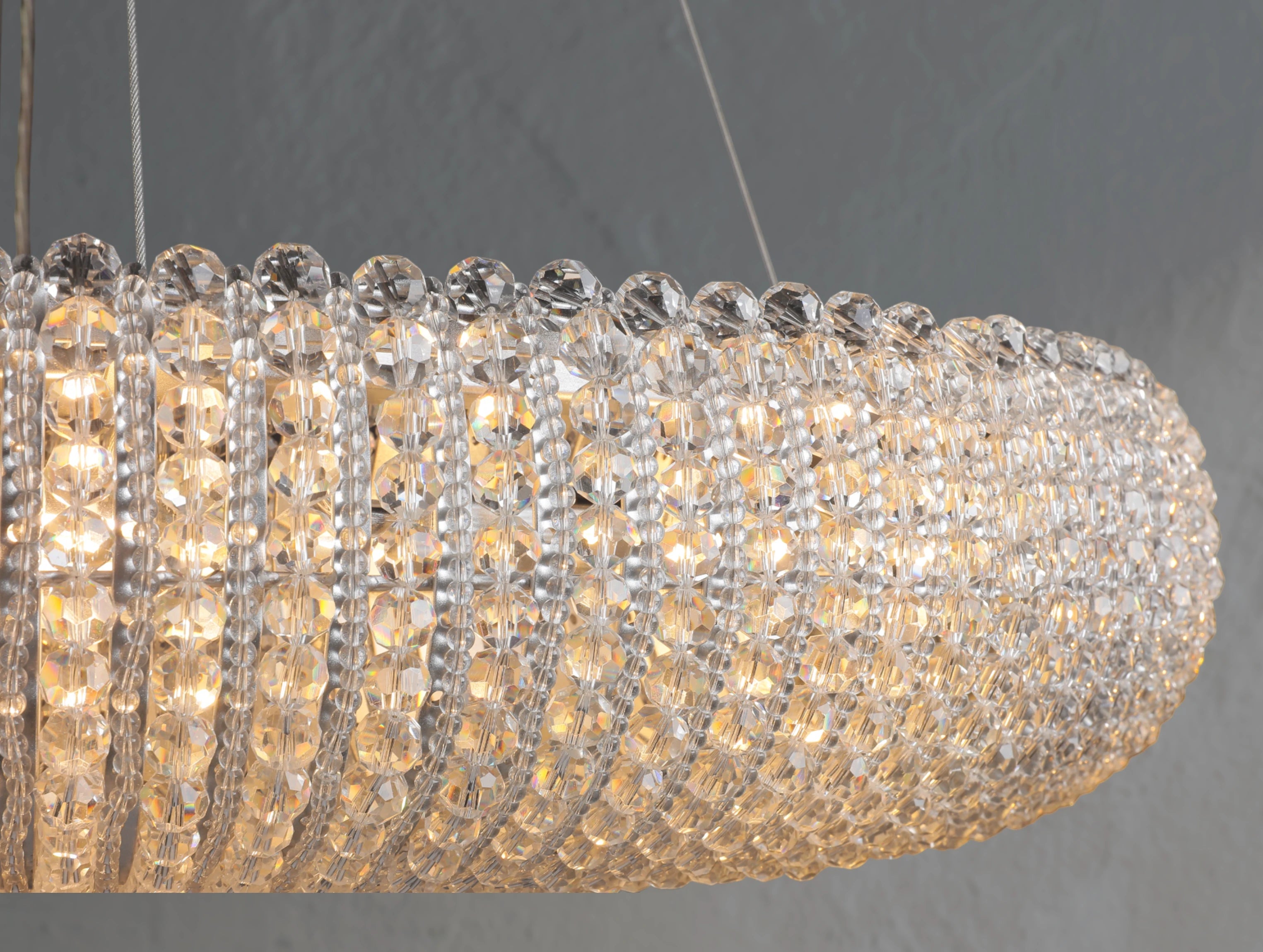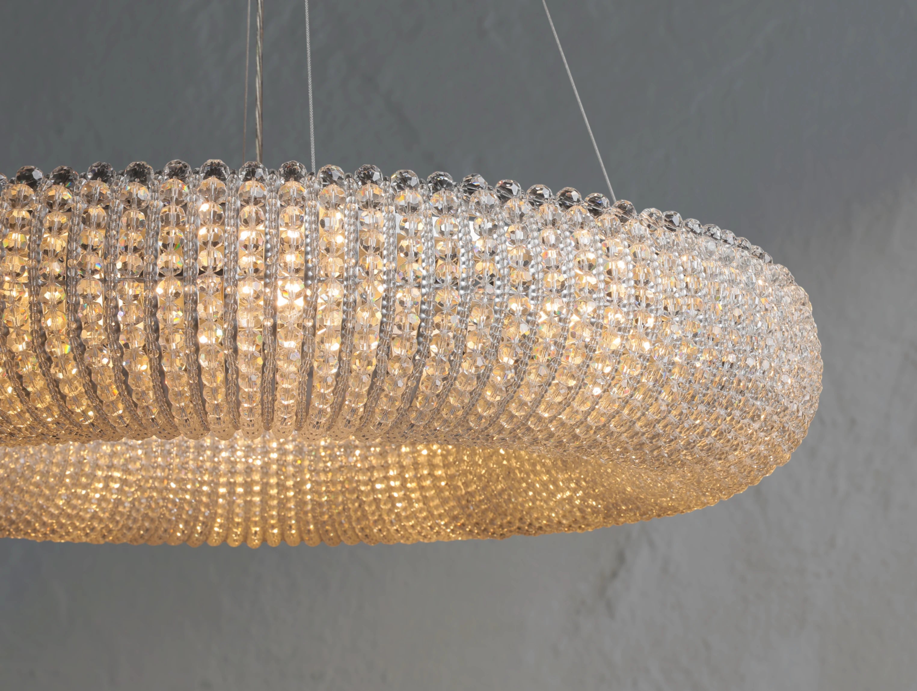 Inspired by an antique French design from the 1930s, this chandelier reimagines classic glamour in a modern form. Thousands of hand-wrapped faceted K9 crystal glass beads encircle an iron frame to create a luminous floating orb. As light filters through alternating large and small crystals, it refracts and reflects in brilliant layers, casting a warm, inviting glow. Suspended by a slender steel cable, this piece offers both elegance and sculptural presence.