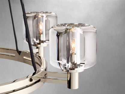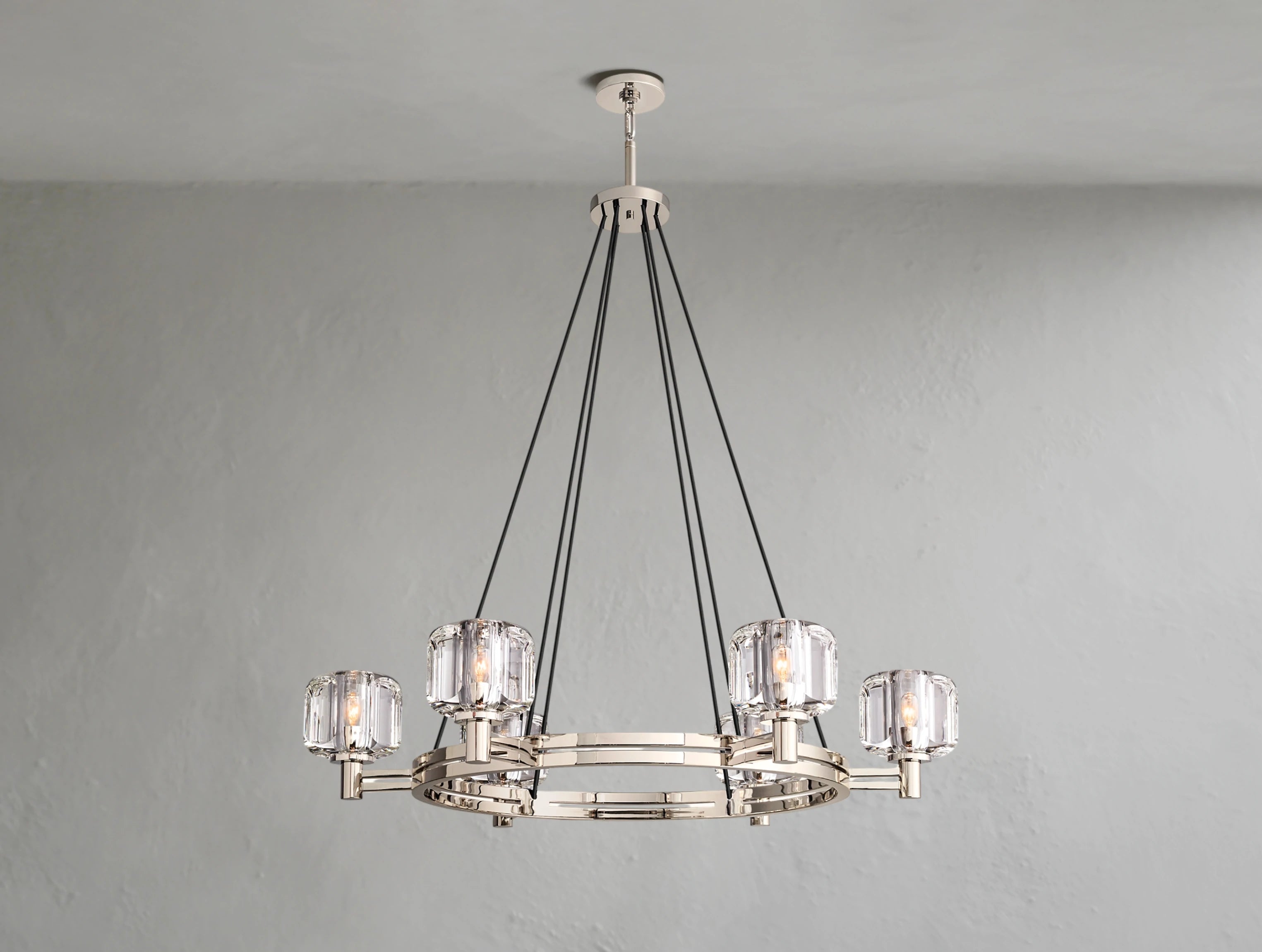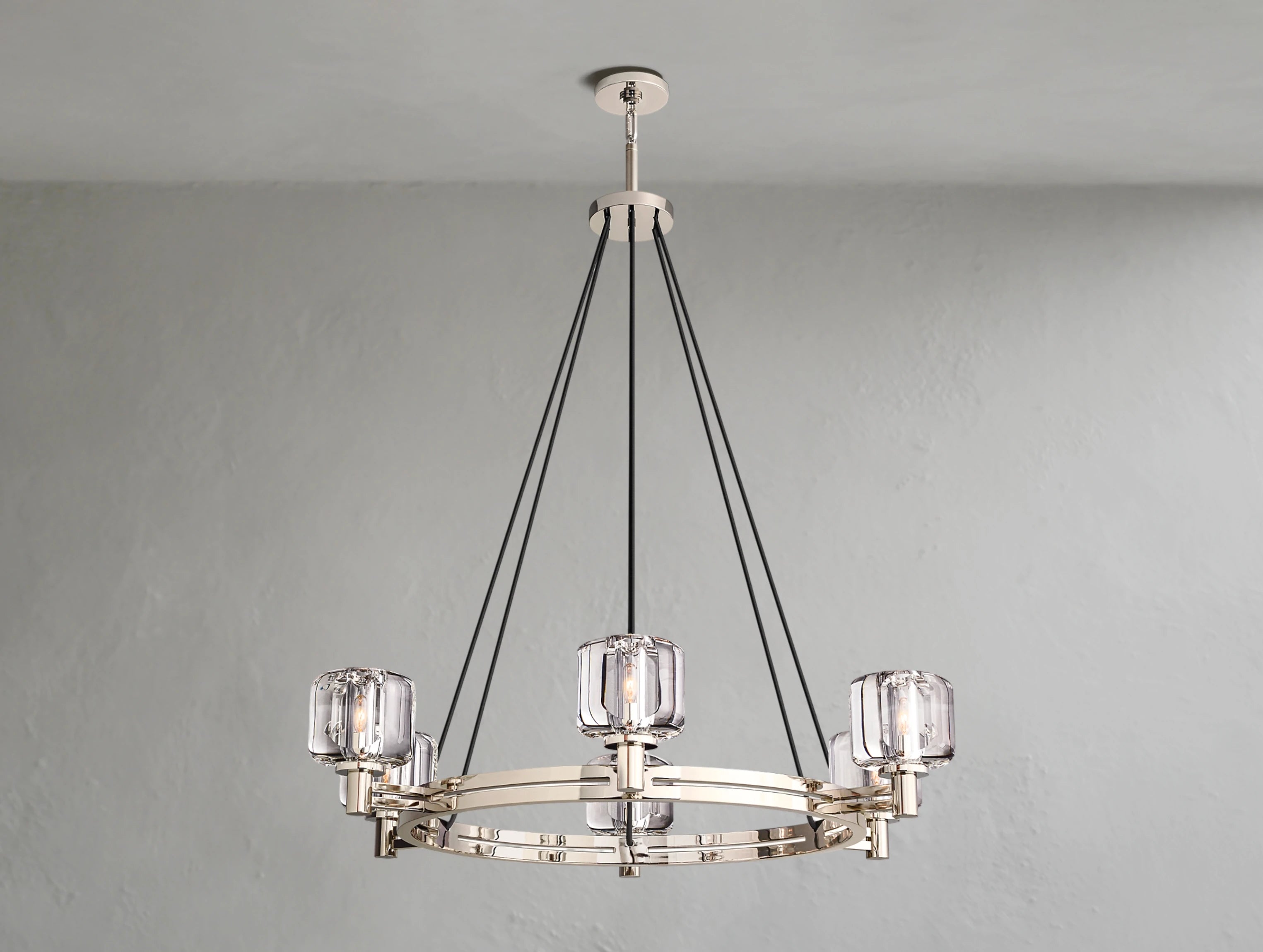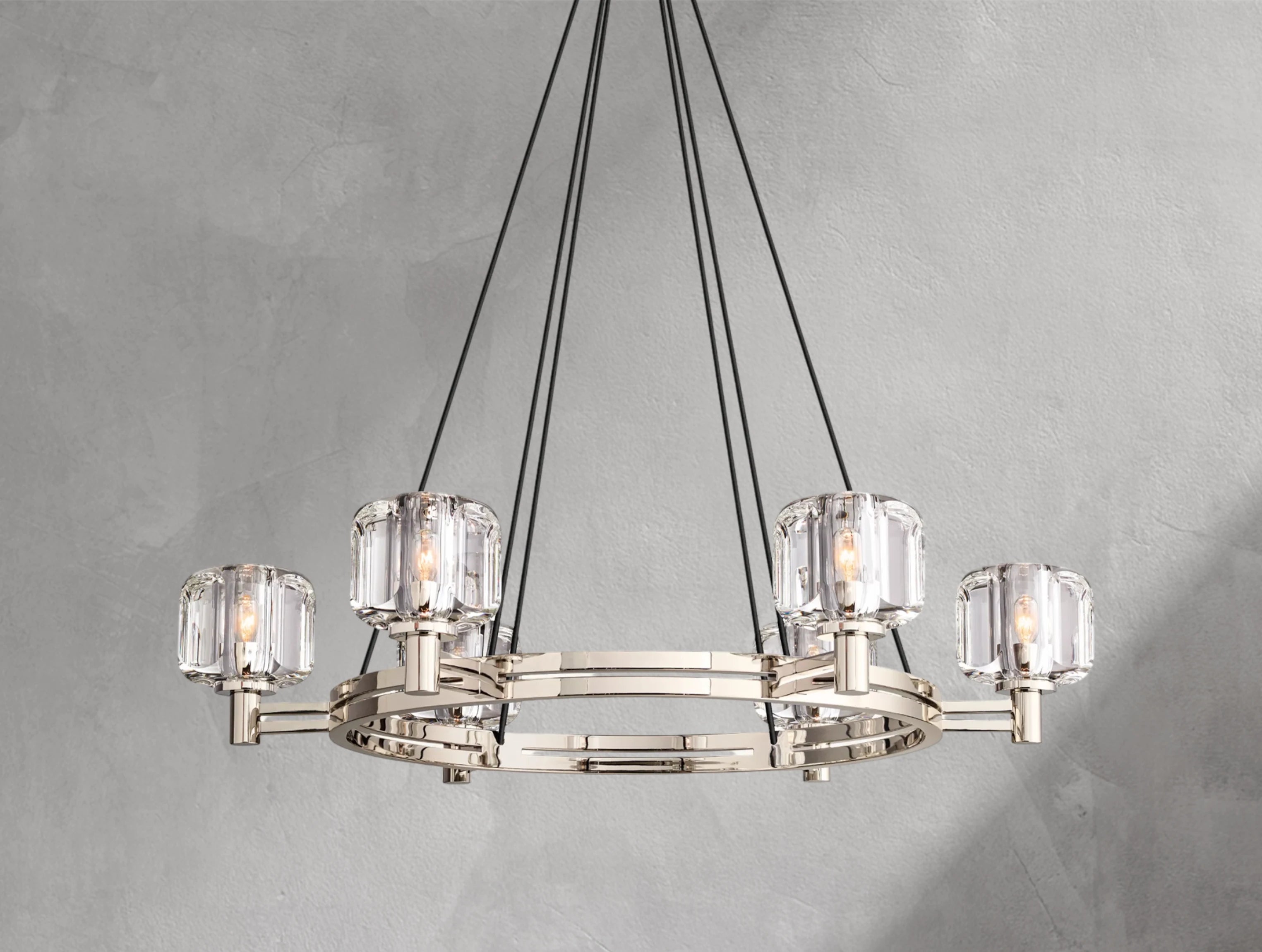 A refined statement in light and form, the Demanette chandelier blends sculptural presence with quiet luxury. Suspended in a double-metal frame, each softly curved panel is crafted from solid K9 crystal—precision-cut and polished by hand to enhance its luminous clarity. Oval facets on all four sides open clean sightlines through the glass while casting delicate refractions across the room. Available in three sizes, it brings elevated harmony to dining areas, foyers, and open-plan living spaces.