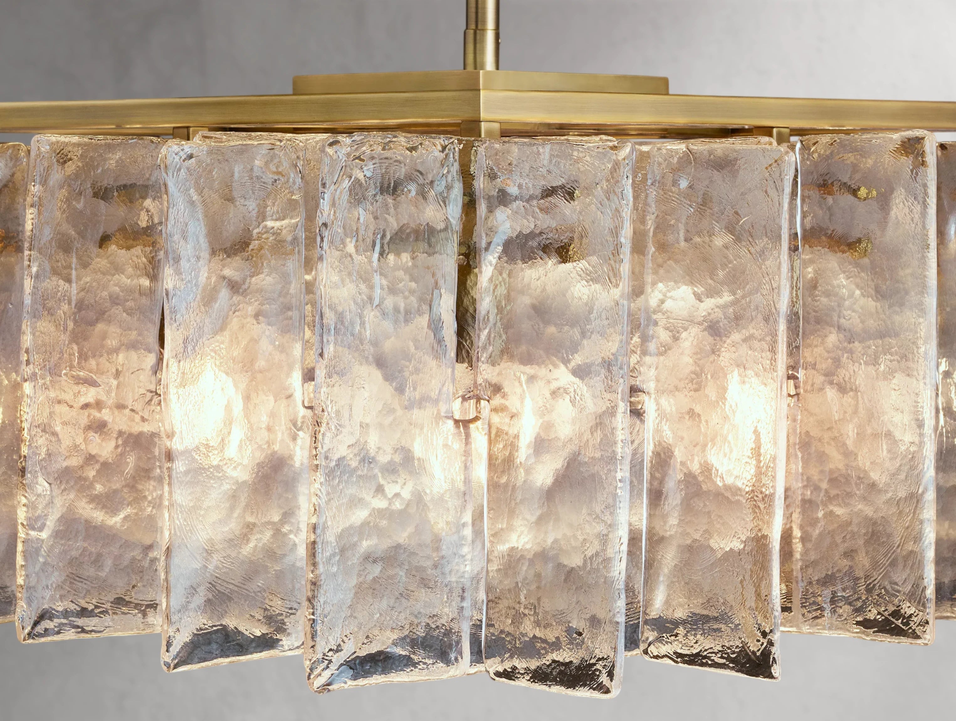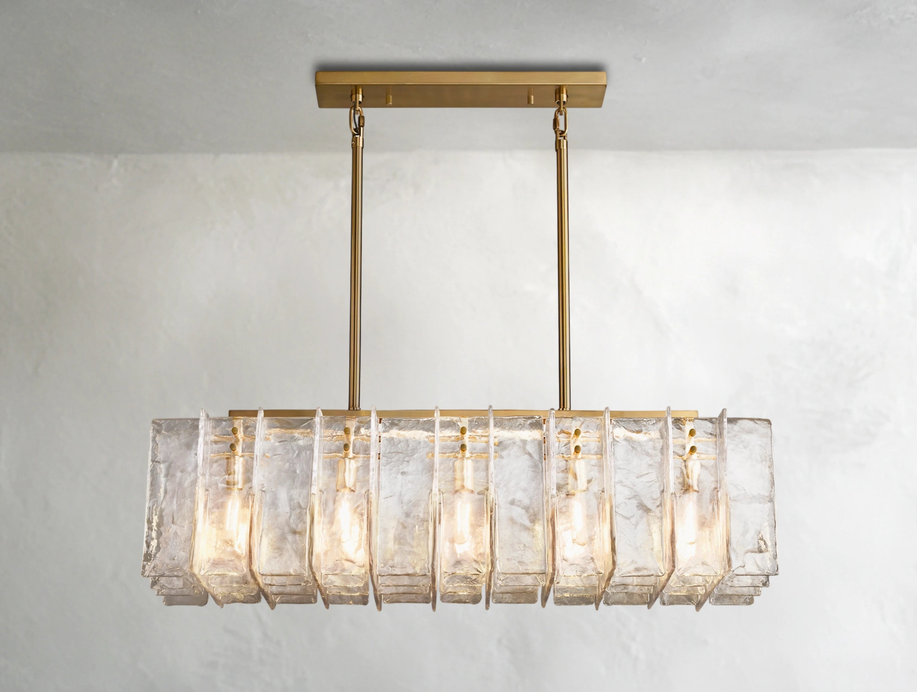 This rectangular chandelier from the Dryice collection is a refined expression of midcentury geometry and sculptural light. Crafted from solid cast glass and steel, its interlocking panes feature a rippled texture achieved through custom molds, lending the piece depth and a soft diffusion of light. Available in two sizes, it balances architectural form with a floating visual lightness, illuminating dining tables, kitchen islands, or long hallways with elegance and grace.