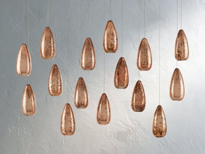 The Edoby Linear Chandelier captures the enchanting beauty of cascading light. each teardrop pendant is crafted from mercury glass—its warm copper exterior and silvered interior creating a dynamic interplay of reflection and glow. Suspended in graceful harmony, these glass drops shimmer with dimension even when unlit. Available in two sizes, the Edoby brings dramatic elegance and handcrafted artistry to dining spaces, foyers, and modern interiors.
