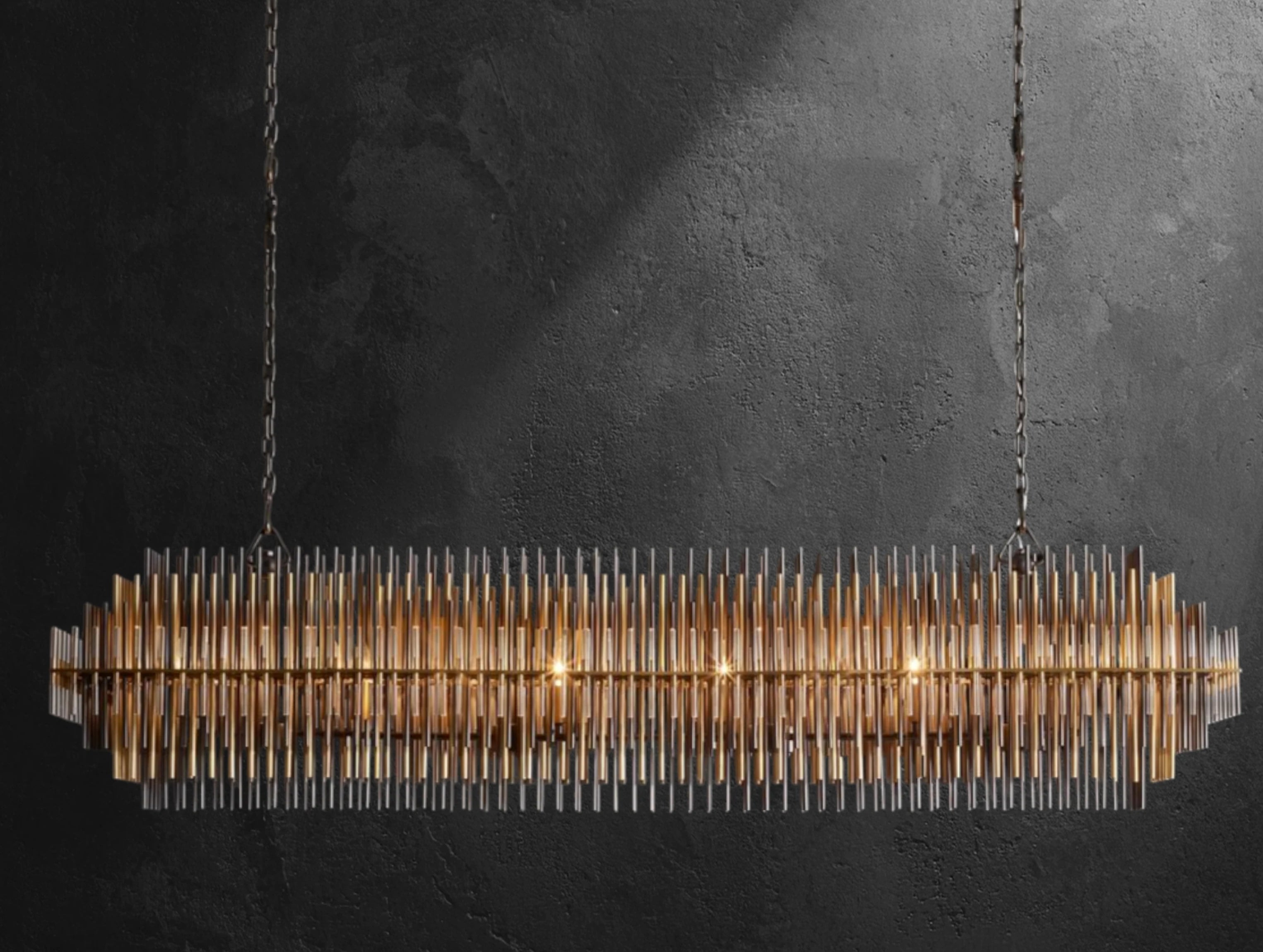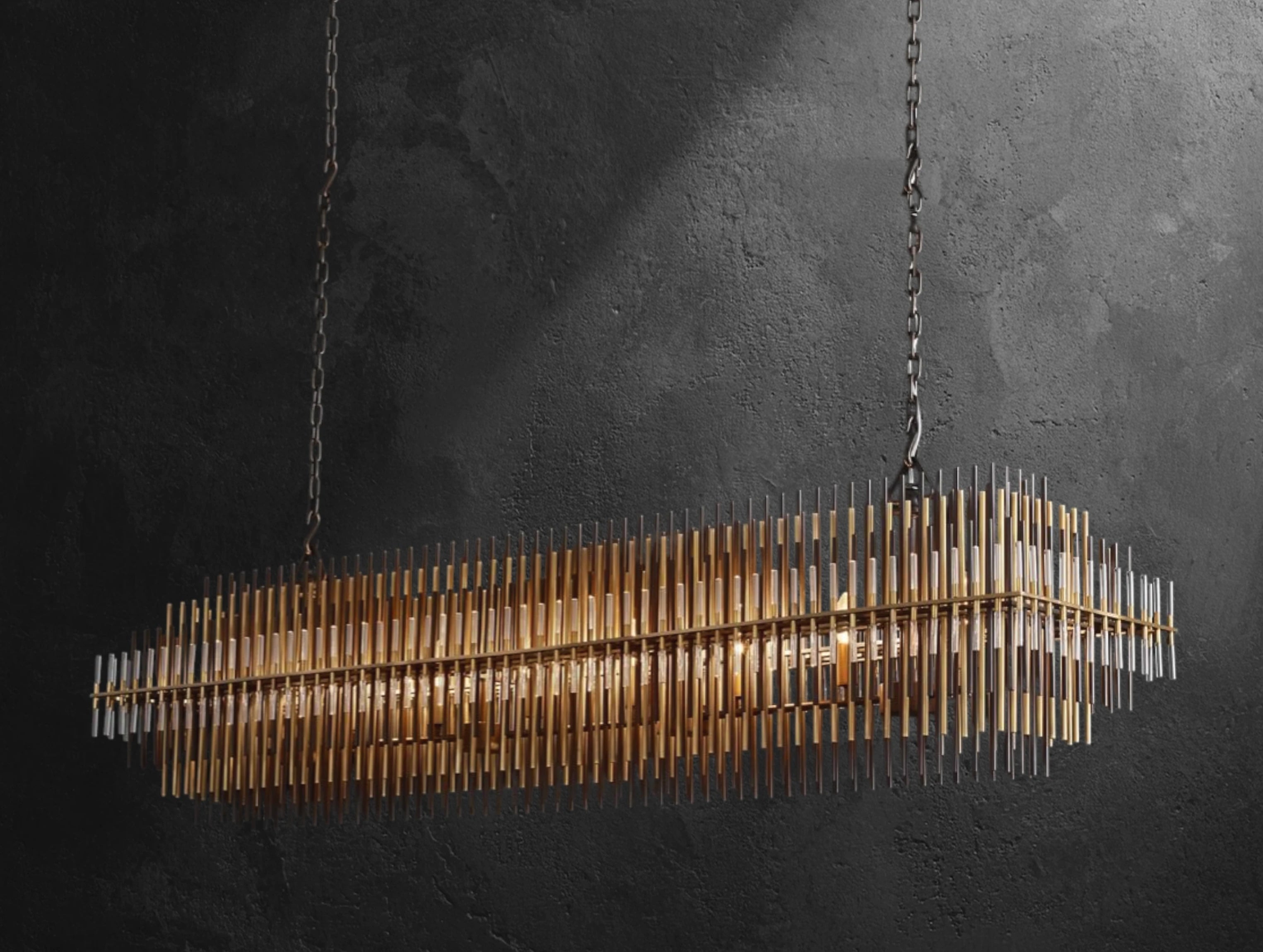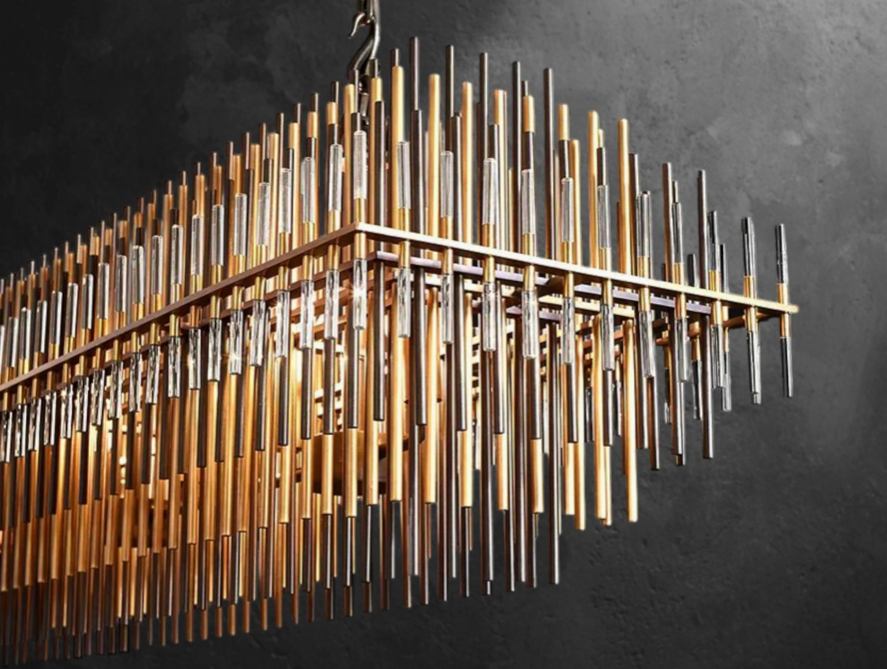 Designed by Adam Grant and inspired by a bold 1970s aesthetic, this rectangular chandelier showcases multiple tiers of slender brass, iron, and acrylic rods. The graduated arrangement filters the light within, producing a sculptural glow that commands attention. Its elongated form makes it a striking focal point over dining tables, kitchen islands, or long hallways.