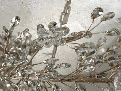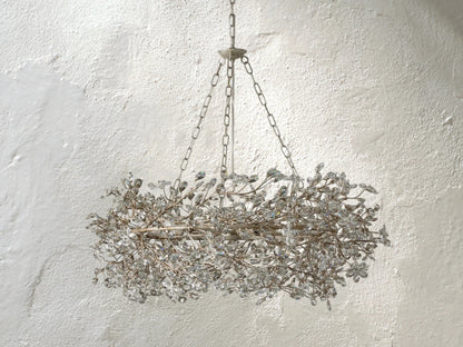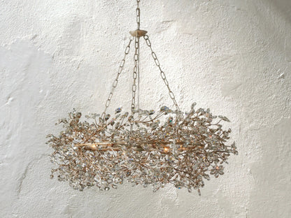 Inspired by nature and crafted by Italian artisans, the Fiona Crown Chandelier blends graceful ironwork with sparkling crystal florals. Each branch-like form is hand-finished in your choice of silver leaf, gold leaf, bronze, or brass, with antiqued details on the silver and gold options. Available in three sizes, this sculptural chandelier includes E12 bulbs and creates a romantic focal point in dining rooms, entryways, or vaulted spaces.