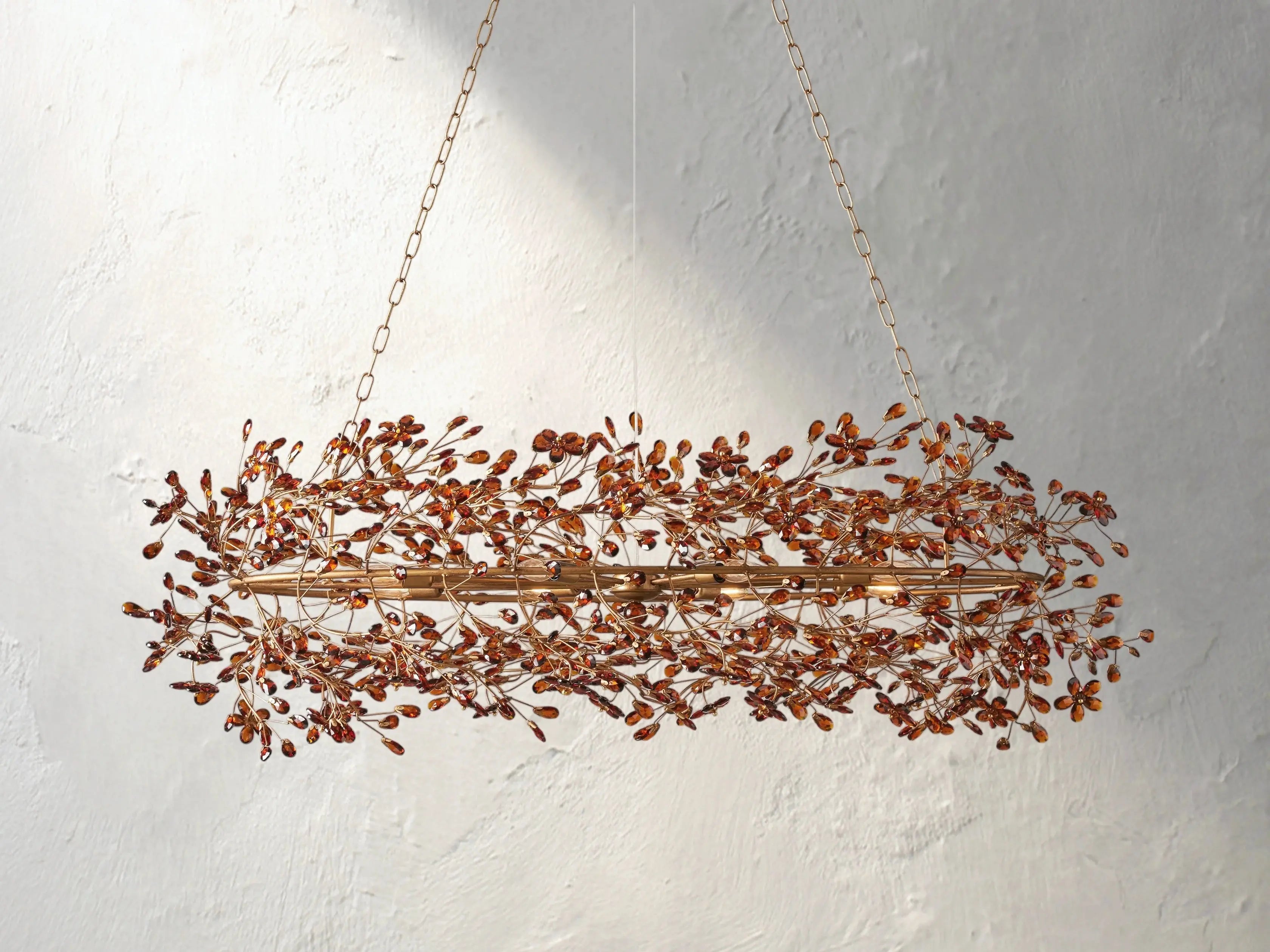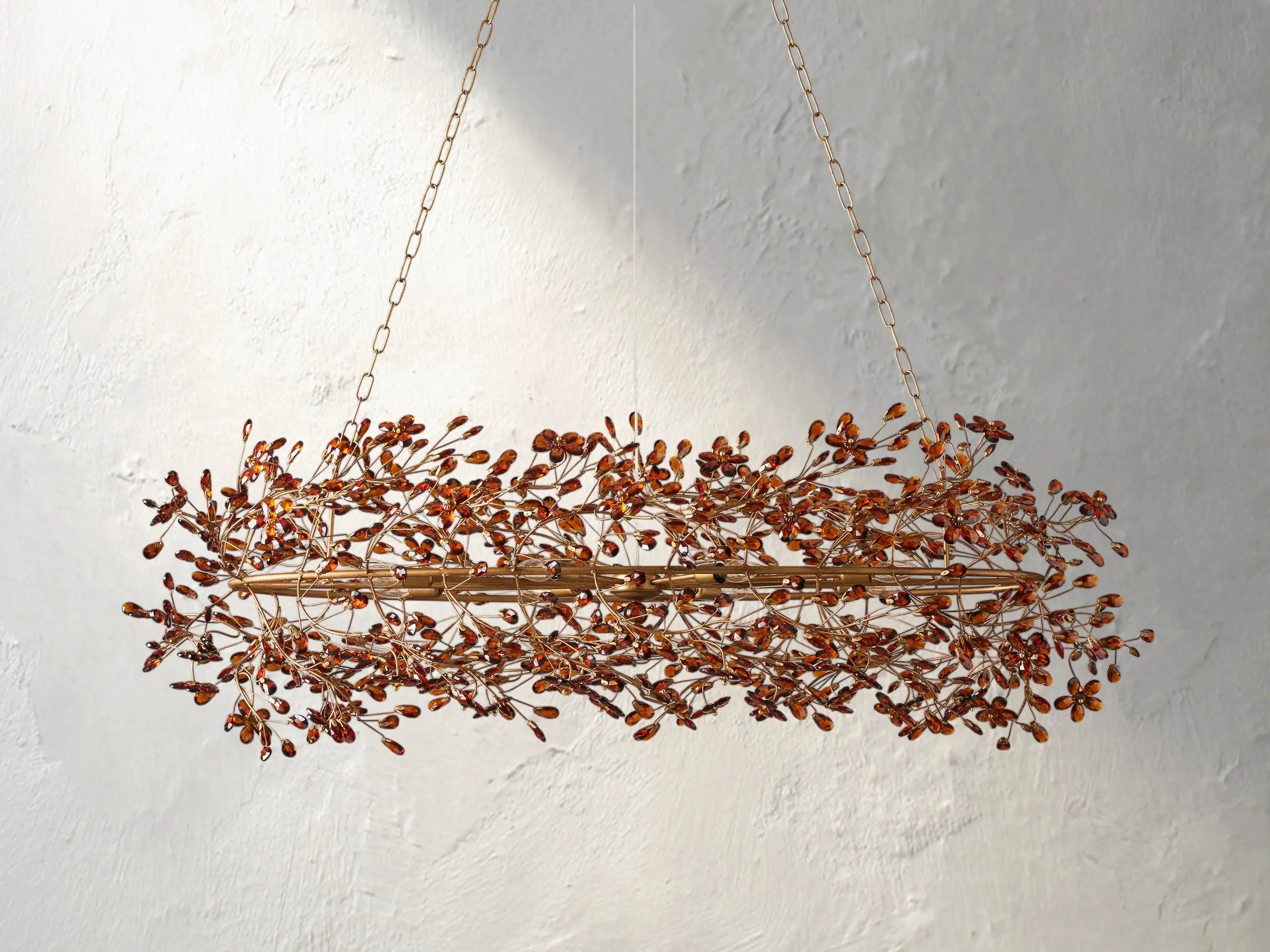 With its graceful oval silhouette and delicate crystal florals, the Fiona Oval Chandelier brings nature’s romance to grand interiors. Handcrafted in Italy from solid iron and finished in your choice of silver, gold, or bronze, each branch-like frame glows with artistic elegance. Available in two generous sizes, it includes E12 bulbs and offers adjustable suspension to suit a variety of spaces.