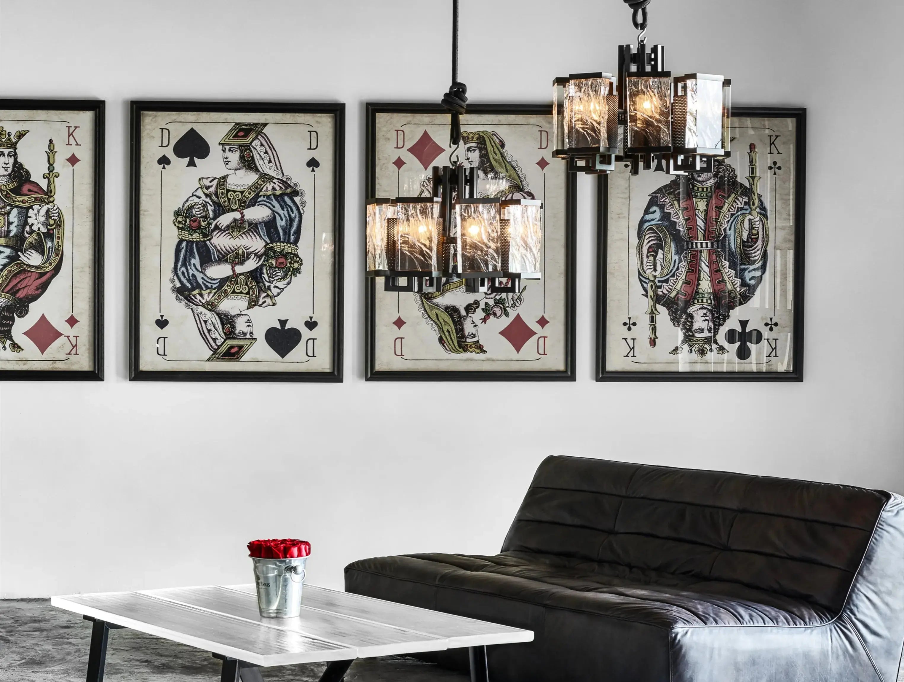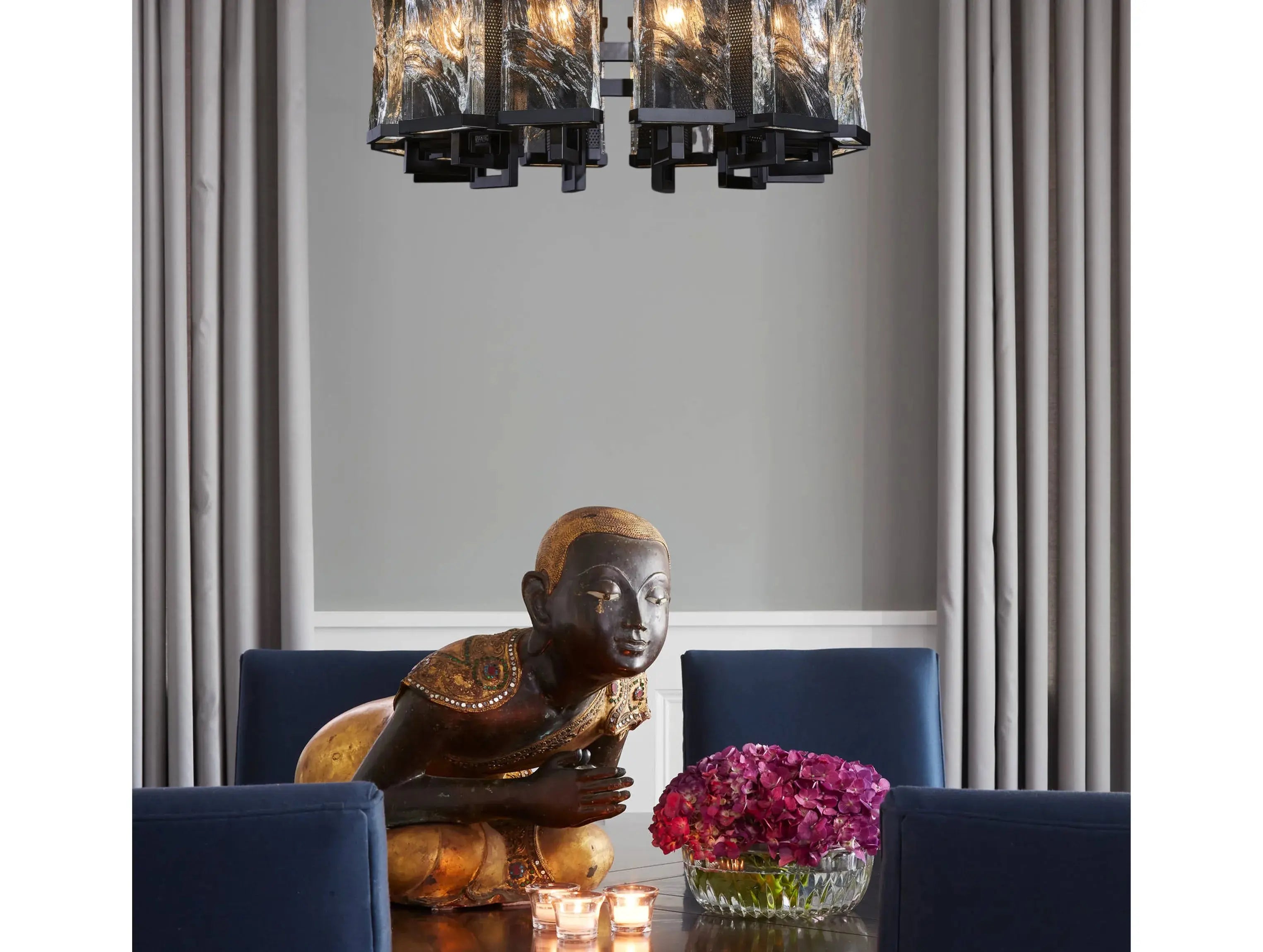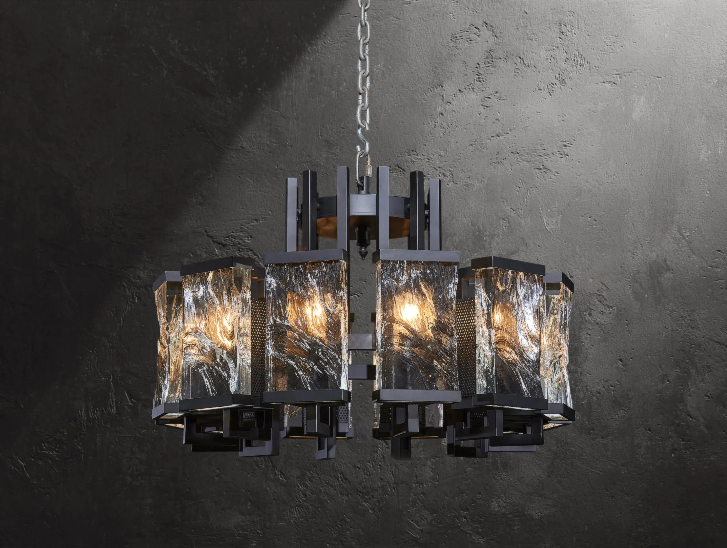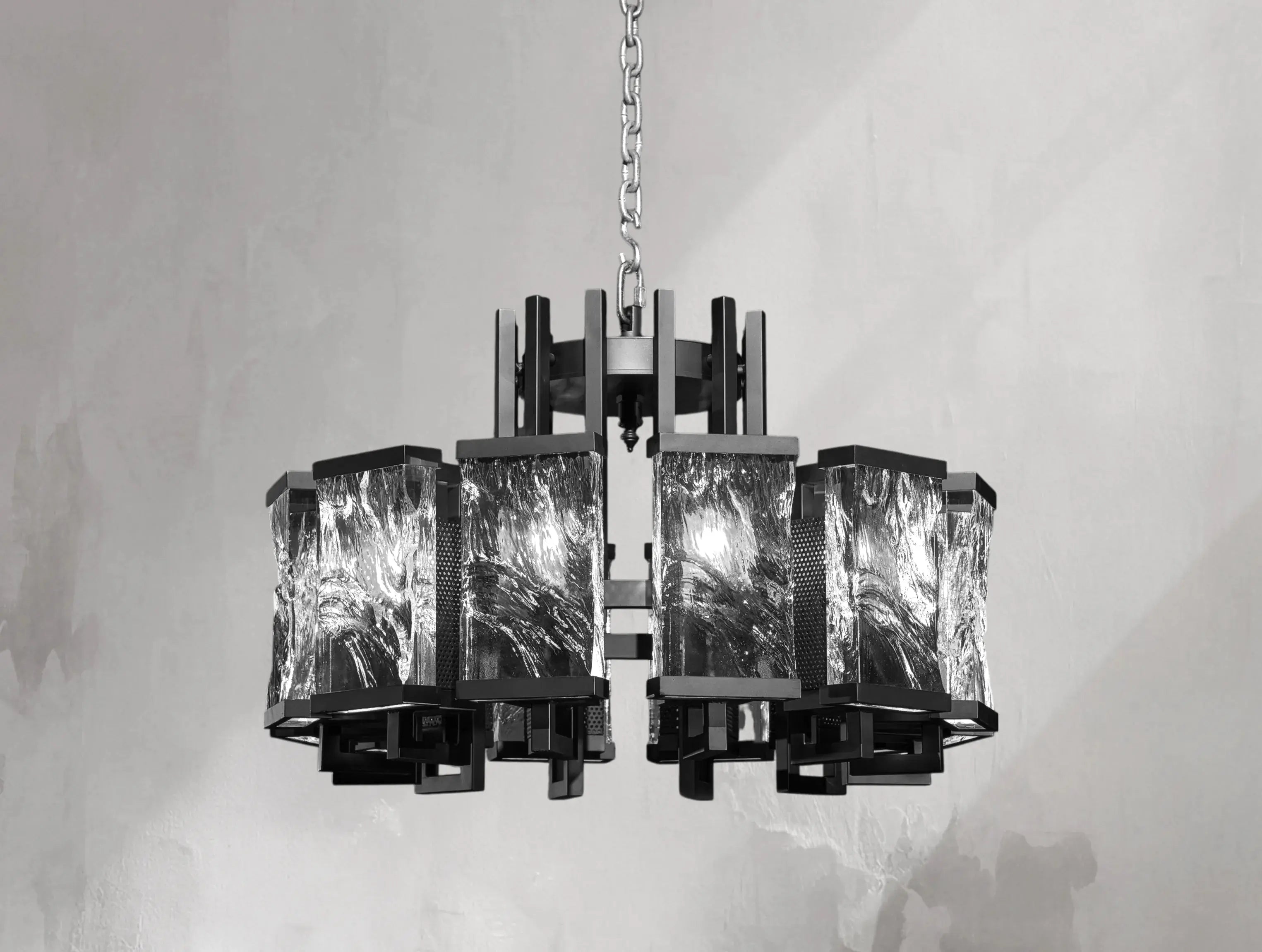 Bold and elemental, the Glacium Chandelier showcases solid glass forms sculpted by intense heat, their surfaces rippled and fractured like slabs of frozen ice. Each textured block is illuminated from behind, revealing swirling crystalline patterns that evoke glacial power and quiet drama.