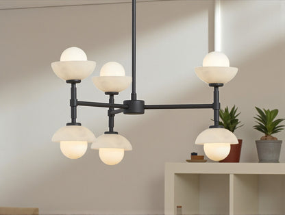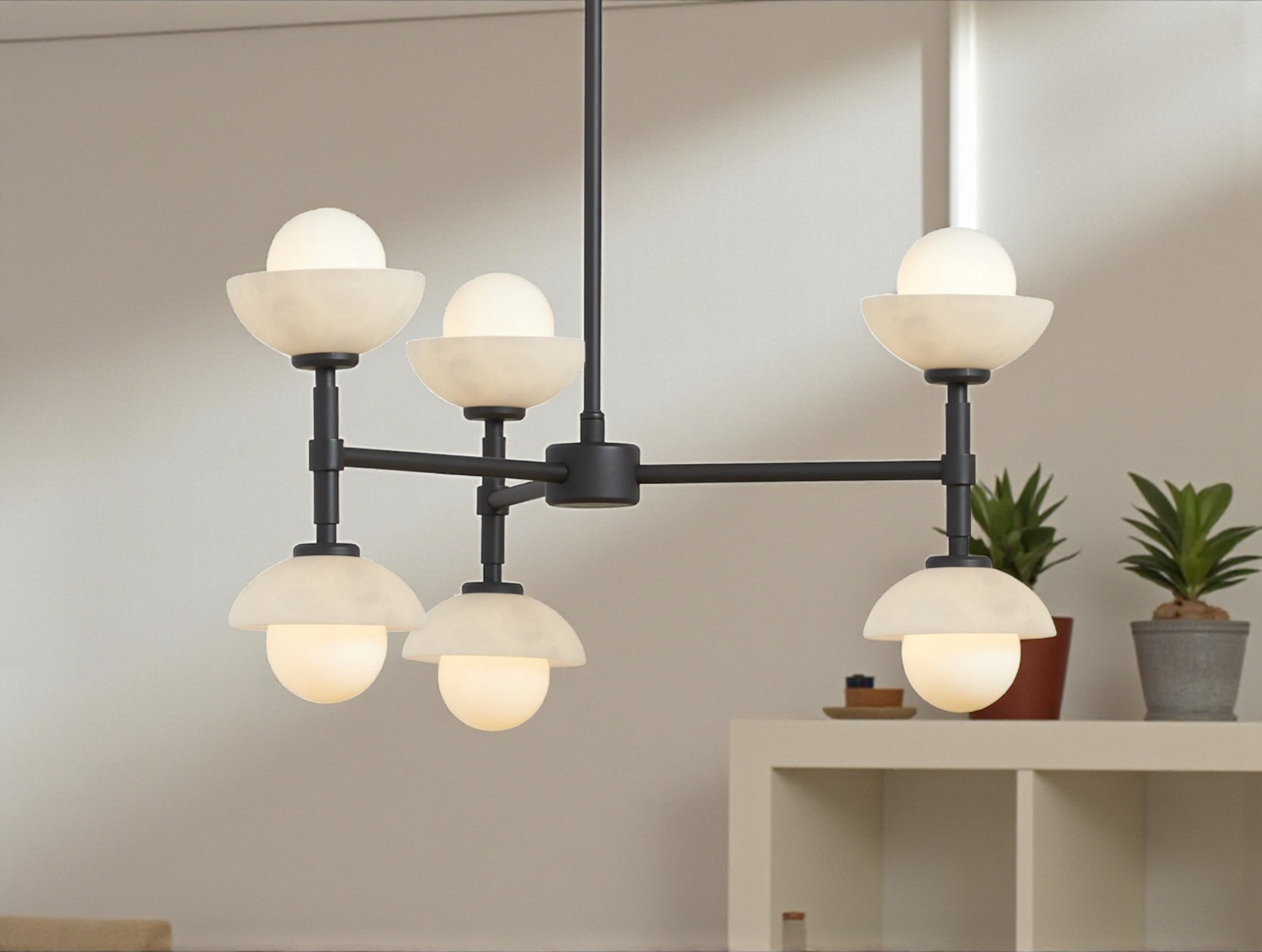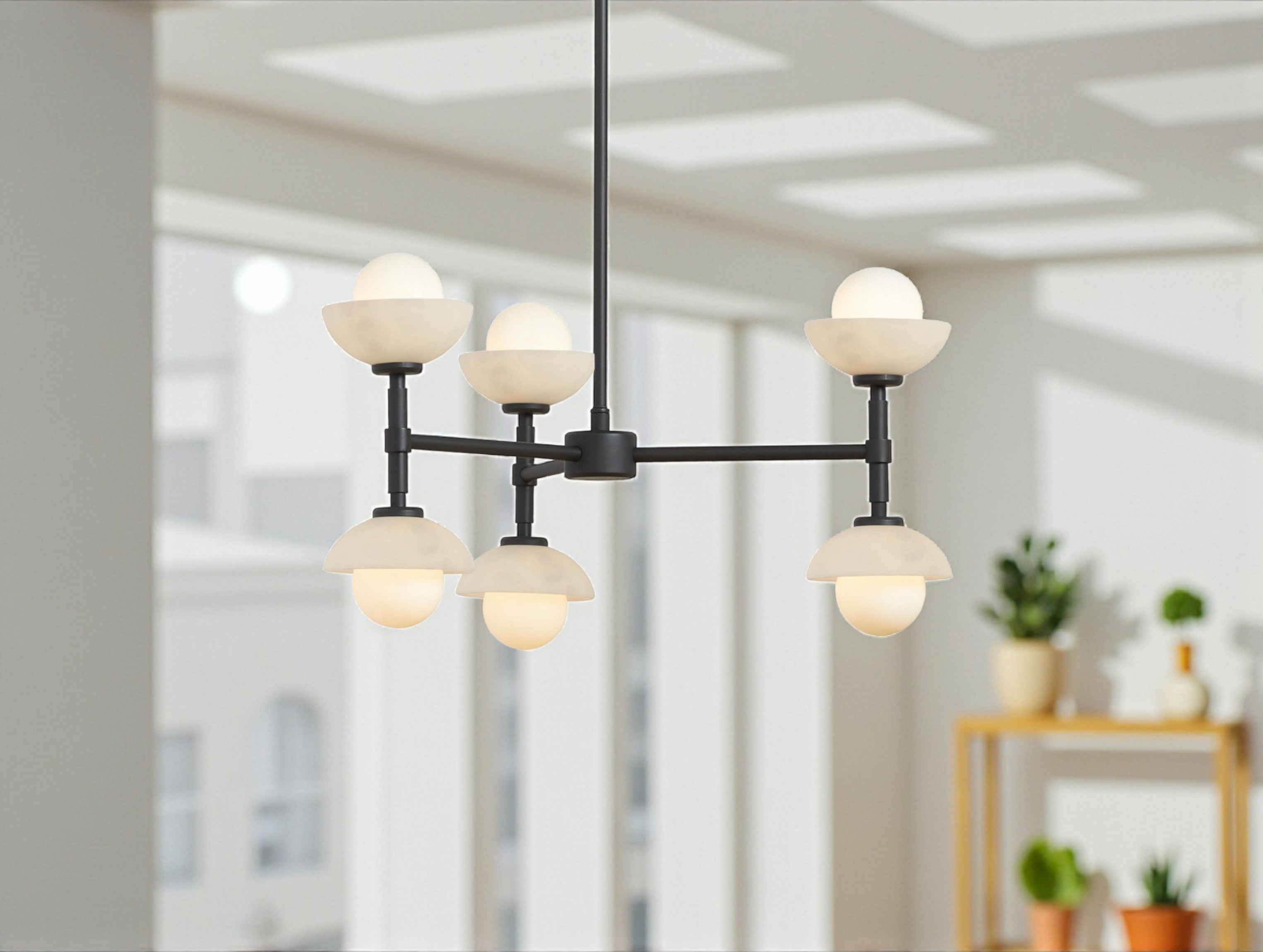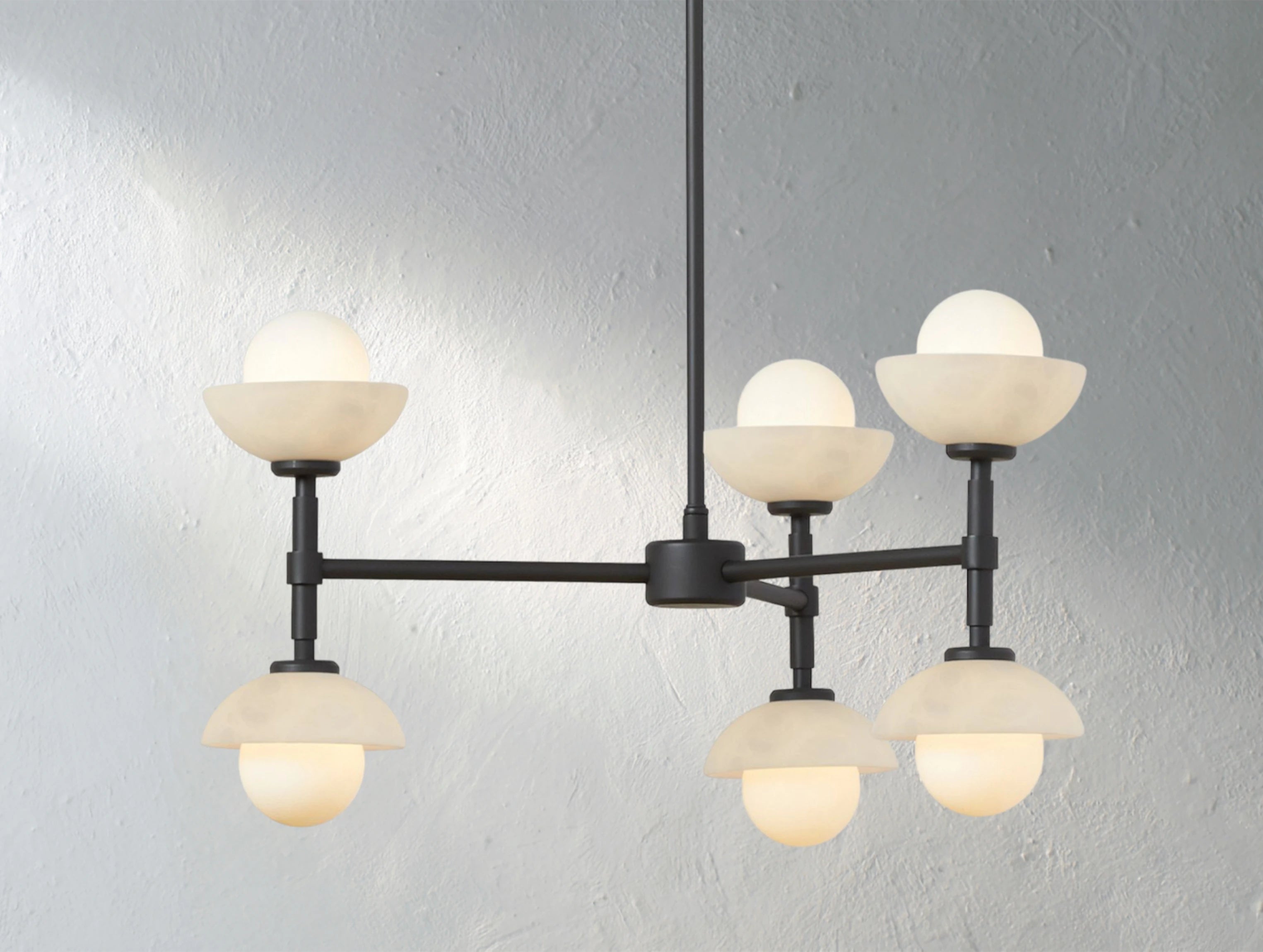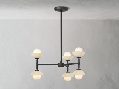 The Greensh Chandelier is a statement of refined craftsmanship and architectural grace. Hand-crafted from solid brass, this chandelier features softly rounded glass shades set within sculpted bowls made from opal glass or hand-carved Italian alabaster. The natural veining of the alabaster ensures that every piece is one of a kind, celebrating organic beauty and artisanal detail.