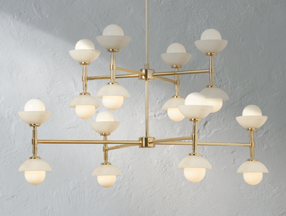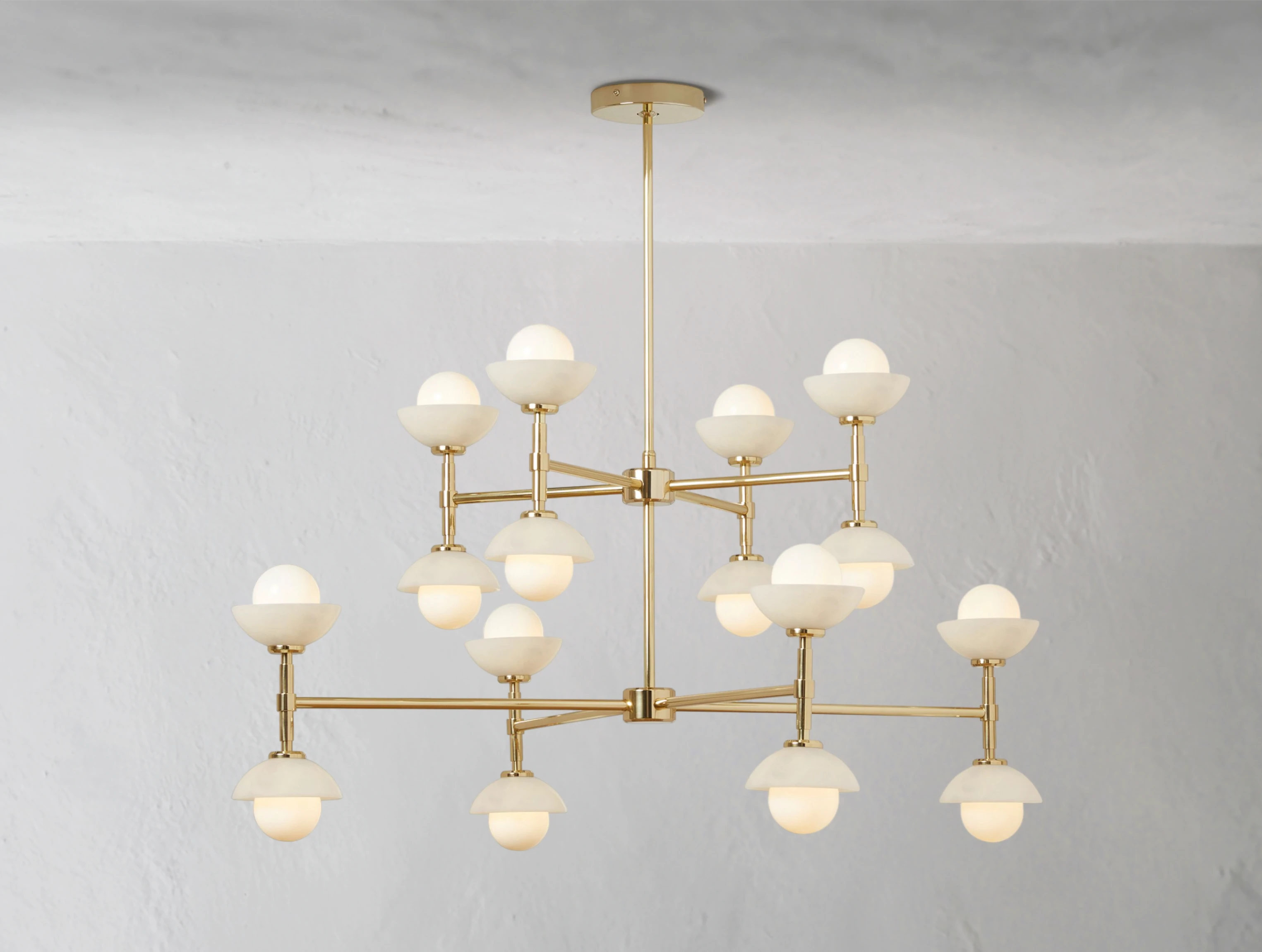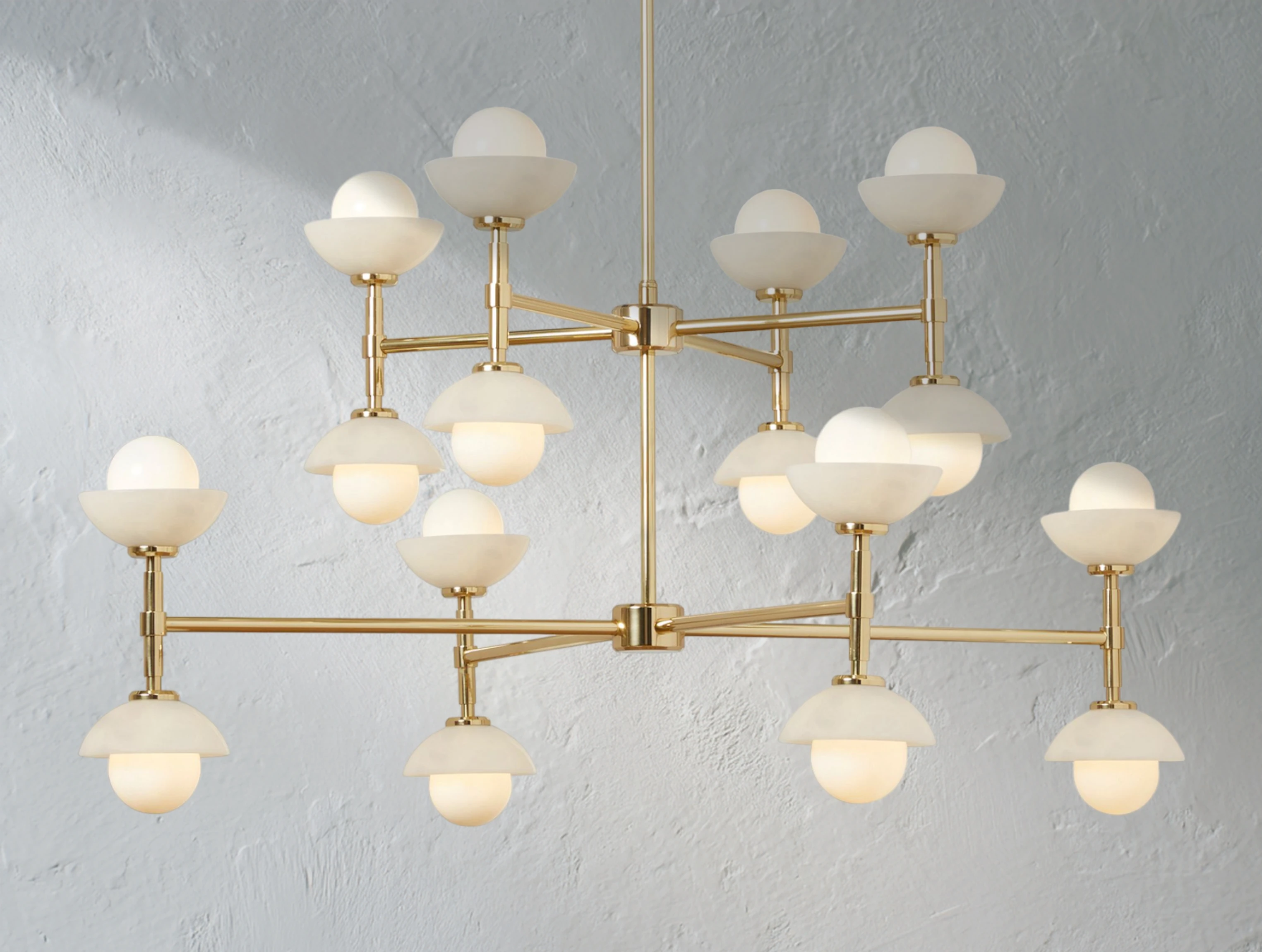 The Greensh Double Tier Chandelier captures timeless elegance in a grand, layered form. Expertly crafted from solid brass, it showcases two cascading tiers of softly rounded glass shades, each set within sculpted bowls made of opal glass or hand-carved alabaster. The natural veining of alabaster ensures that every fixture is unique—no two are ever alike.