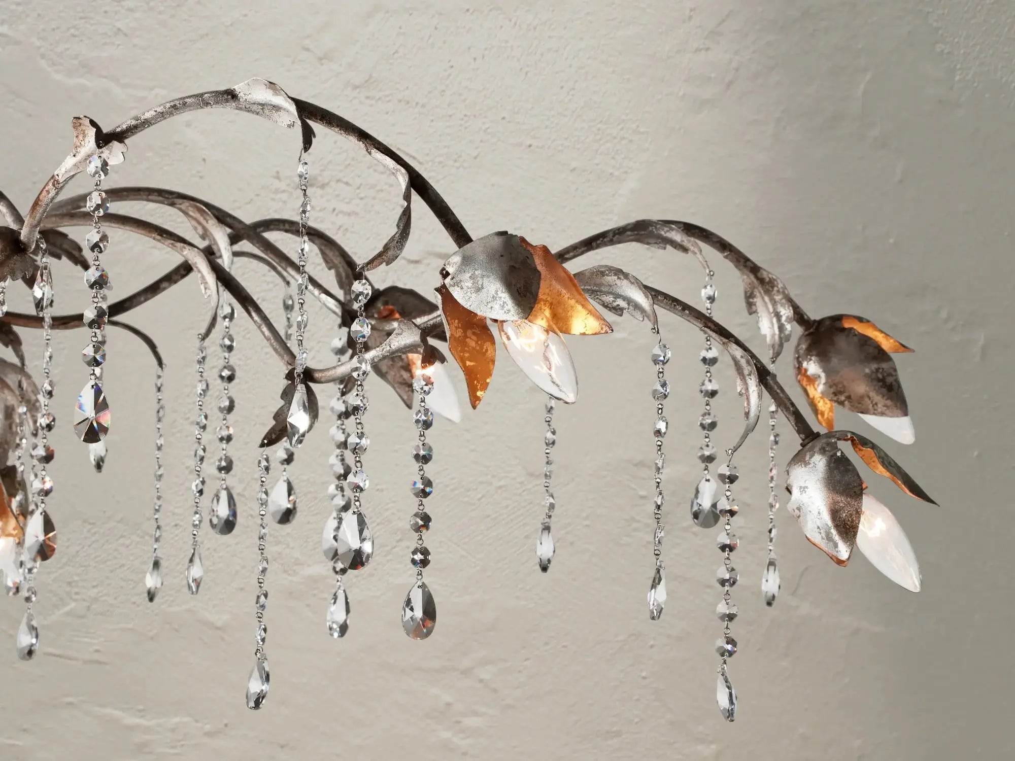 Inspired by the delicate beauty of rain on trailing garden vines, the Victor Linear Chandelier is hand-molded from solid iron by master artisans in China. Each floral curve is brought to life with a hand-applied silver finish, while hand-strung, faceted glass crystals catch the light like glistening drops of water, casting a soft, radiant glow throughout the room.