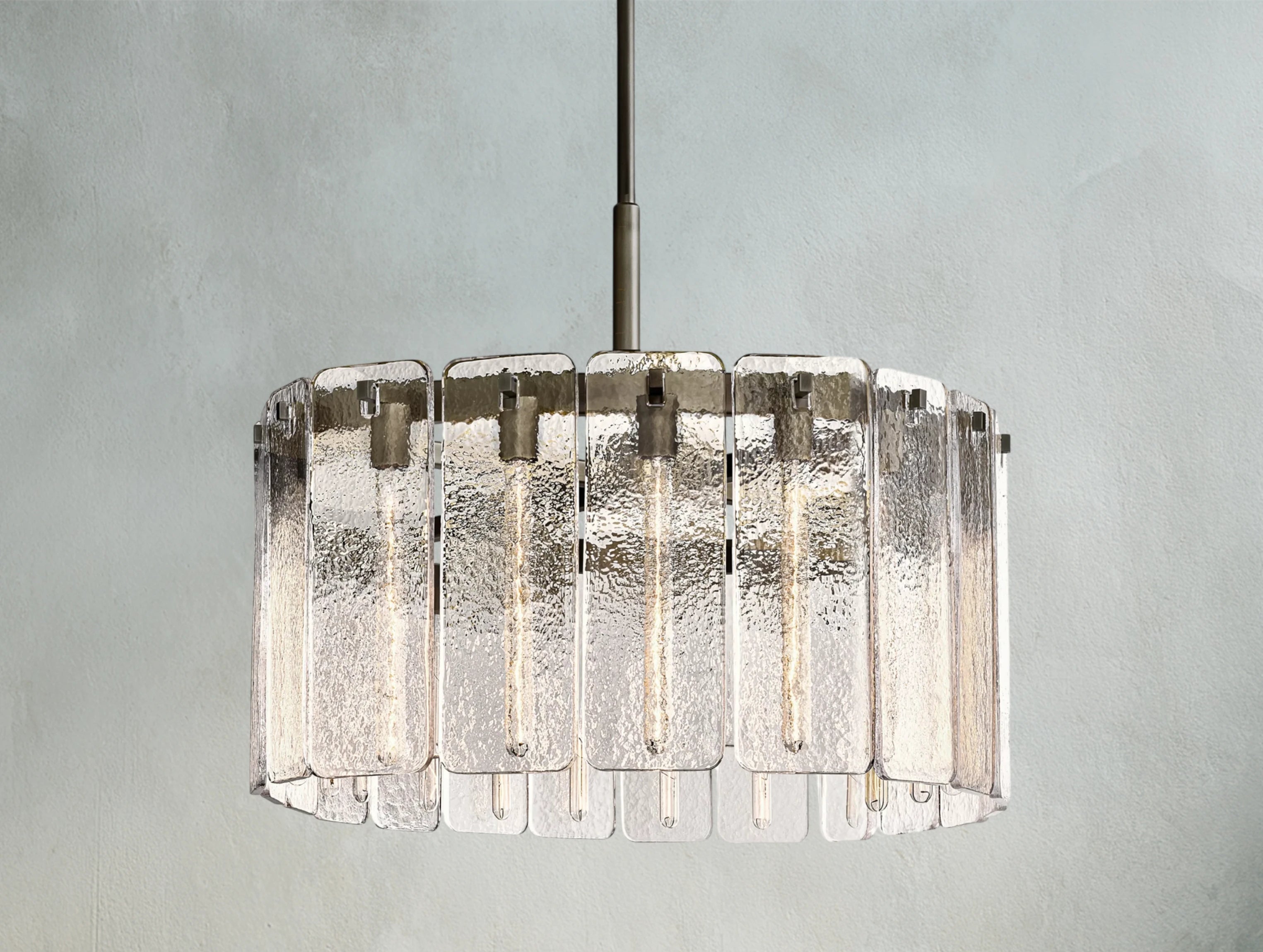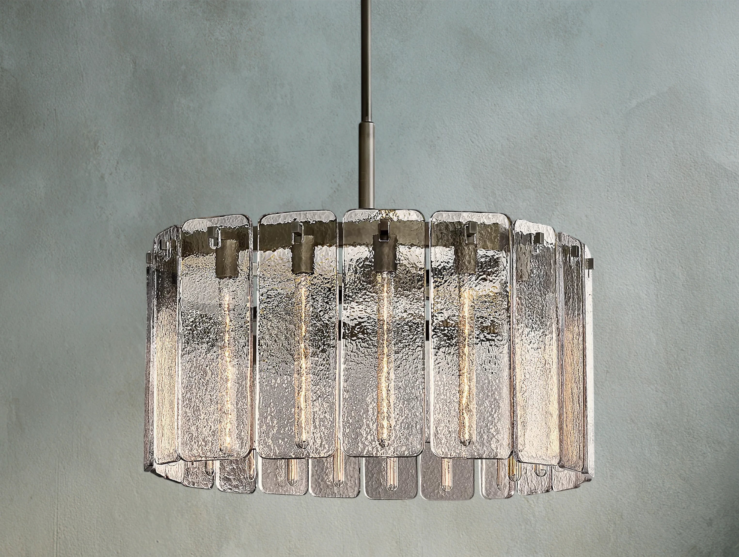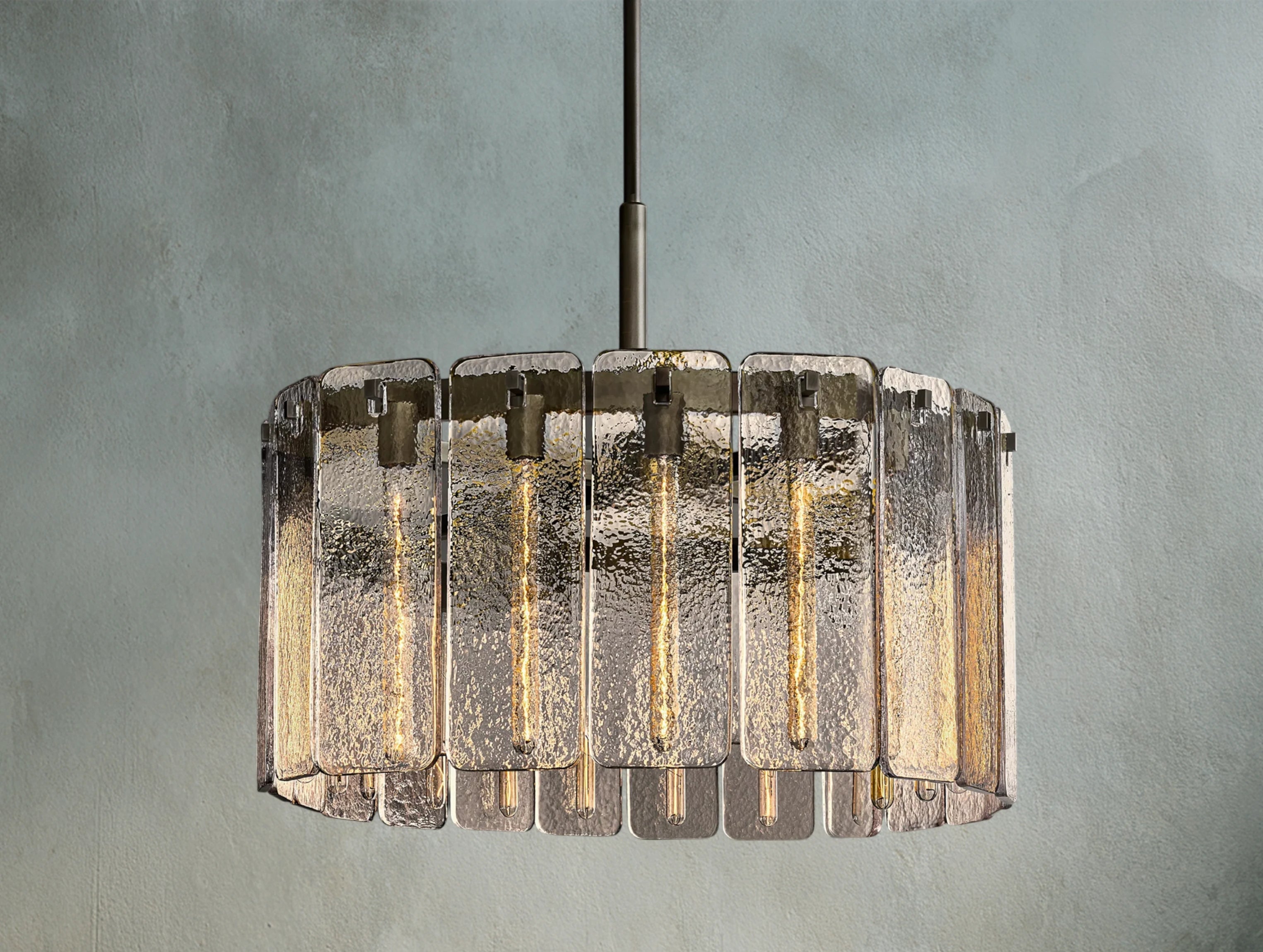 The Karamit glass round chandelier pairs a refined silhouette with panels of restoration-style glass. Each radius-corner panel is cast in a custom mold to create a distinctive rippled texture that gently softens and diffuses the light. Available in 36", 48", and 60", it serves as a dramatic centerpiece for dining rooms, entryways, and living spaces.