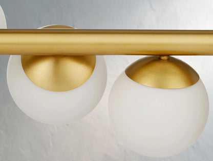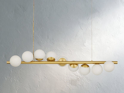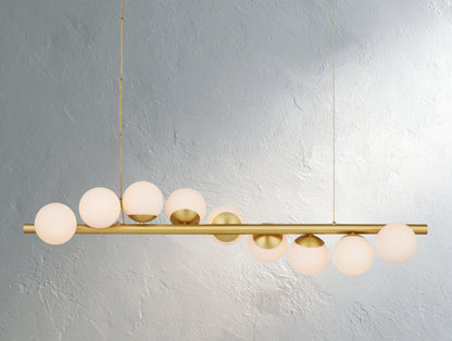 The Kinnor Linear Chandelier turns light into motion with its graceful arrangement of luminous glass globes. Supported by a brushed brass armature, each sphere emits a soft, diffused glow that brings warmth and modern refinement to dining or living spaces. Designed for both balance and fluidity, Kinnor captures the essence of sculptural minimalism while offering a radiant focal point that complements any interior.