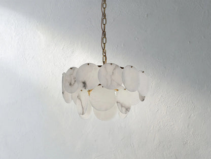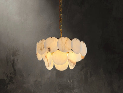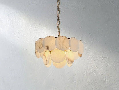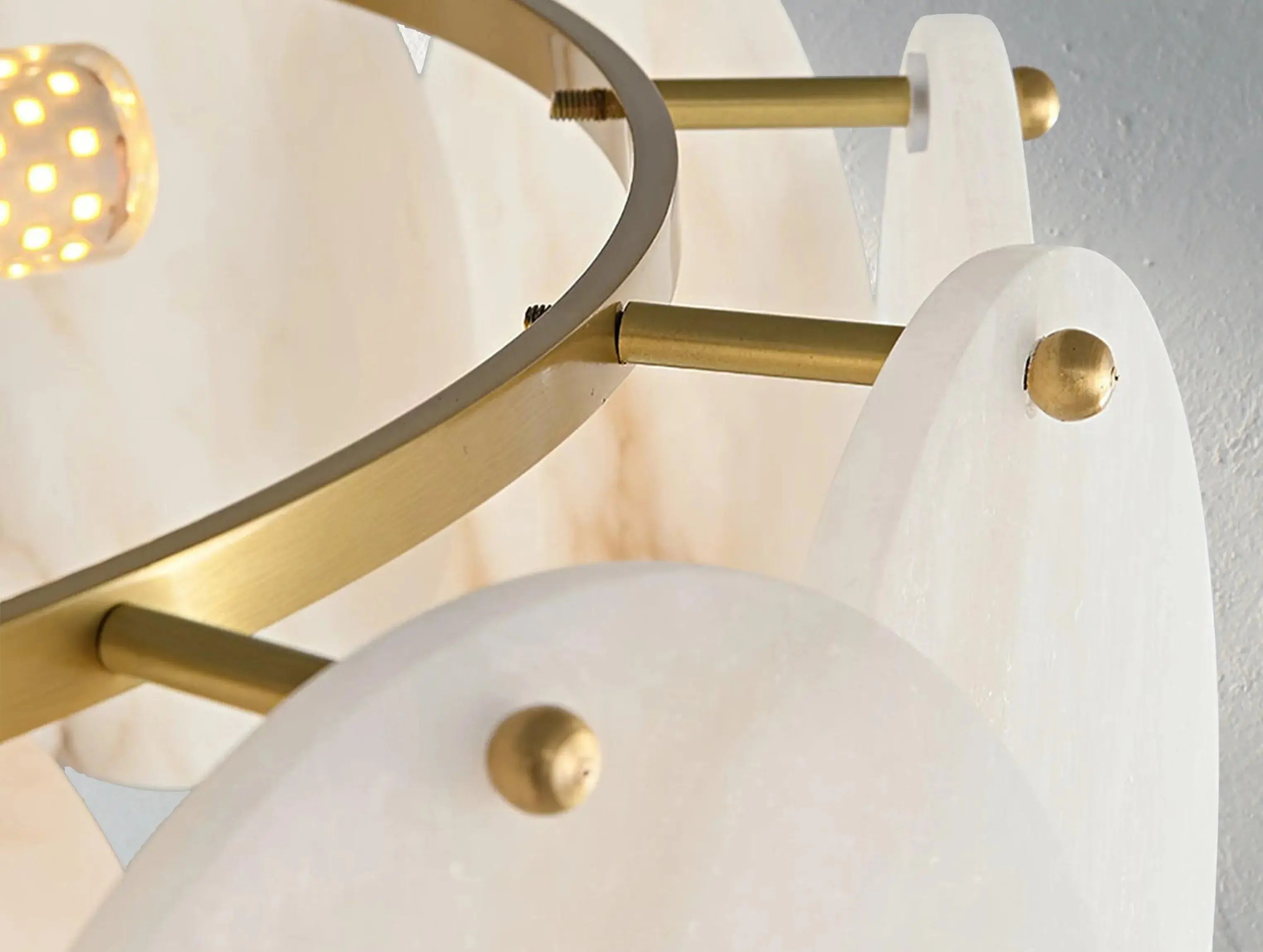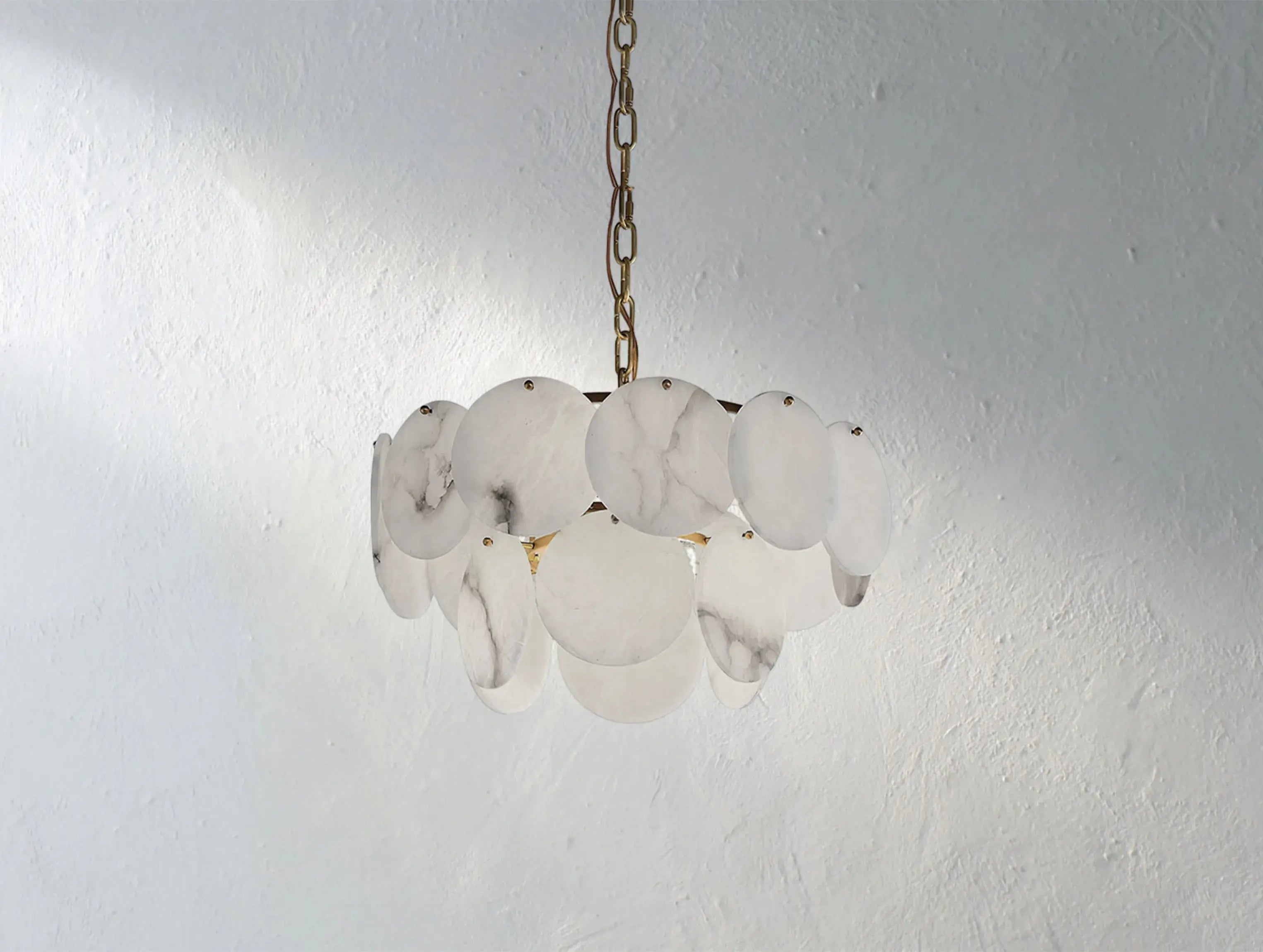 A poetic composition of light and stone. The Lunaria Alabaster Chandelier by Ardenel transforms natural alabaster into a cascade of luminous “shells,” each carefully hand-shaped to soften the glow. Suspended from a warm brass frame, the layered silhouette radiates gentle elegance—whether hung above a dining table or gracing a grand foyer. Available in 2 to 6-tier configurations to suit both intimate and dramatic spaces.
