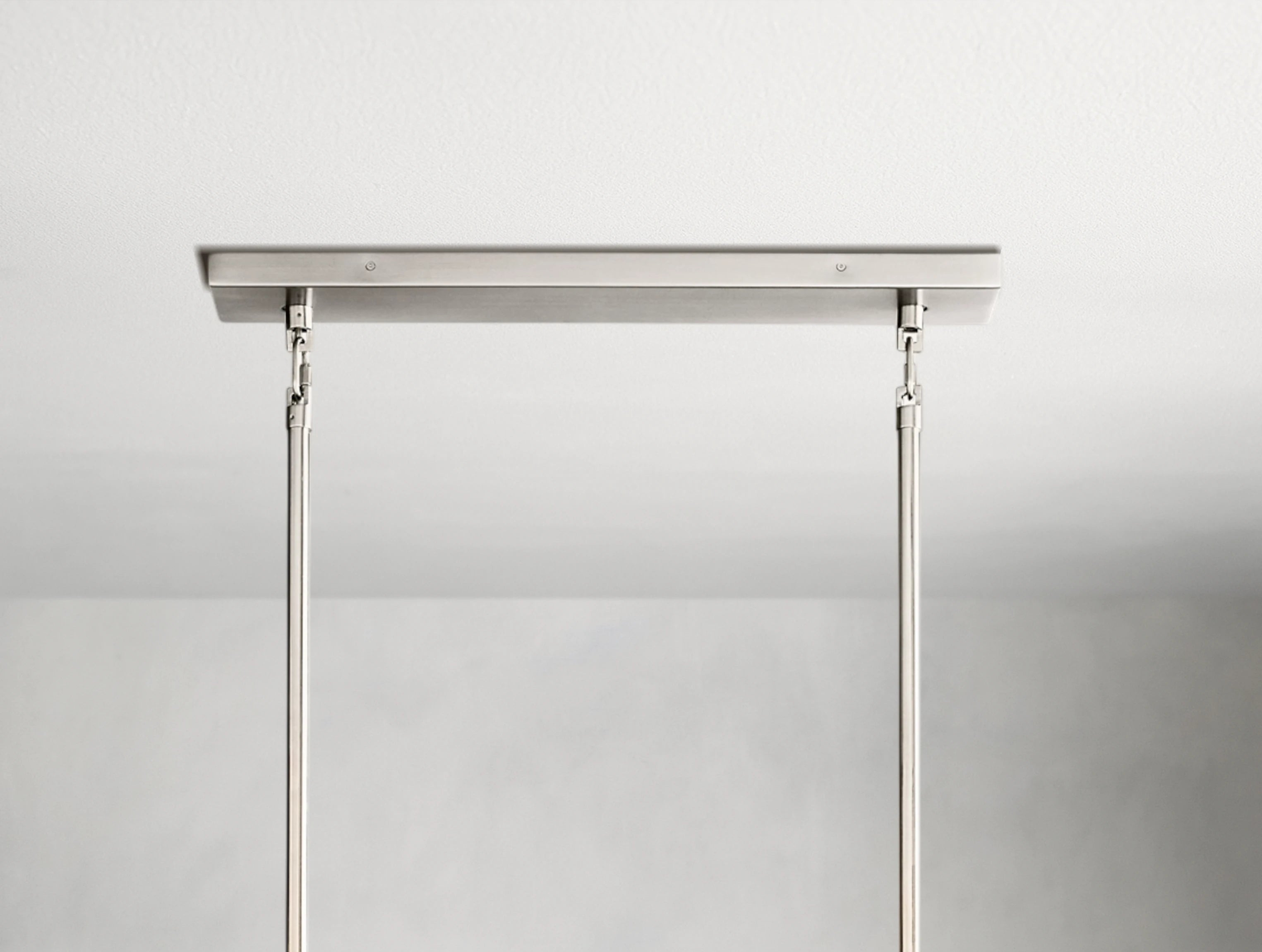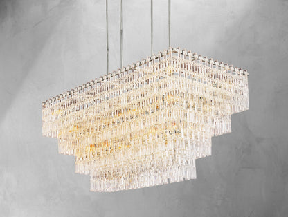 Channeling the strength of industrial chain, this chandelier transforms interlocking crystal links into a radiant cascade of light. Each angular prism is hand-polished and layered to form luminous chains that shimmer without visible wires. The tiered rectangular silhouette creates dramatic presence over long dining tables, kitchen islands, or statement spaces.