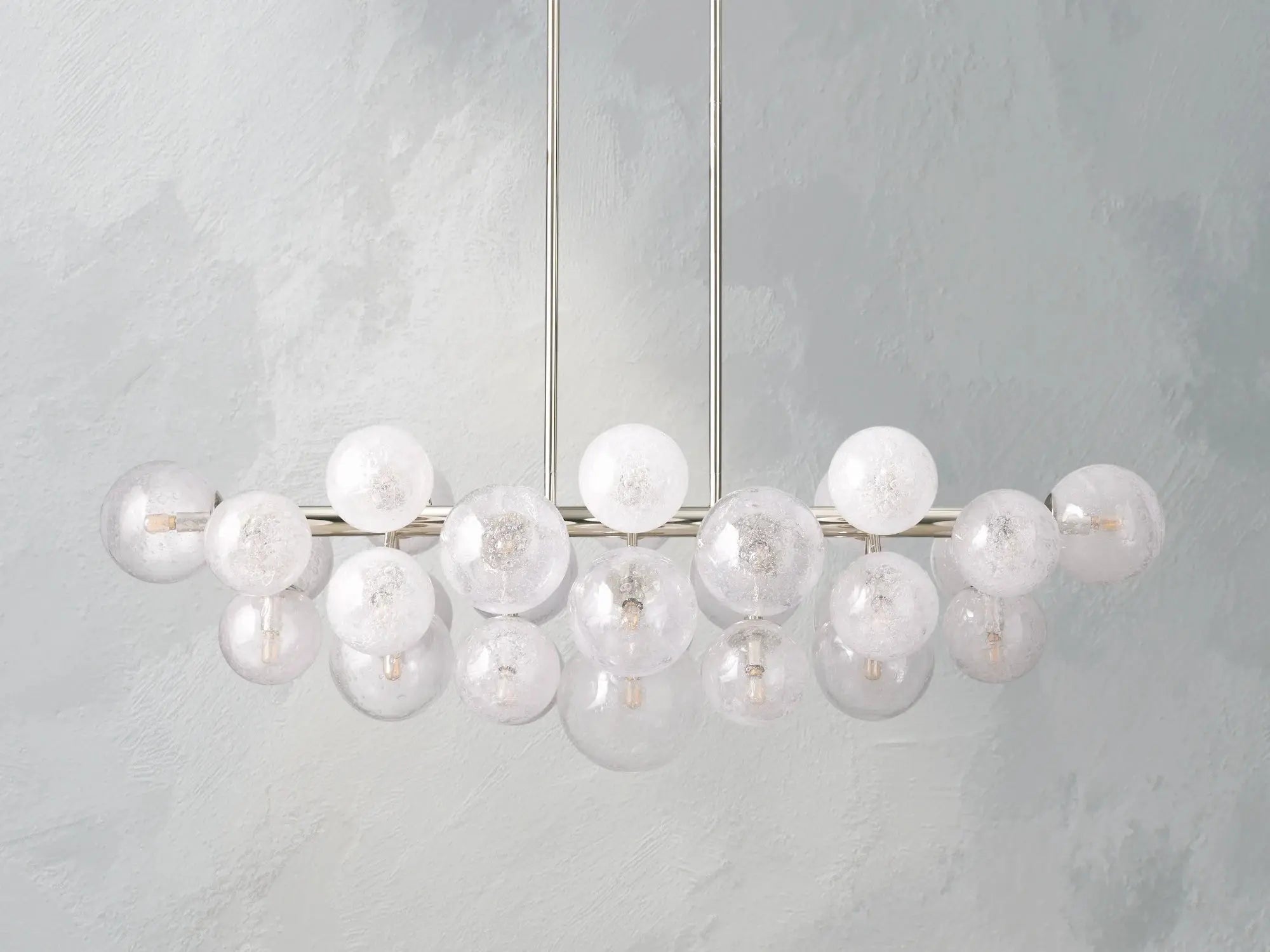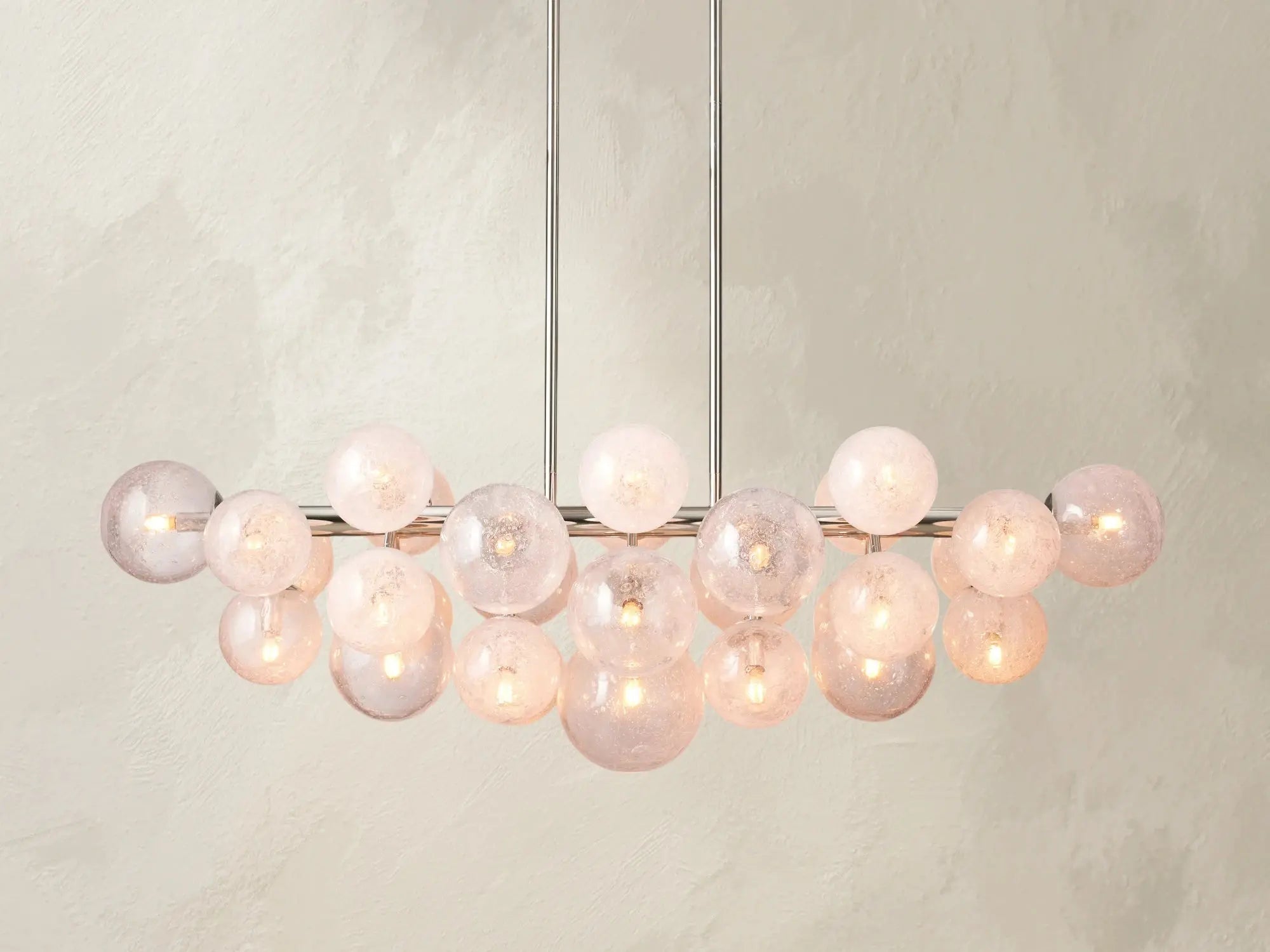 Sculptural and radiant, the Mendoza Linear Chandelier features 31 hand-blown bubbled glass globes aligned in a linear silhouette. Suspended from a sleek industrial frame, each globe sparkles with individuality—casting a warm, multidirectional glow ideal for dining rooms and grand interiors.