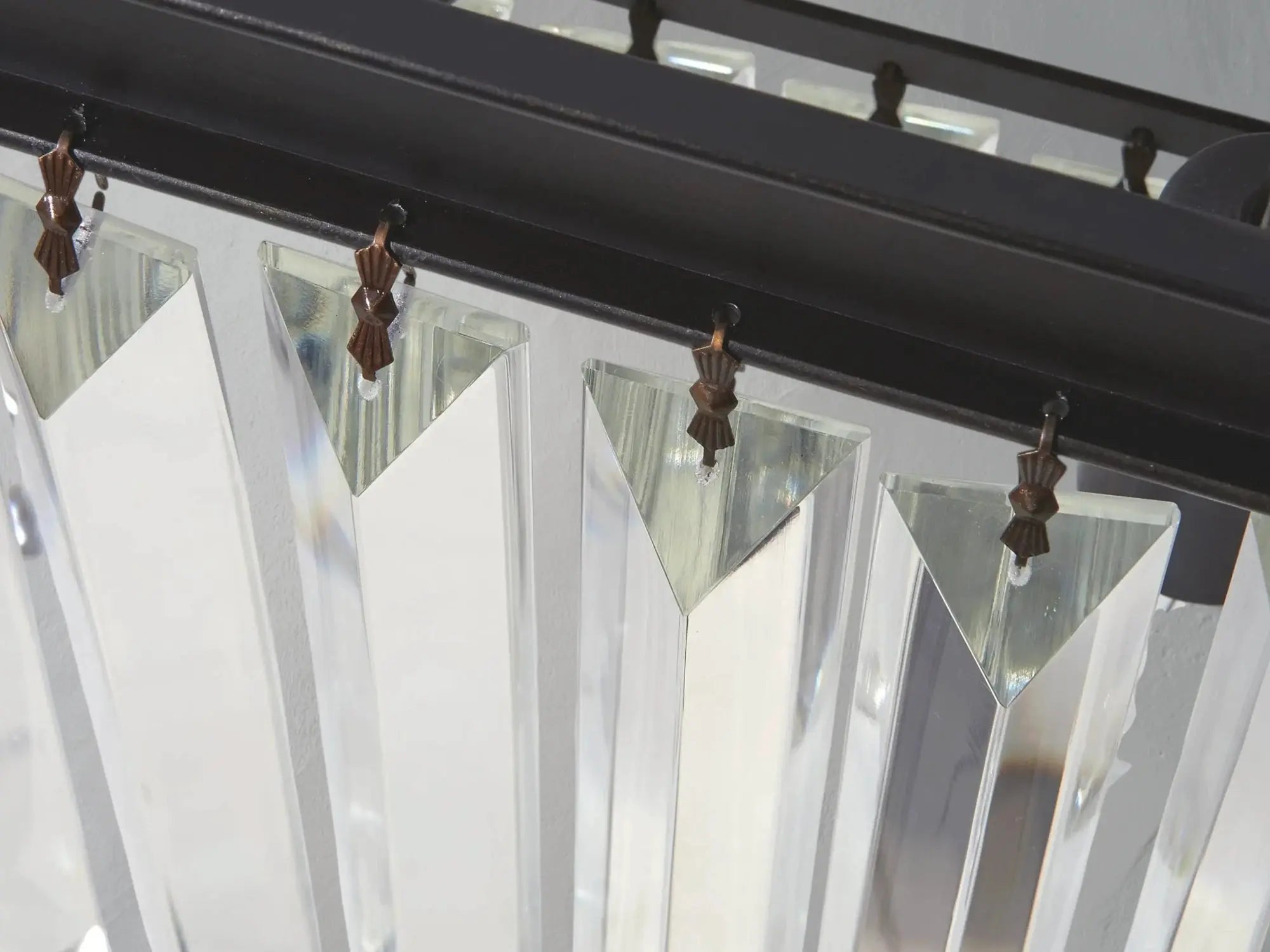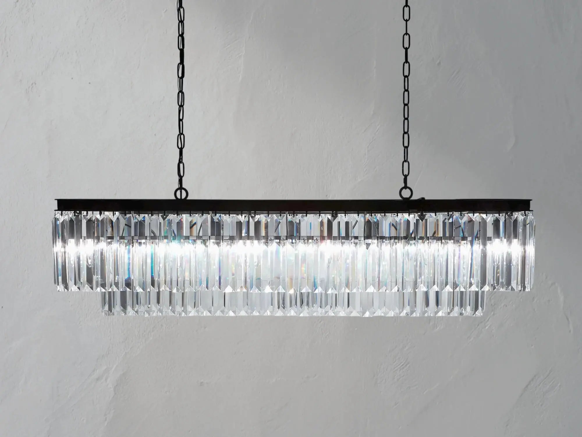 Layered in opulence, the Molyland Tiered Rectangular Chandelier draws inspiration from 1920s French Art Deco with cascading rows of faceted K9 crystals. Set in an oil-rubbed iron frame and suspended by twin chains, this fixture adds grandeur and glow to large dining rooms or formal spaces. Includes twelve E12 bulbs and is compatible with vaulted ceilings.