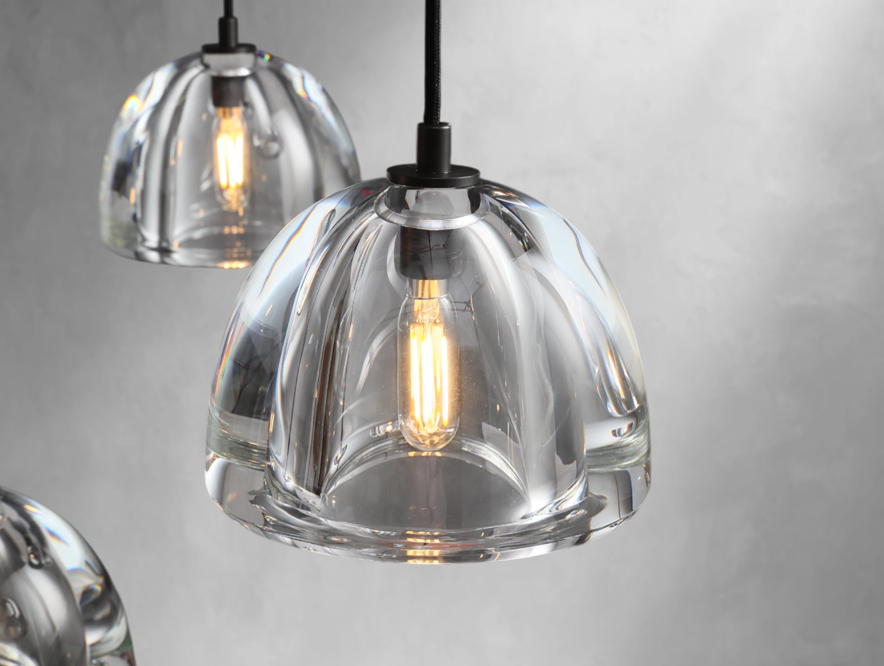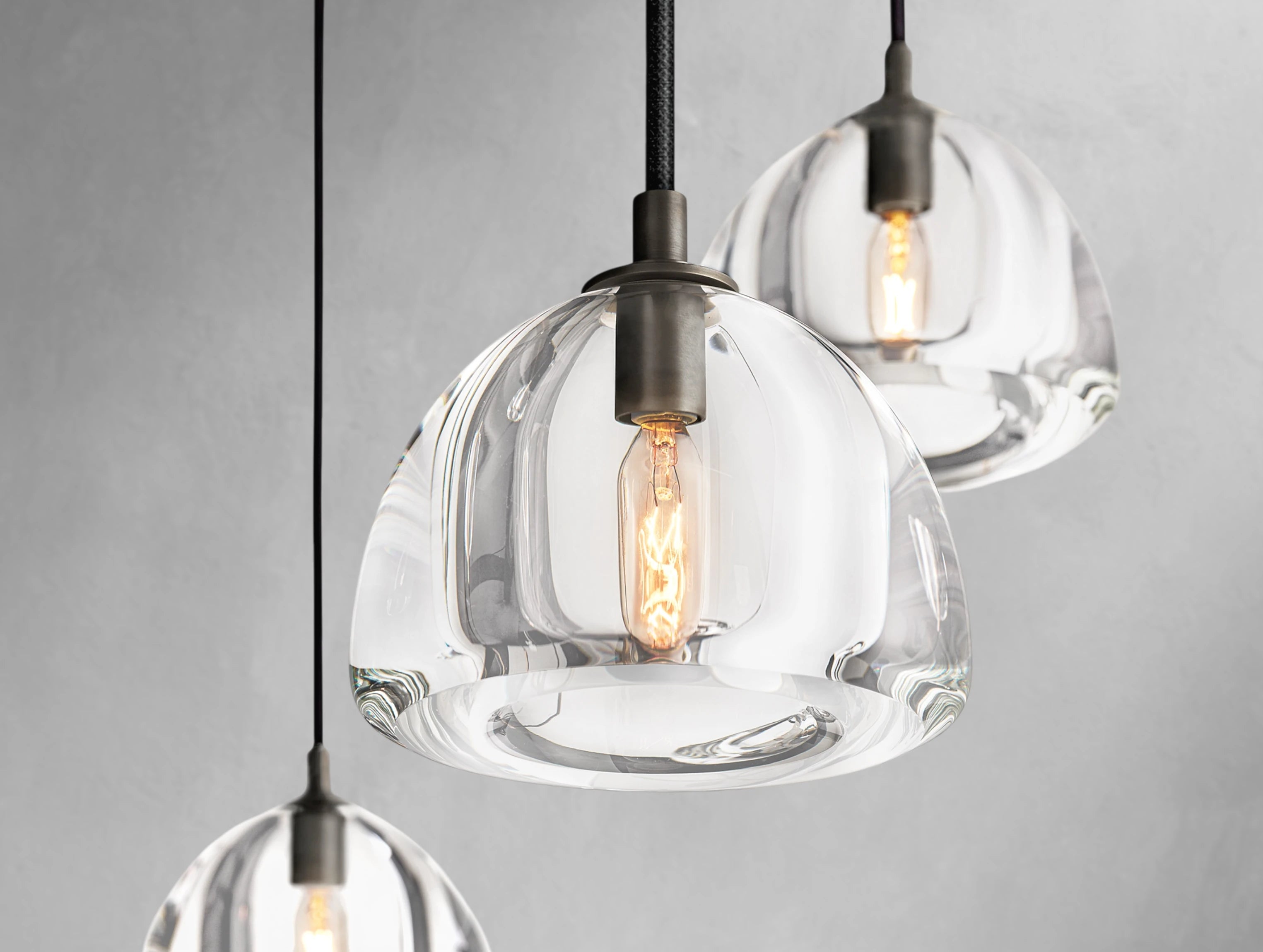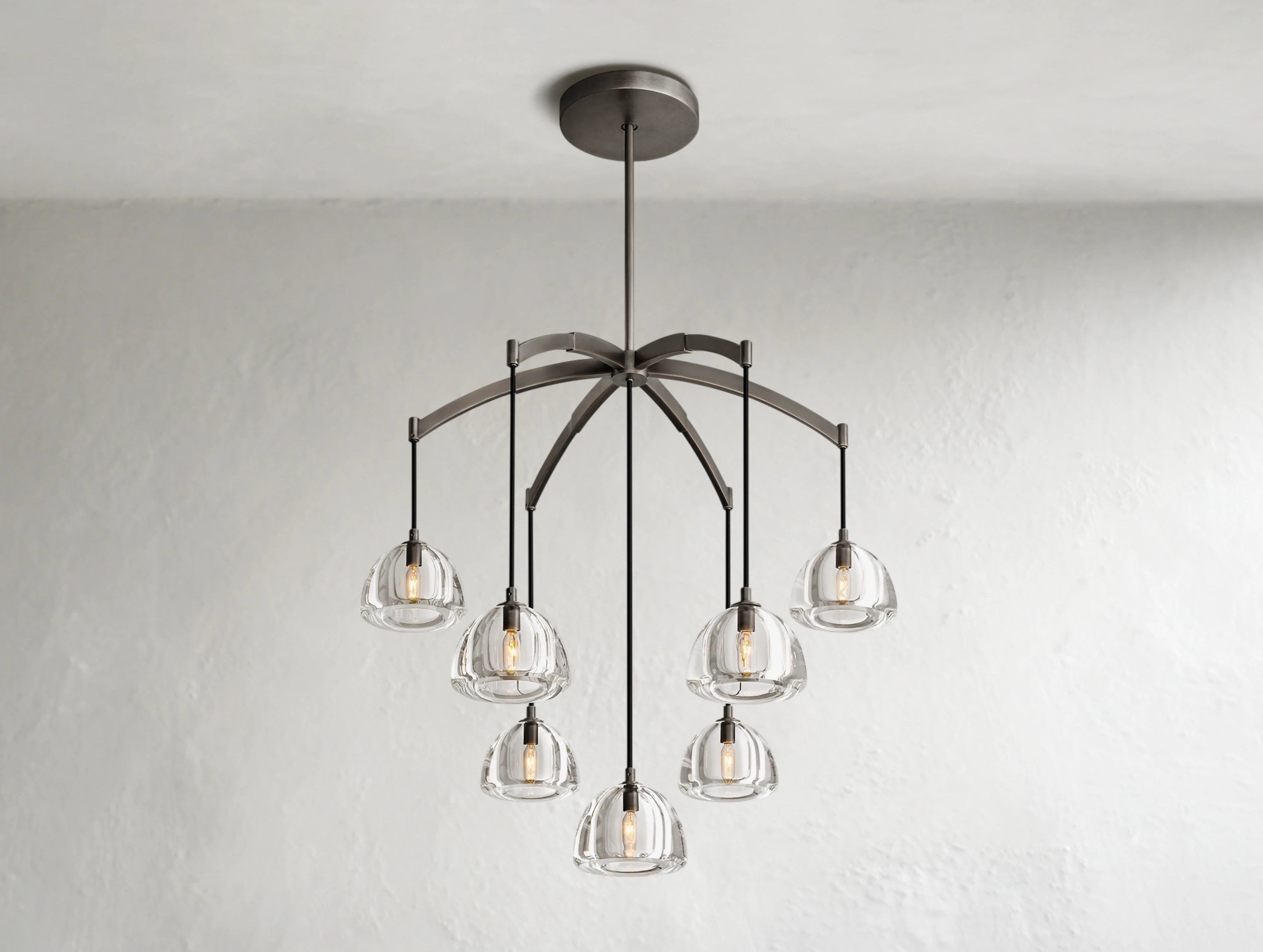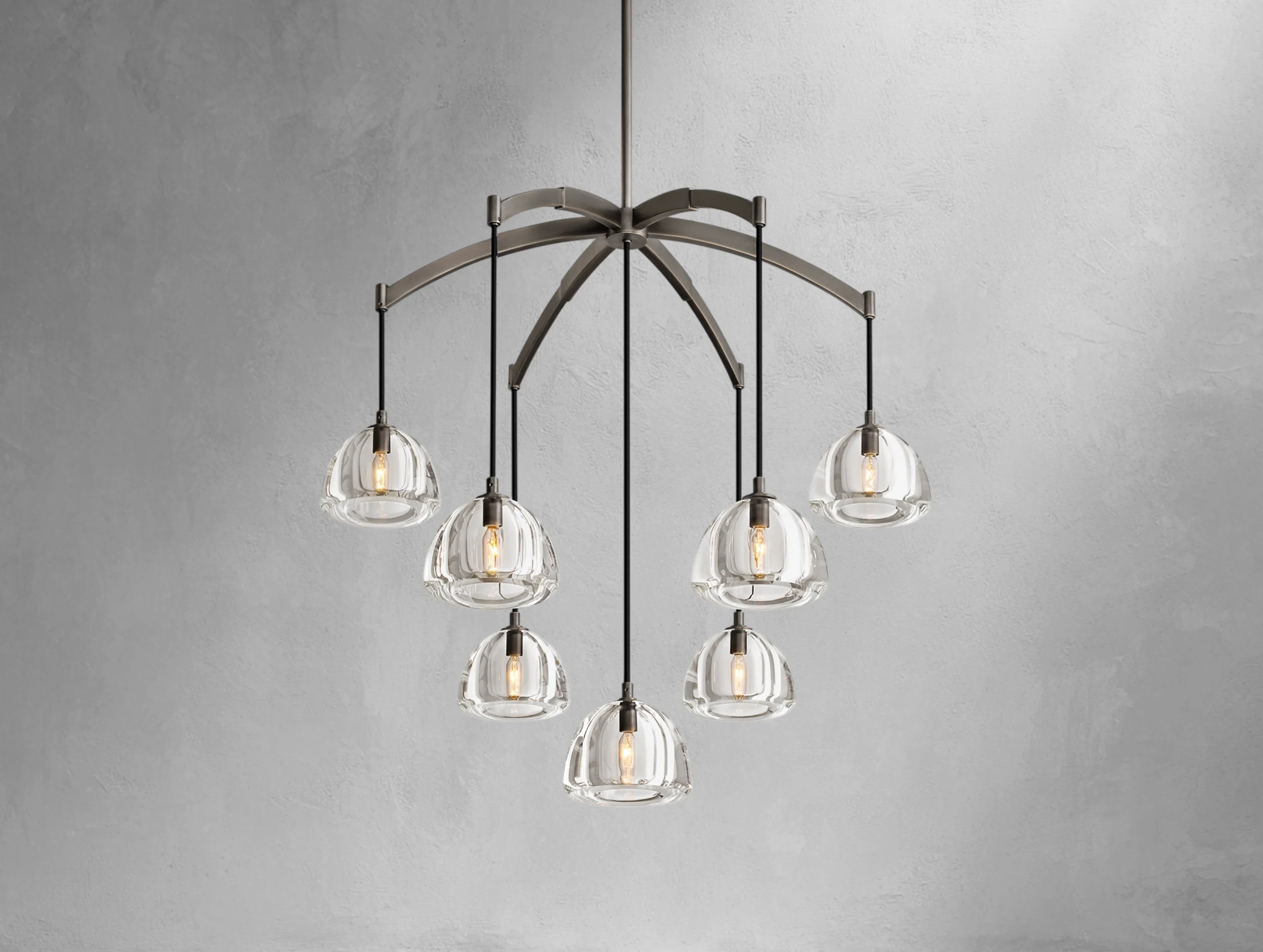 Crafted from solid crystal and polished by hand over several days, the Mushcloud Round Chandelier celebrates the sculptural beauty of light. Each 1½"-thick dome shade is carved from a single block of K9 crystal, then lathe-turned, ground, and hand-polished to a radiant finish. Suspended from a brass frame, the heavy glass forms create visual tension with the delicately arcing silhouette—resulting in a piece that feels both grounded and ethereal. Available in three sizes.
