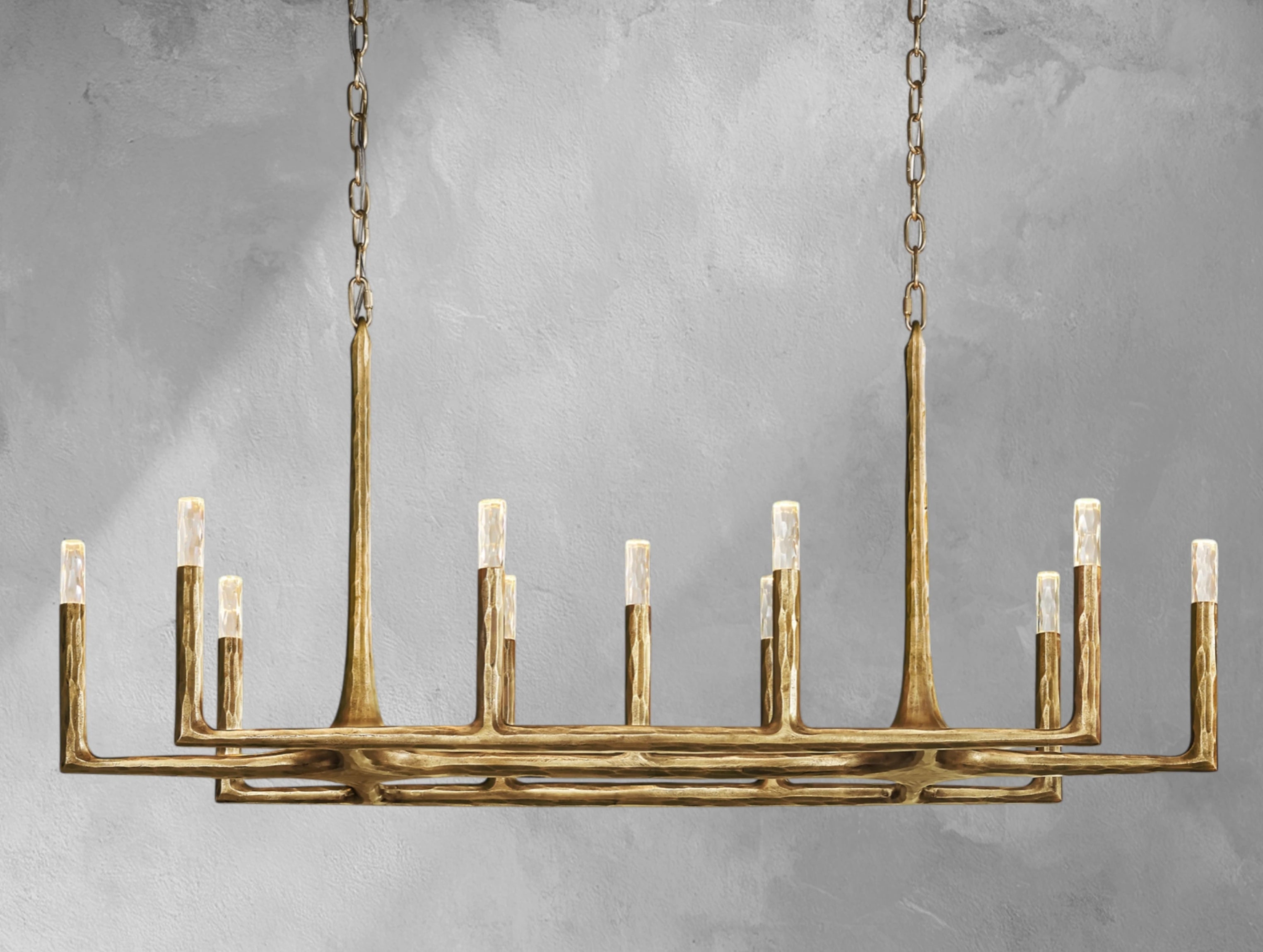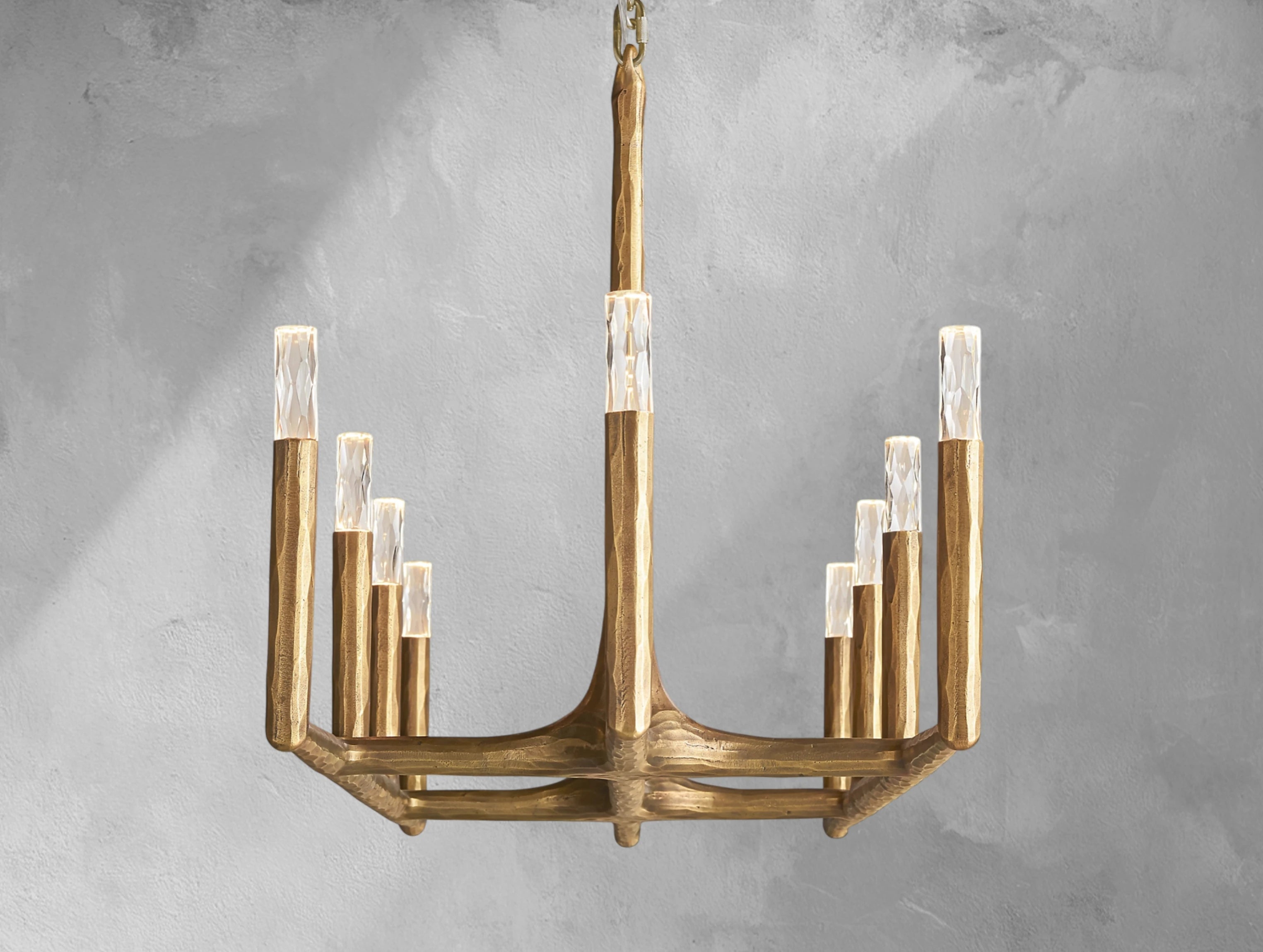 Inspired by the sculptural works of Dalí and Giacometti, this chandelier celebrates the raw beauty of hand-forged metal. Using an ancient hammering process, artisans shape solid brass or steel into slender, tapered bars with an organic, imperfect texture. Cast glass shades echo the hammered finish, creating a luminous interplay of light and shadow. Each piece is unique, a testament to its handcrafted artistry.